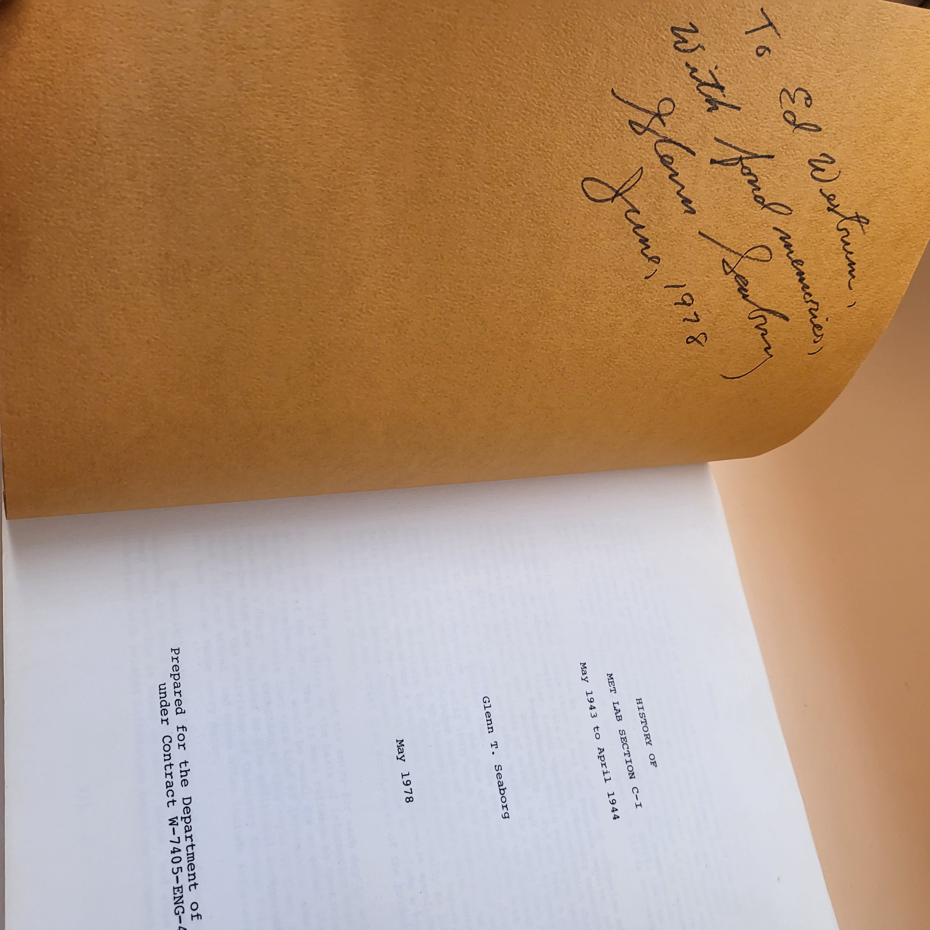 Signed and inscribed from Glenn T. Seaborg to colleague Edgar F. Westrum, who worked on project C-1 of the Manhattan Project alongside Seaborg, Enrico Fermi, James Franck, Eugene Wigner, and others. References to Westrum directly throughout the publication are tabbed with sticky notes. An interesting historical piece autographed by Seaborg, who was the principal or co-discoverer of ten different chemical elements, one of which, Seaborgium, was named in his honor. This is a thick, nearly 600 page history.