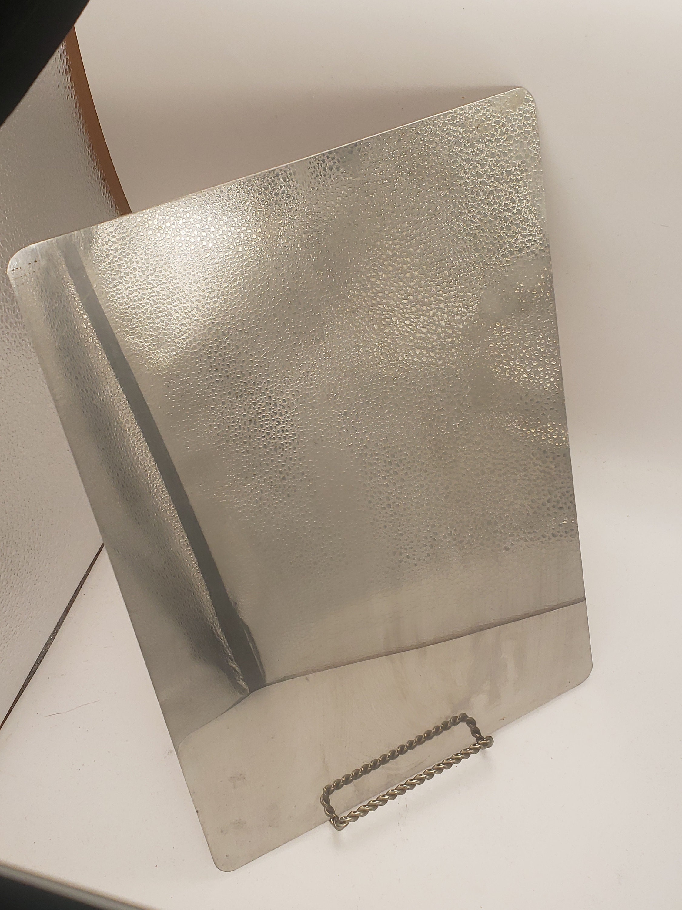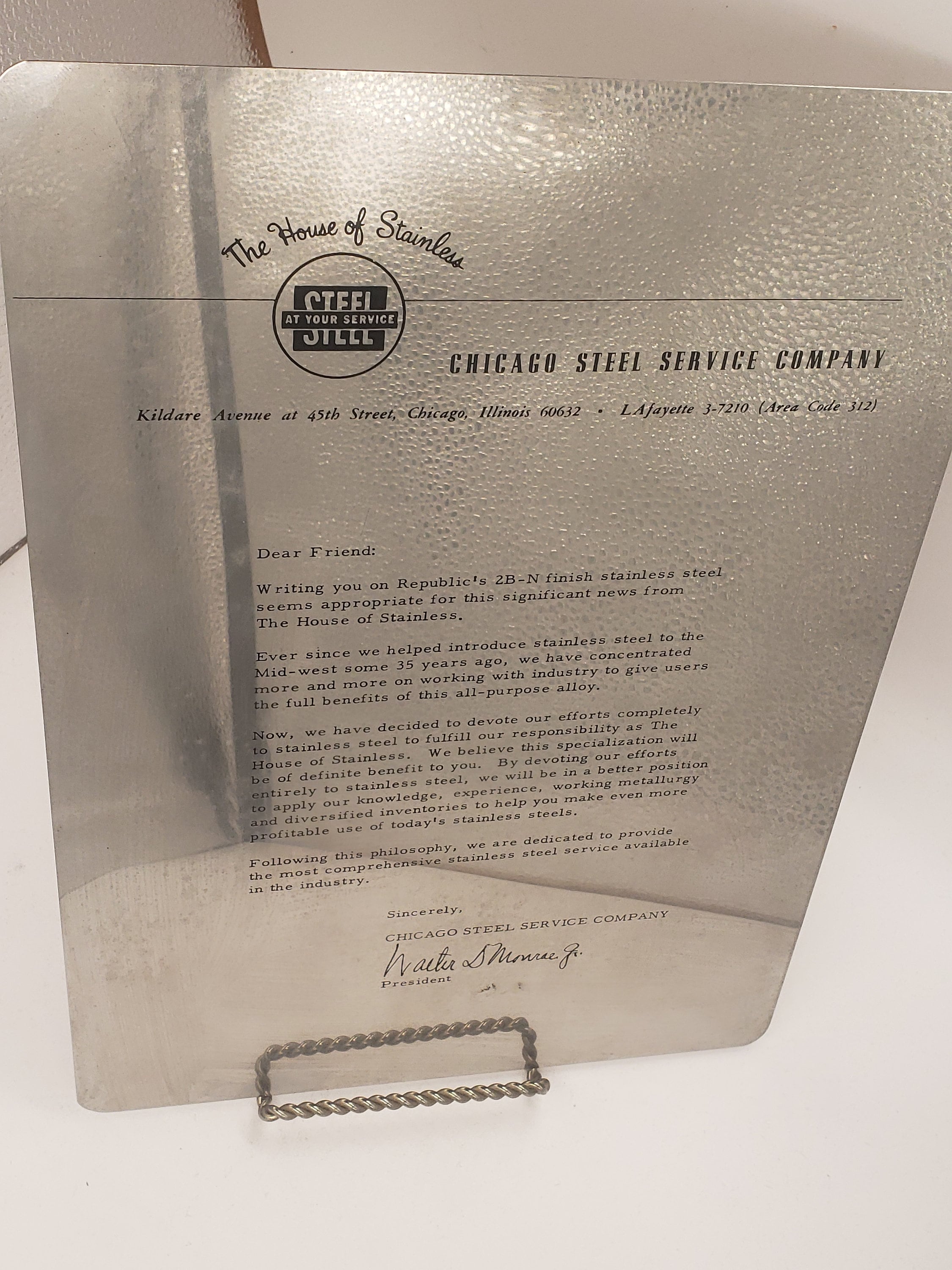 This is a very unique item, a letter sent out in the 1950s by the Chicago Steel Service Company printed on a stainless steel plate, Republic's 2B-N finish to be exact, according to the letter, from the president of the company, Walter S Monroe Jr.