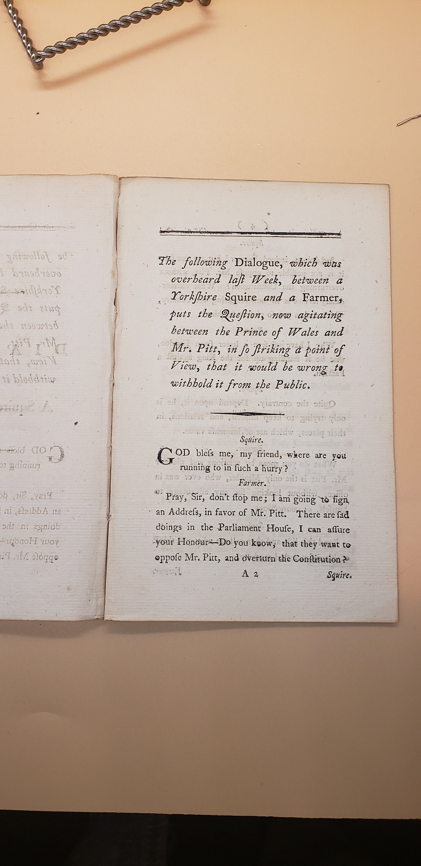 The following dialogue, which was overhead last week, between a Yorkshire squire and a farmer, puts the question, now agitating between the Prince of Wales and Mr. Pitt, in so striking a point of view, that it would be wrong to withhold it from the public'.