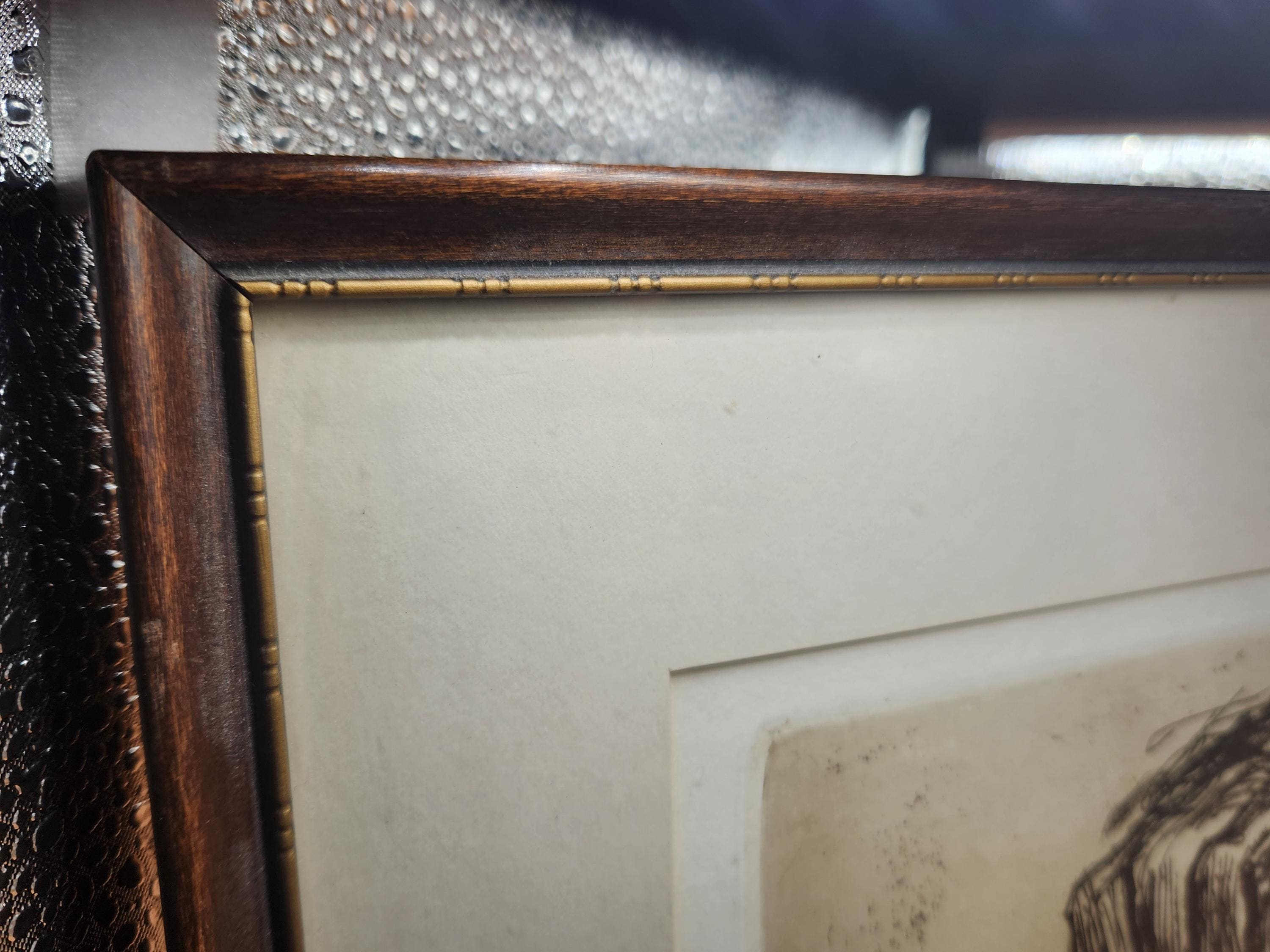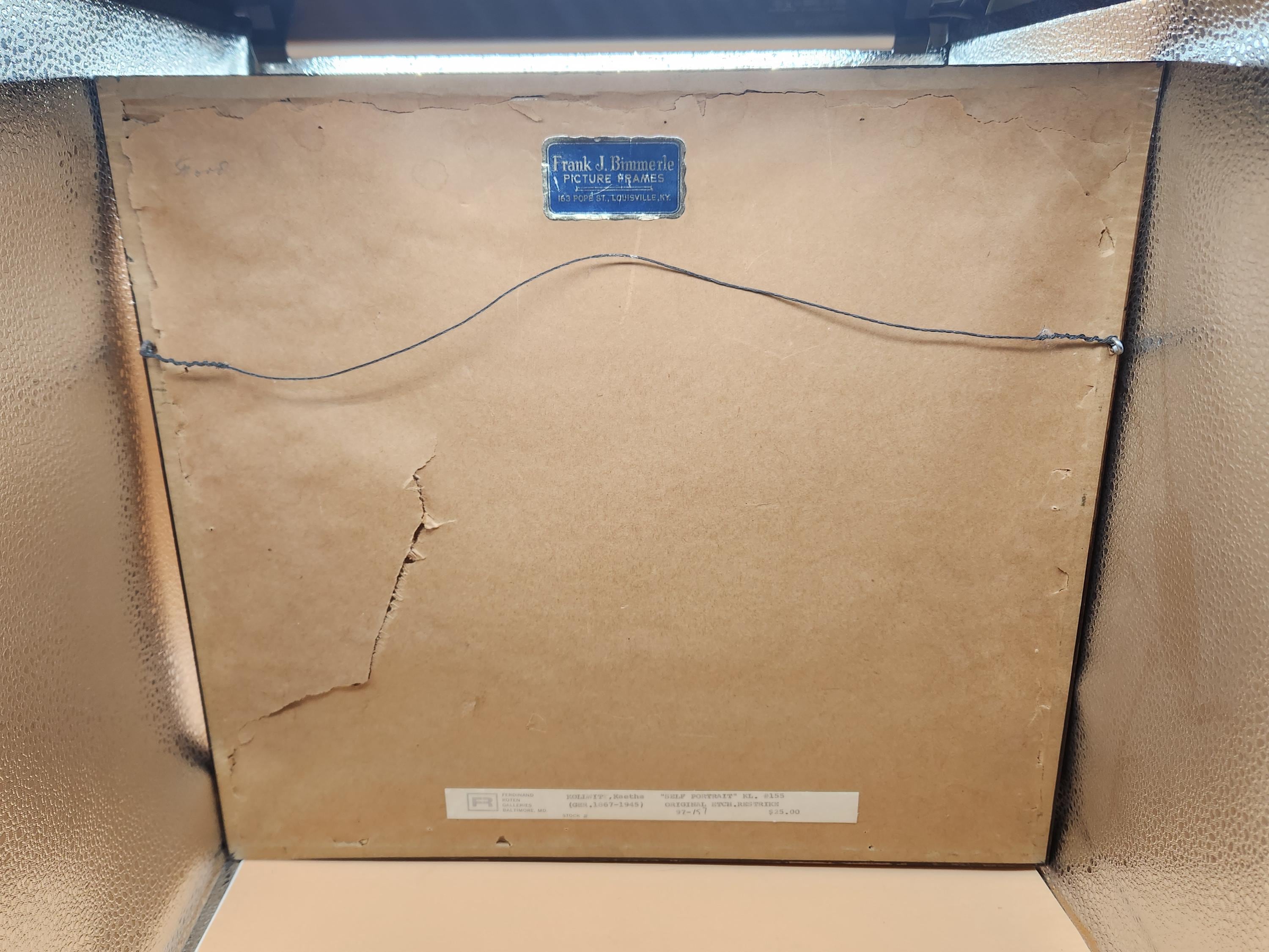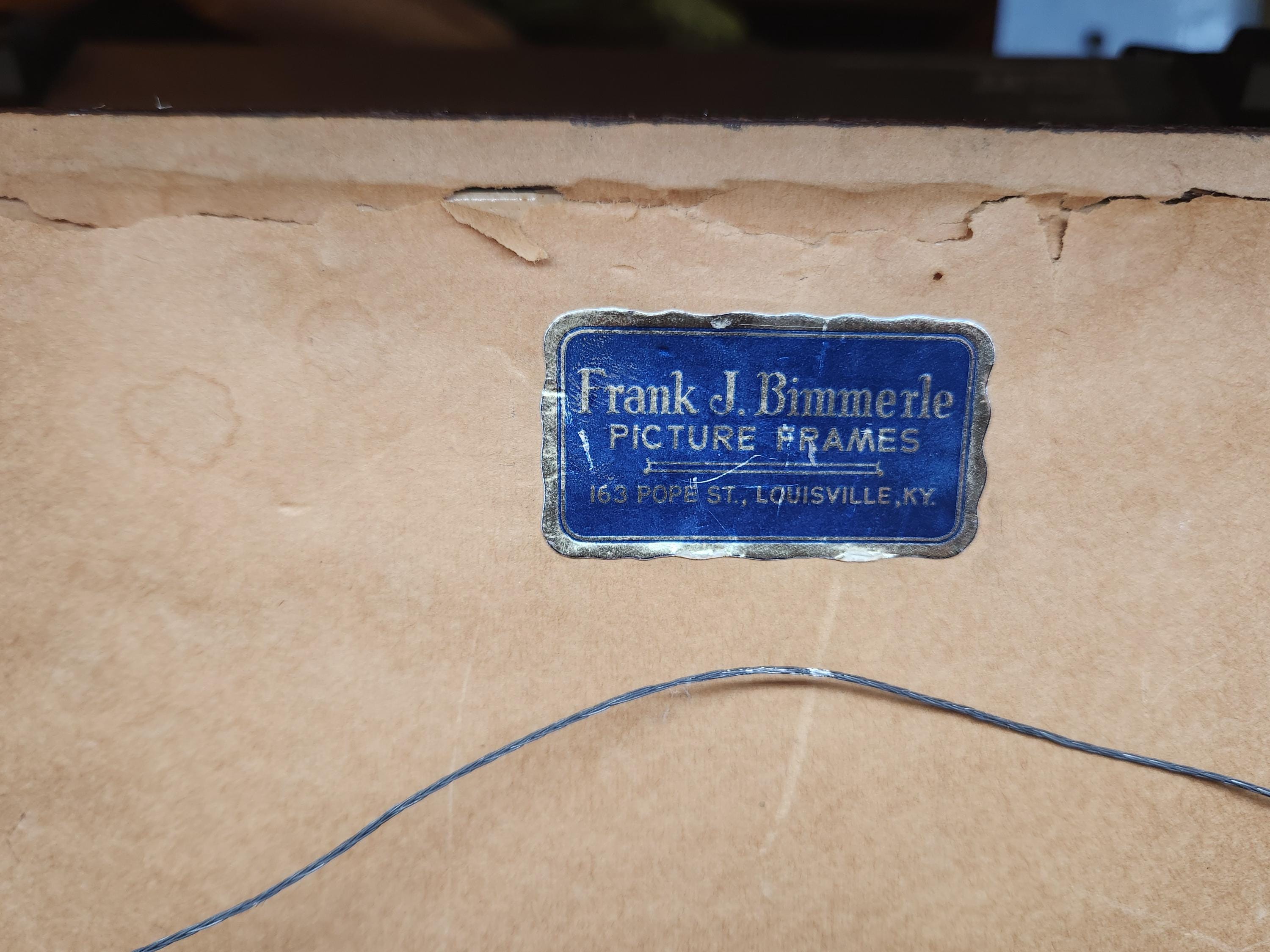 Professionally framed by Frank J. Bimmerle of Louisville, KY, this artwork is presented in a dark wood frame with elegant gilded trim, enhancing its timeless appeal. The framed dimensions are 16" wide by 14.5" high, with a matted area measuring 11.25" wide by 9.25" high.
