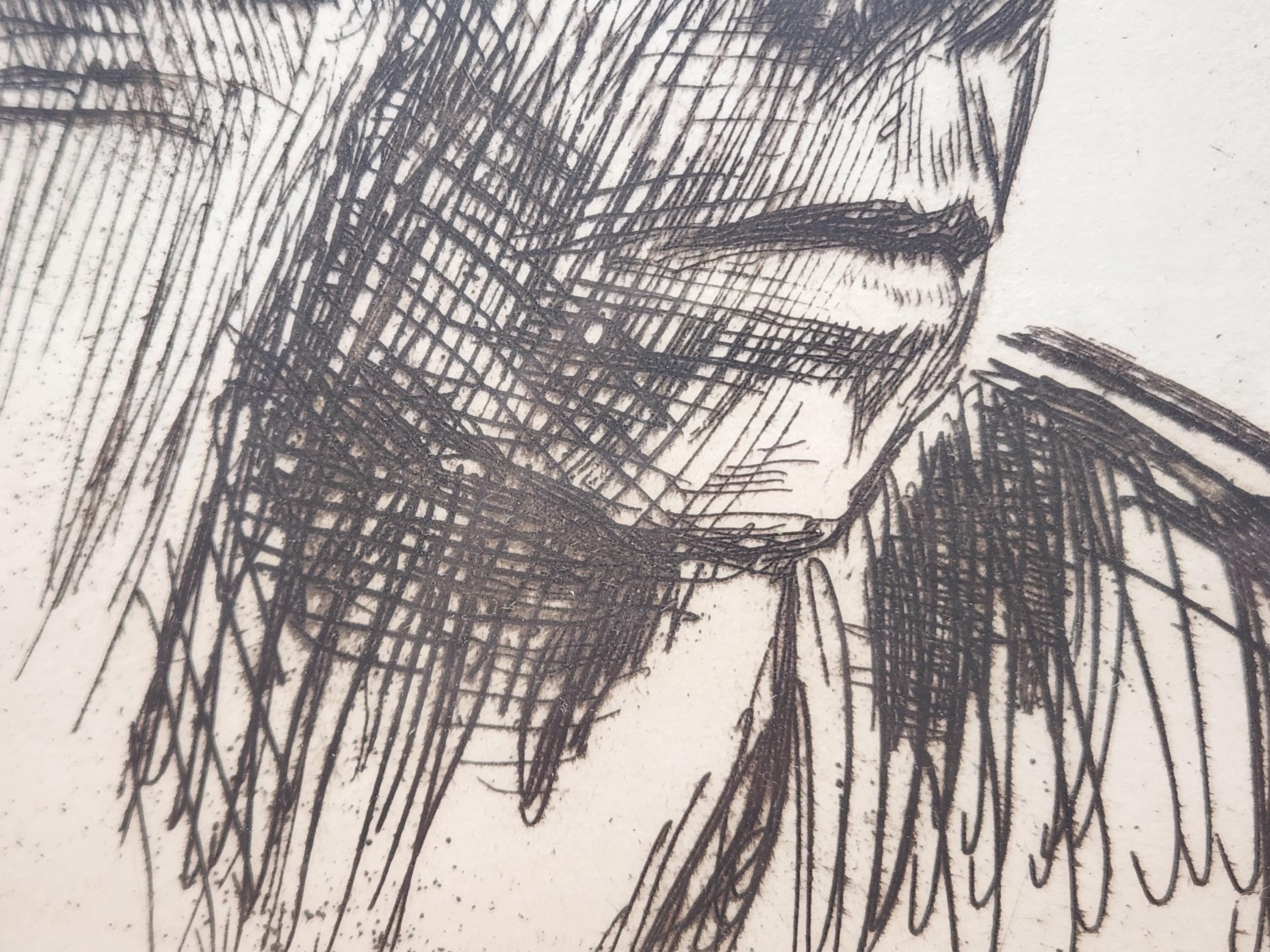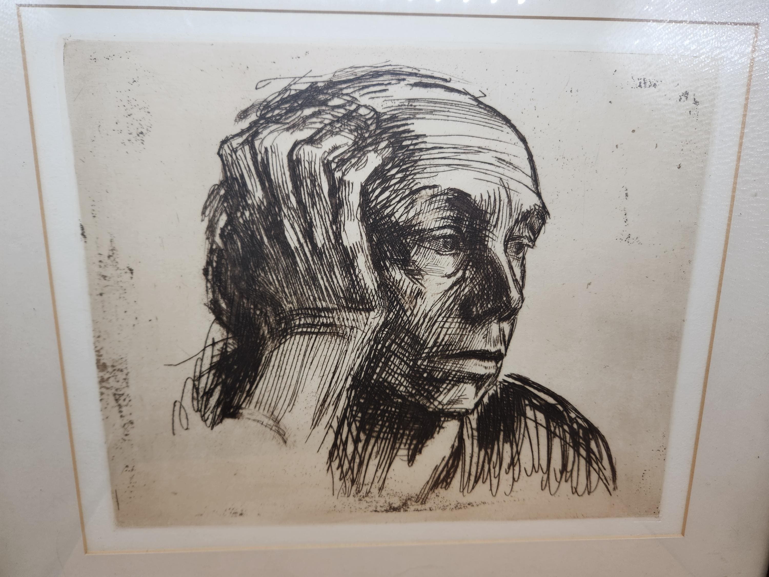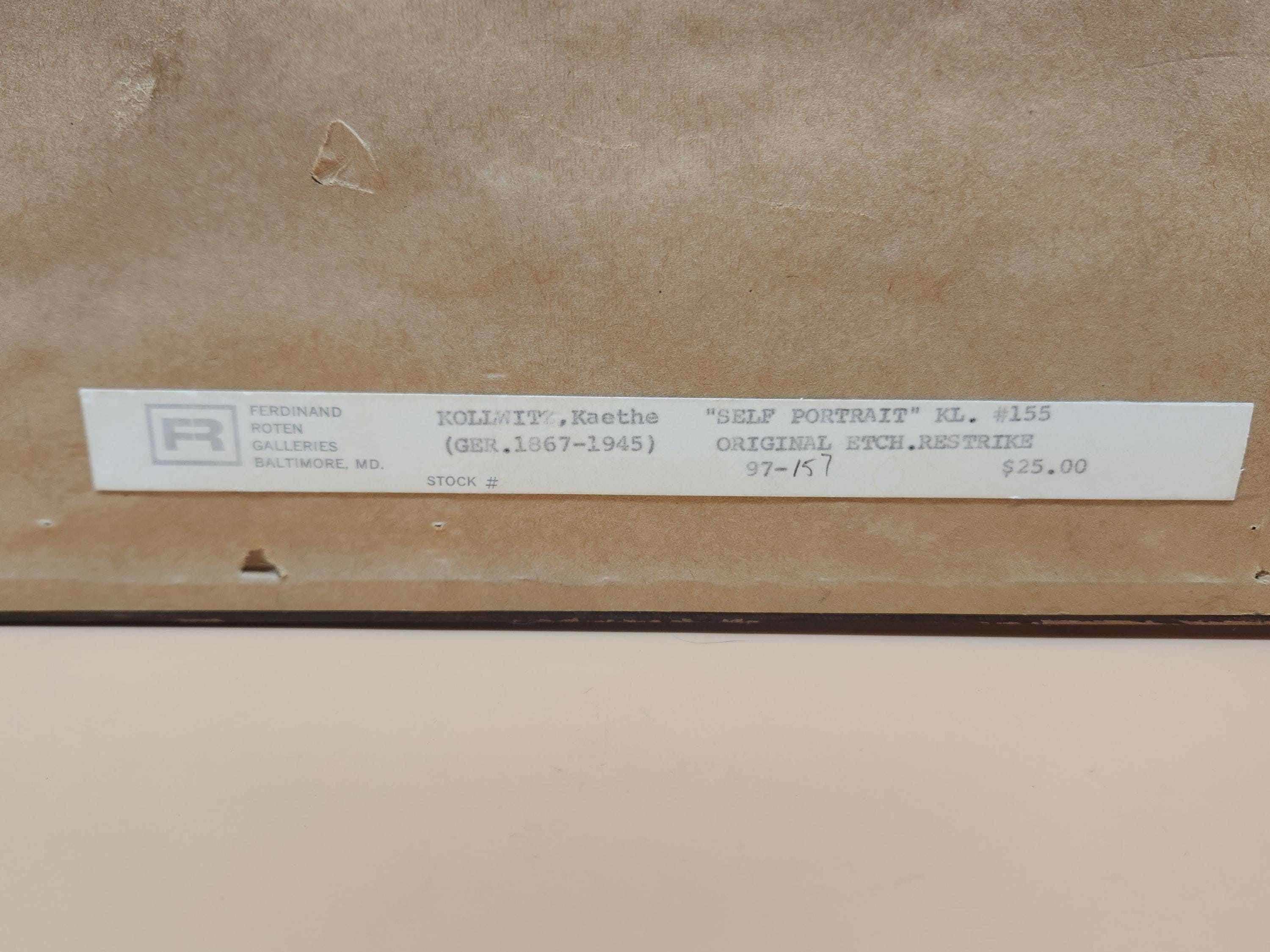 Immerse yourself in the profound artistry of Käthe Kollwitz with this exceptional 1921 Self-Portrait Etching, an original restrike dating from approximately 1948. This piece, a very rich impression with superb plate tone, is printed in dark Bistre ink, showcasing Kollwitz's signature intensity and emotional depth. Recognized as one of her greatest self-portraits, it holds significant art historical value, referenced as Klipstein 155 and Von Knesebeck 171. This particular restrike bears the distinct Von De Becke Blind Stamp and a Blind Stamp from Muenchen22, confirming its authenticity as the latest restrike of the original etching. For further reference, consult Klipstein or Von Knesebeck catalogs.