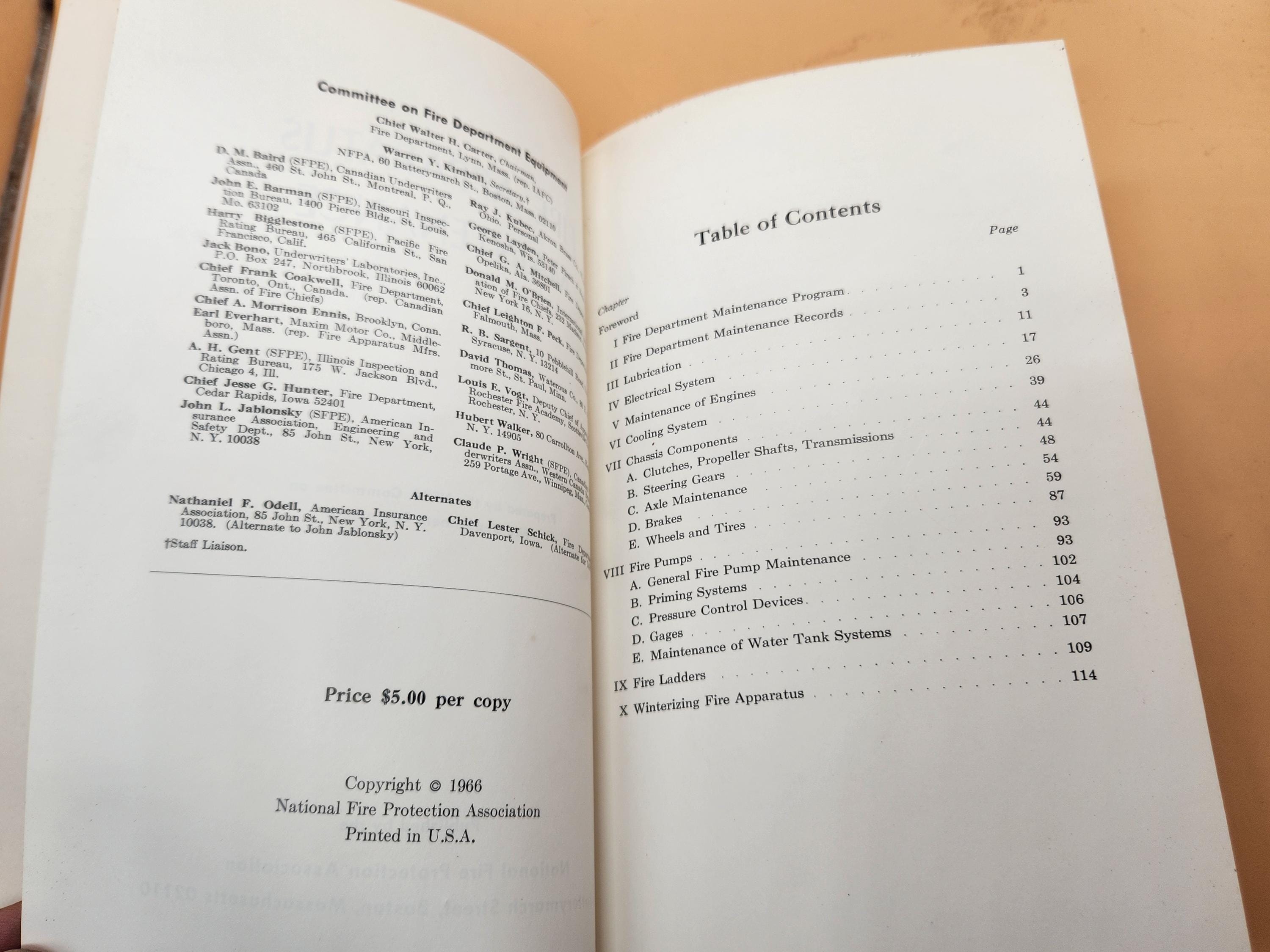 Fire Apparatus Maintenance, National Fire Protection Association, Scarce red cloth hardcover book published in 1966 by the NFPA. This copy in VG condition, internally clean, except a previous owner's name is written on rear pastedown.