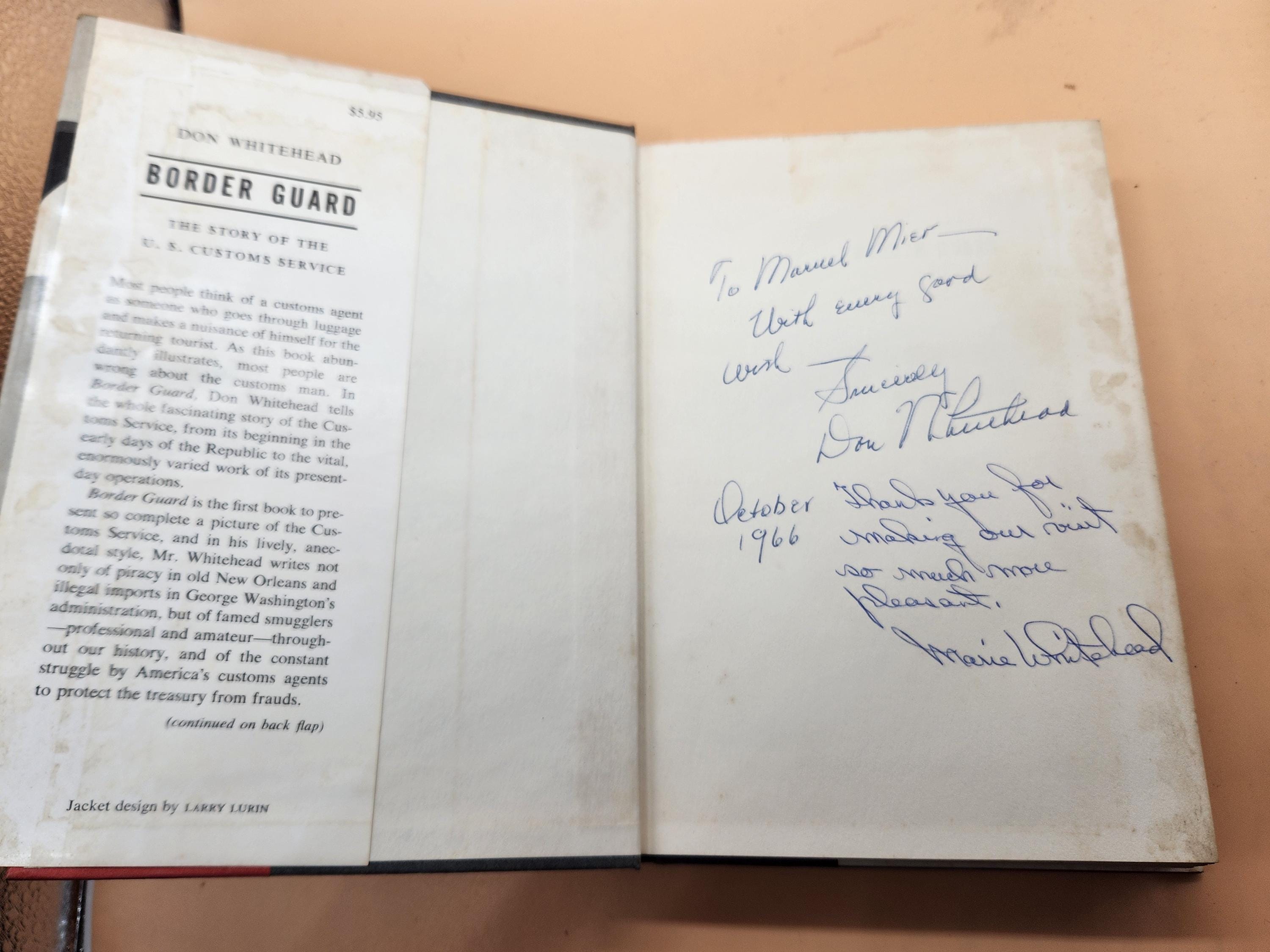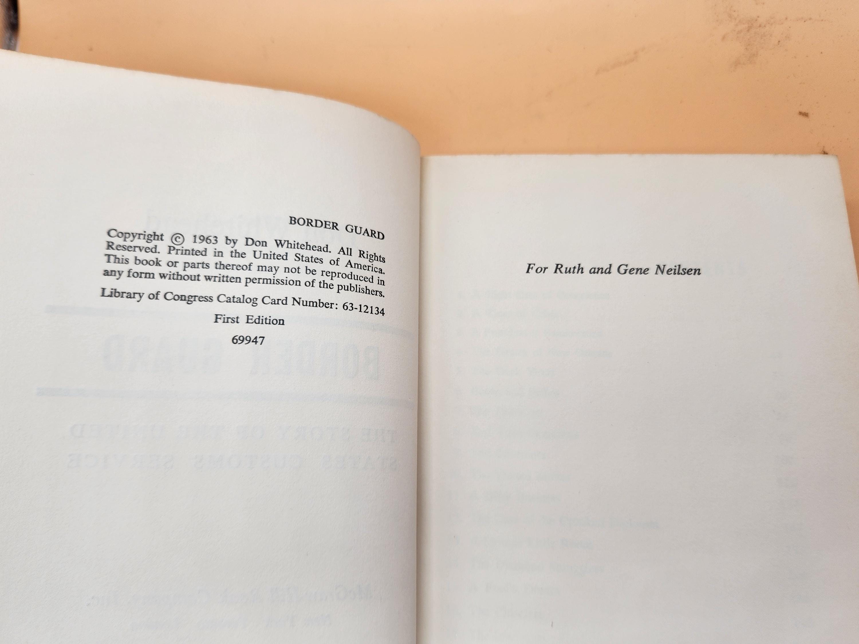 Border Guard: The Story of the United States Customs Service by Don Whitehead. First Edition in dust jacket, personally inscribed and autographed by author and Pulitzer Prize winning journalist Don Whitehead, as well as an inscription and signature from his wife, which is interesting! Average good condition for its age. Hardcover, McGraw-Hill Book Company, 1963