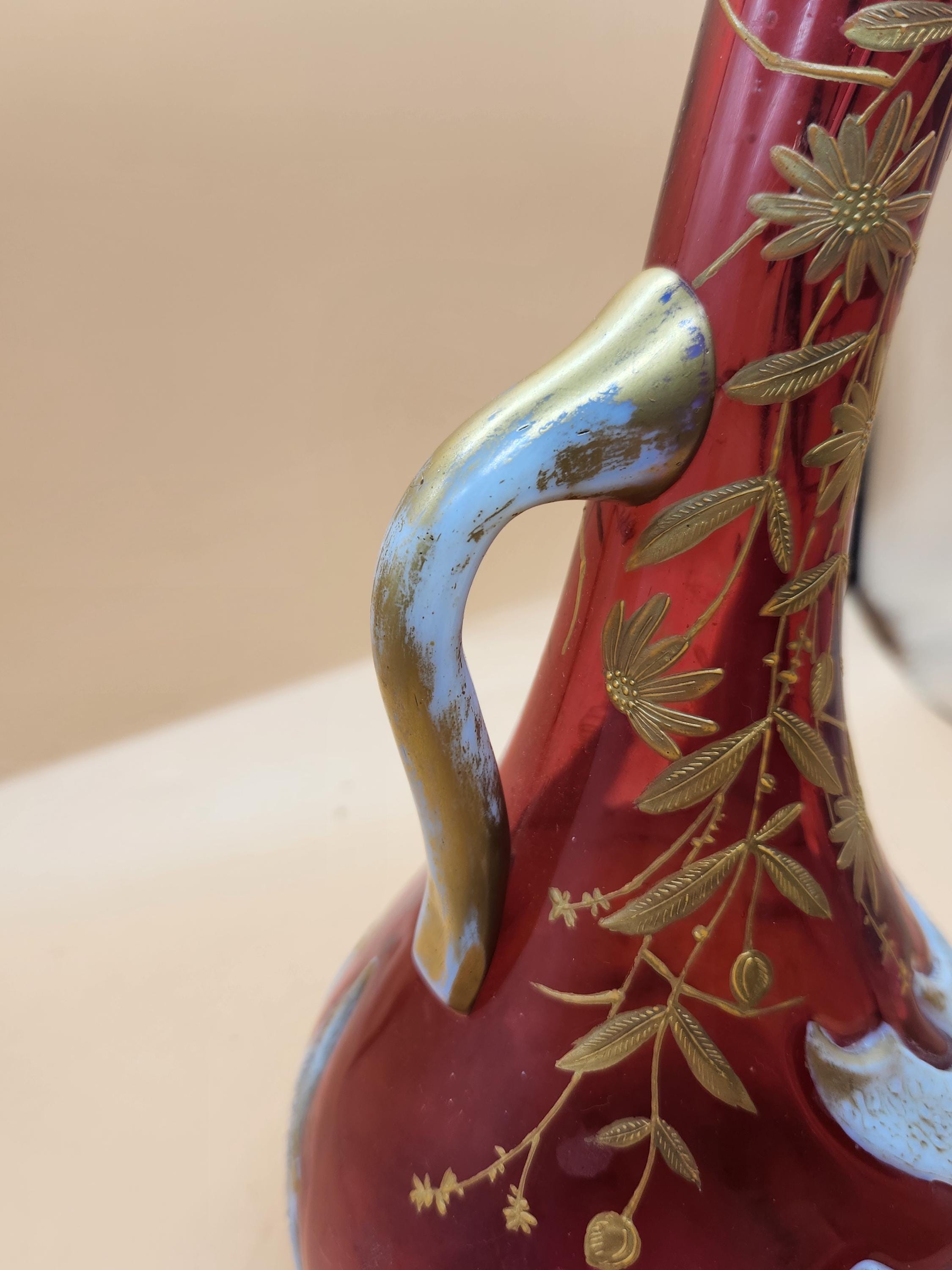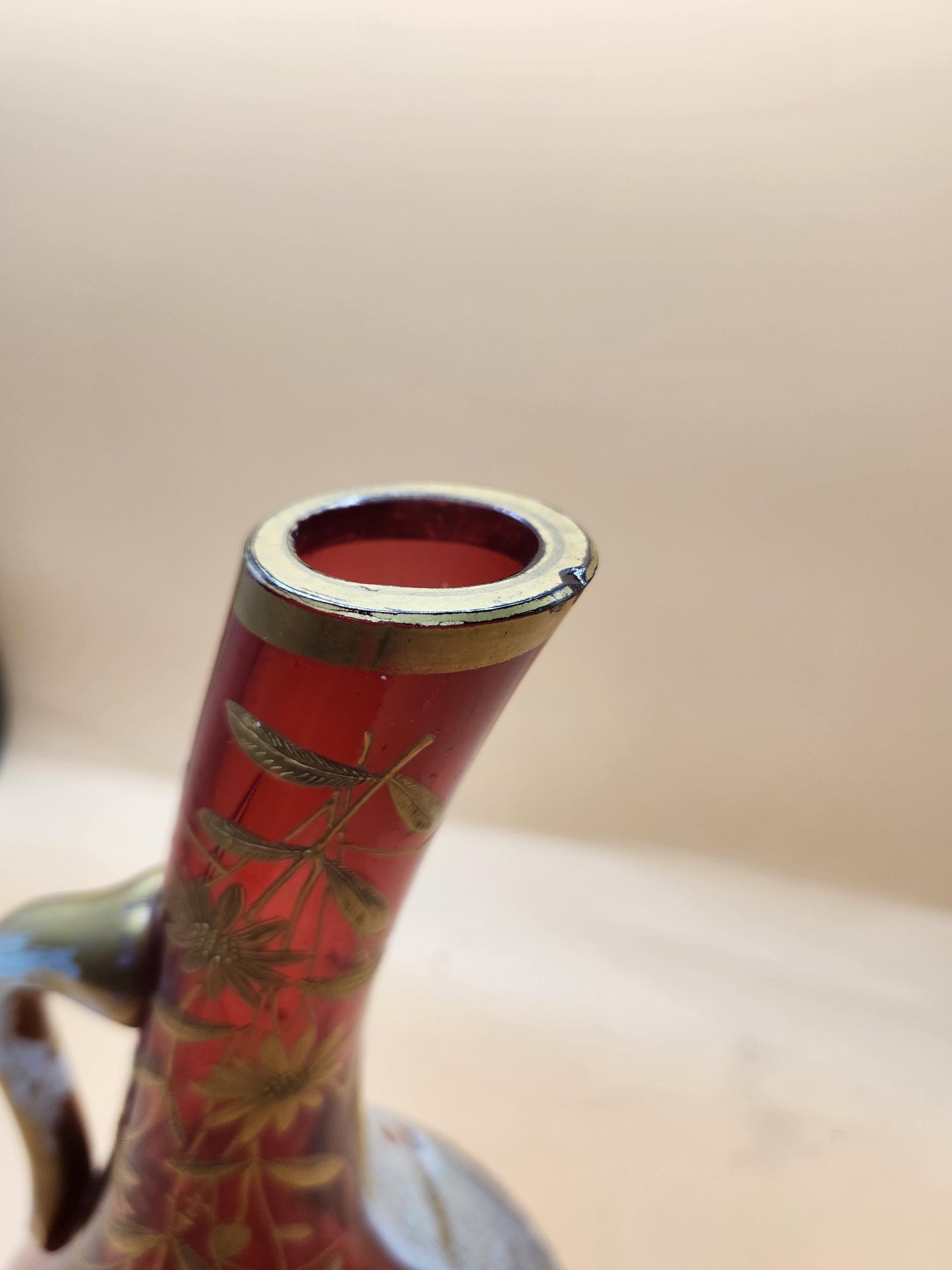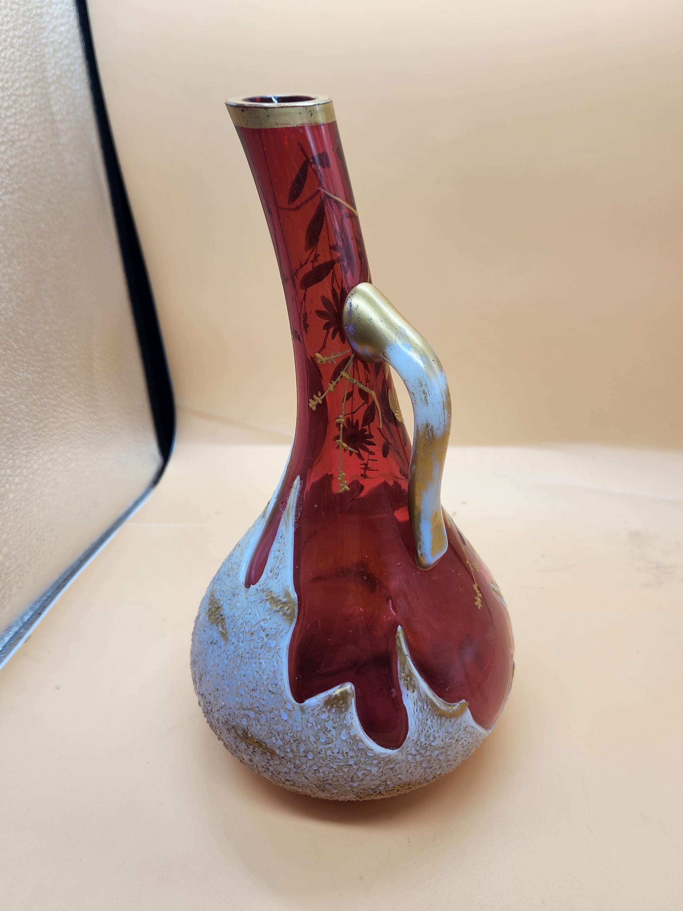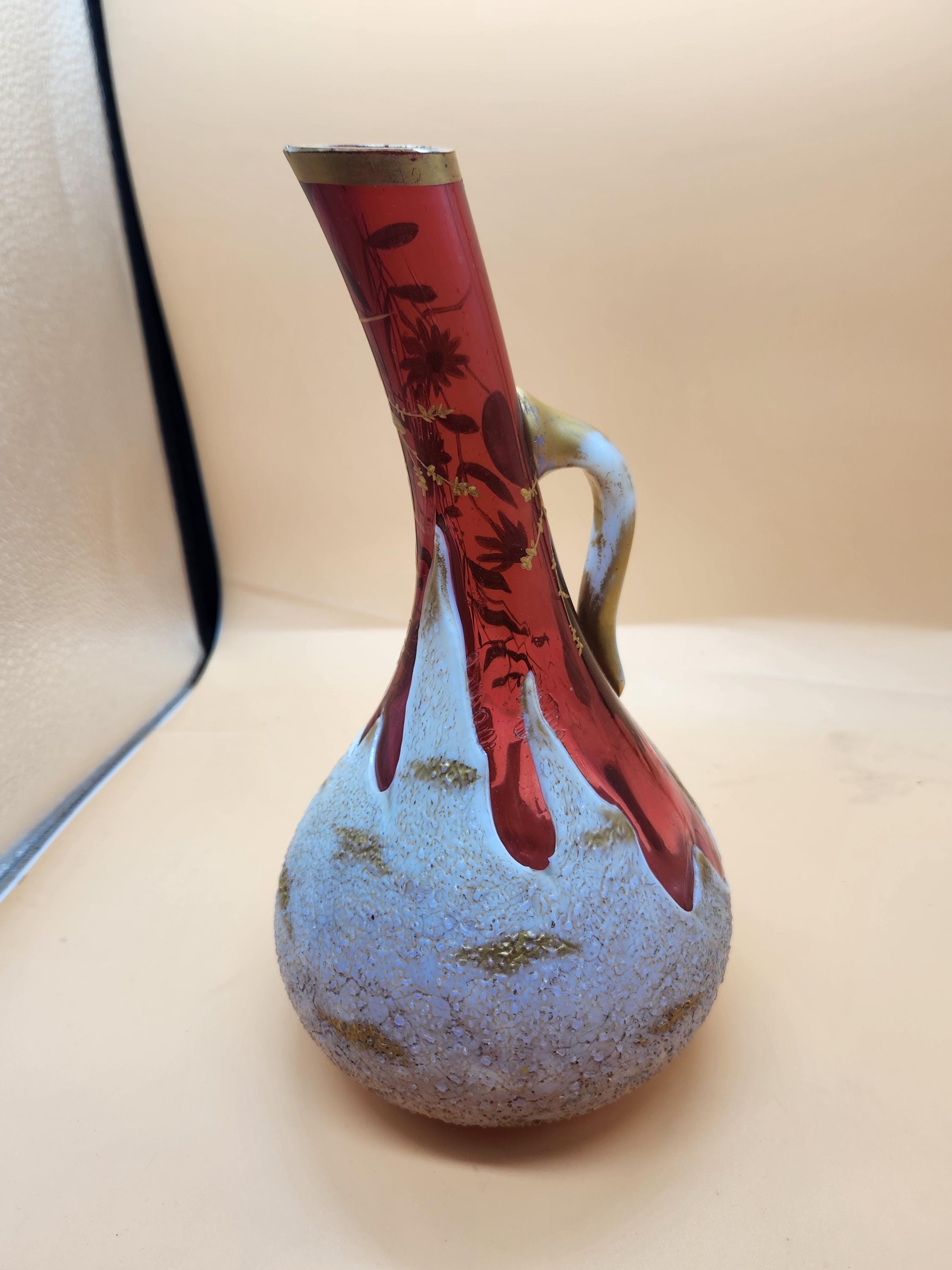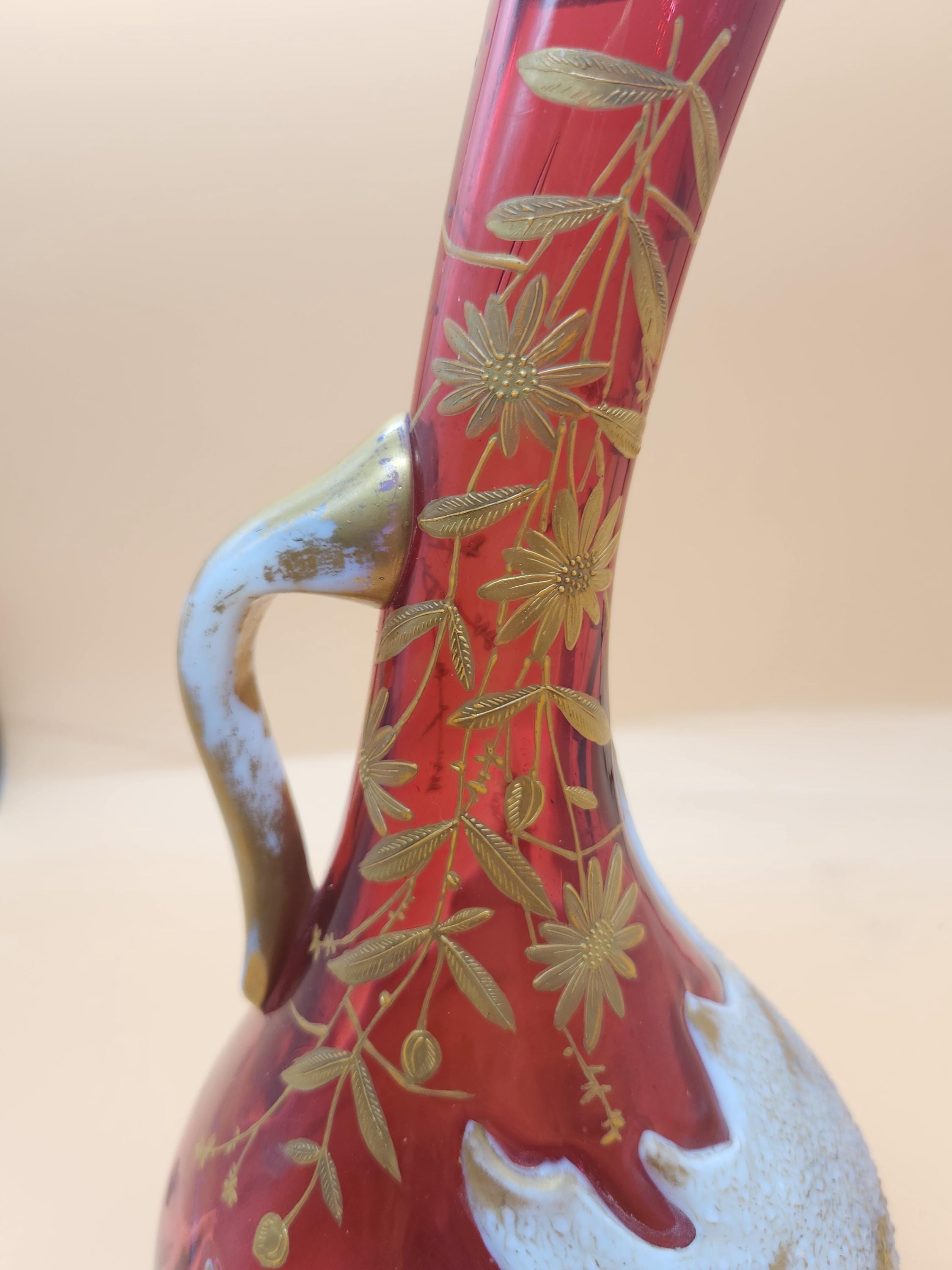 Step back in time with this truly exceptional and rare Art Nouveau vase, a testament to the exquisite craftsmanship of the early 1900s. This stunning piece features a unique combination of milk glass and cranberry glass, adorned with intricate gold floral enamel. Its distinctive shape and the masterful glass blowing required for its creation have astounded two expert appraisers, with one believing it to be early 1900s American Art Glass, crafted in the elegant style of Bohemian Art Glass, itself reflecting Japanese ornamentation.