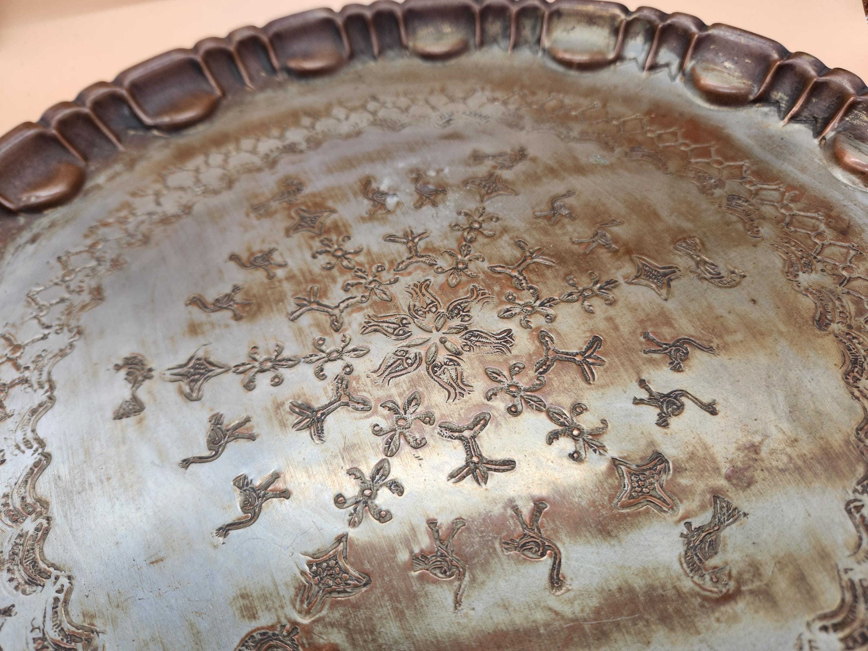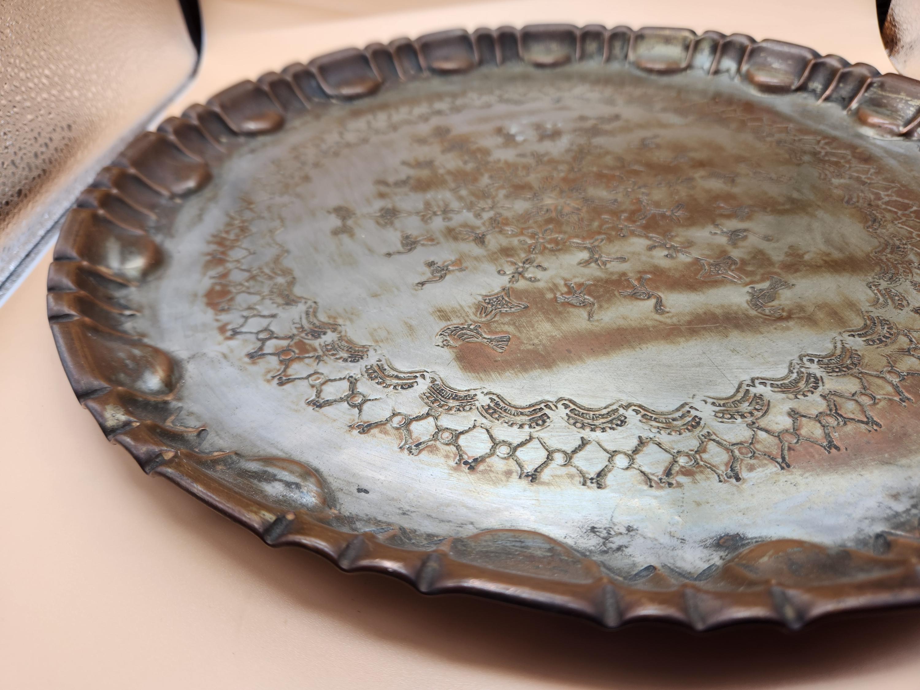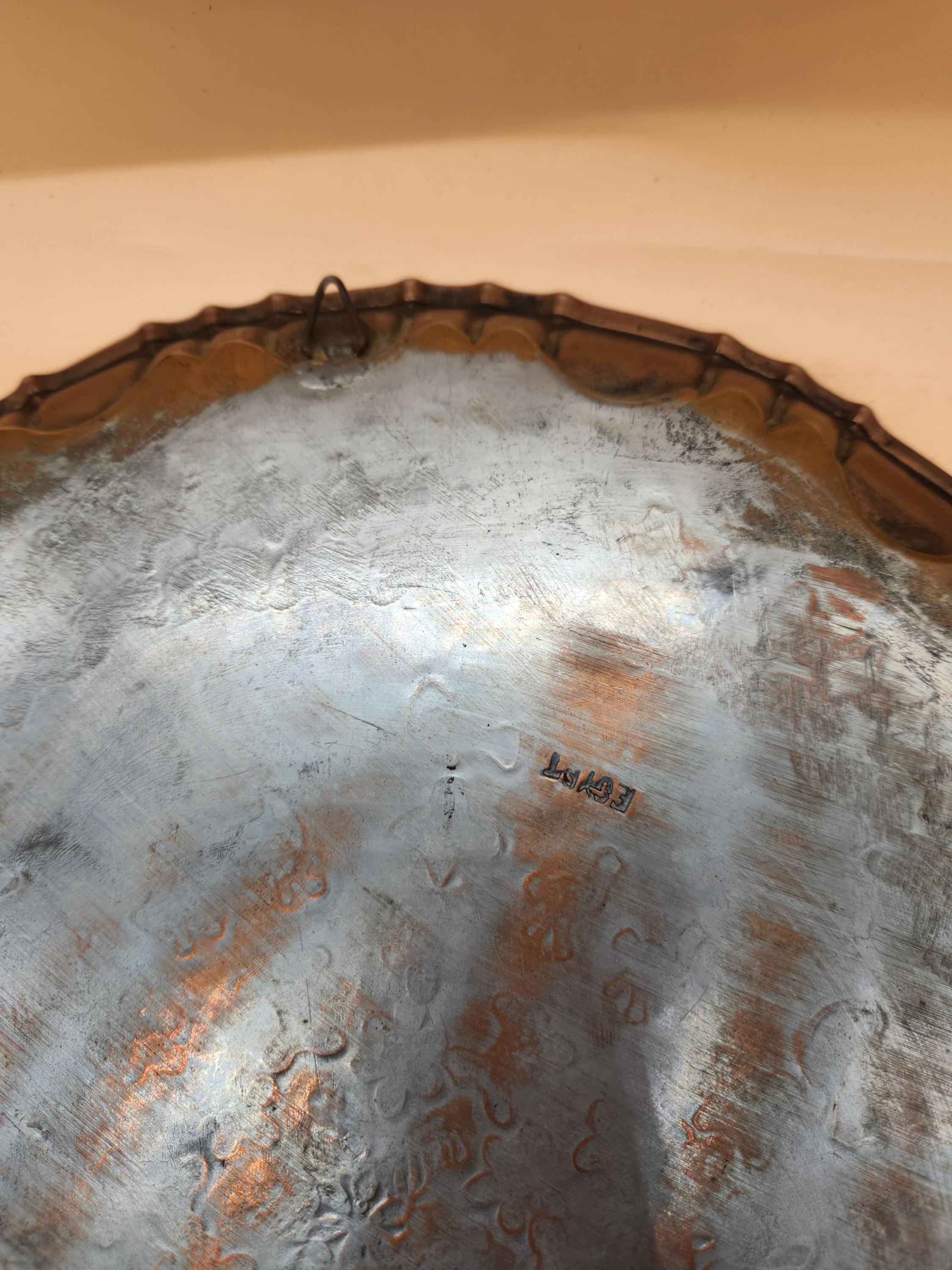 Vintage Decorative Egyptian Hammered Copper Silvertone 14" Diameter Wall Hanging Plate With Birds, With Wall hanger, Ornate embossed design featuring different kinds of birds, circa 1920s Marked Egypt Antique Round Serving Platter