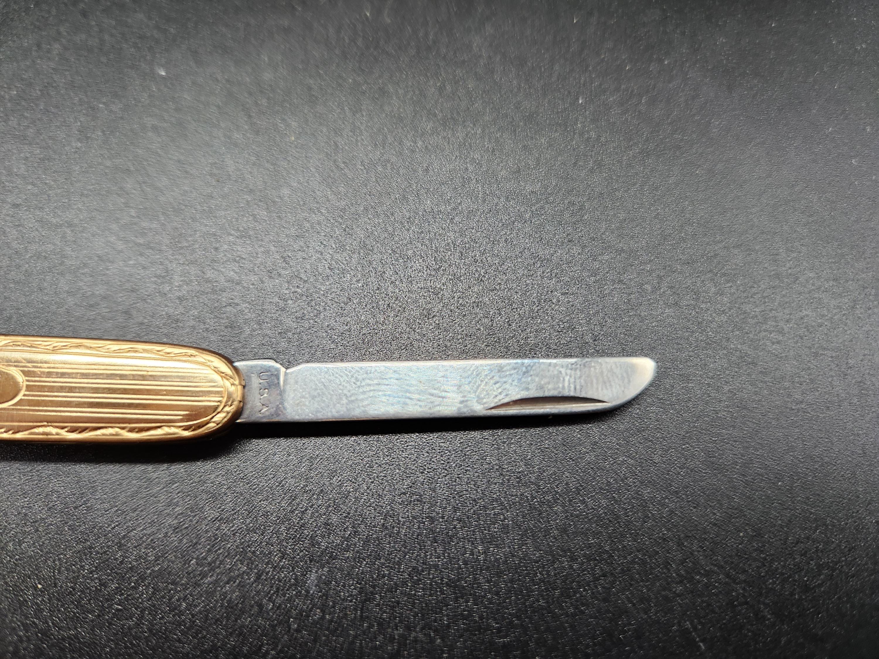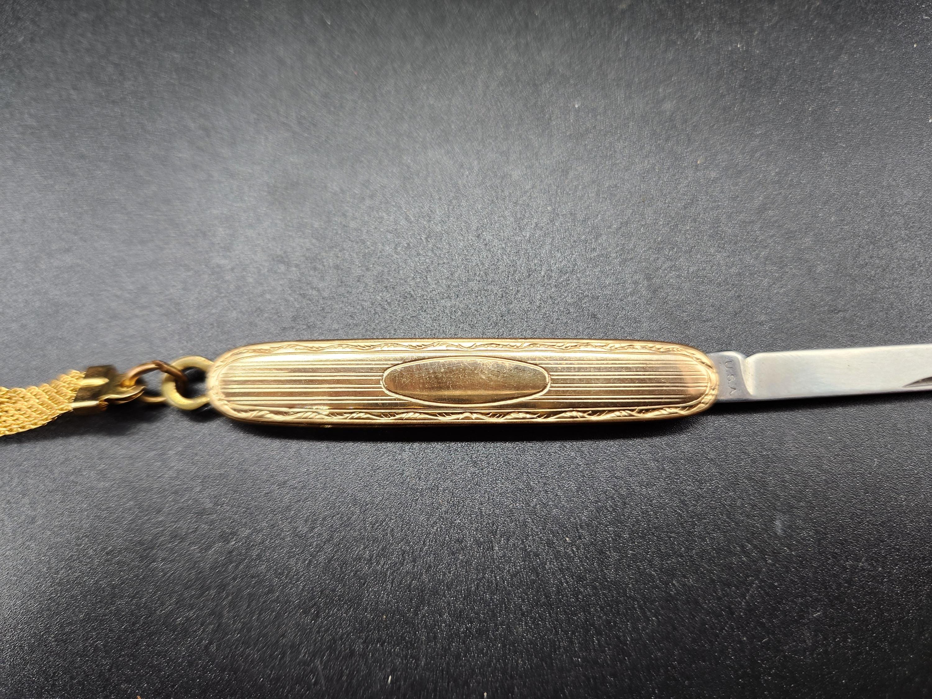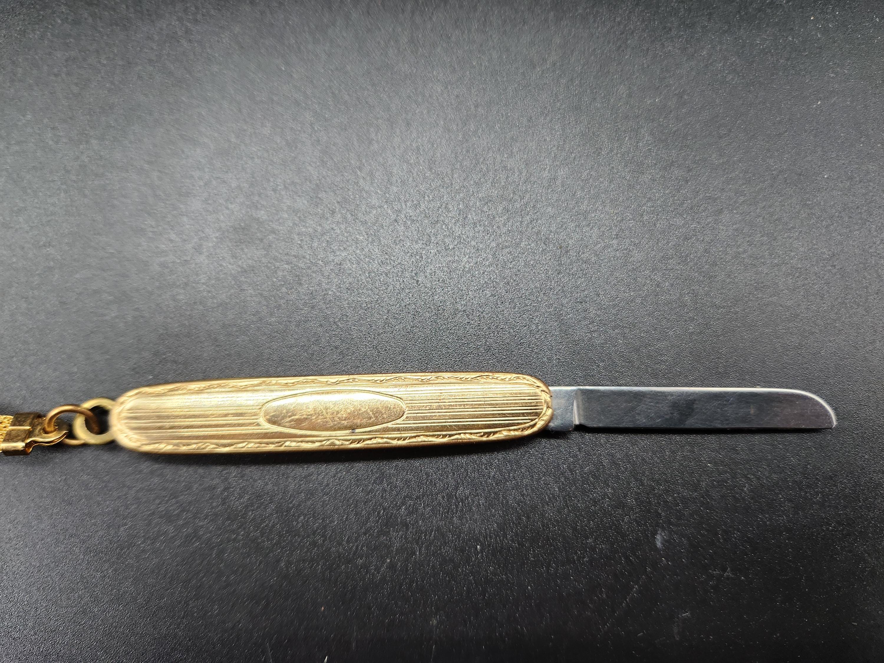 Early 1900s Etched Gold Single Blade Folding Pocket Knife or Book Cutter on Chain and Key Fob Made U.S.A., Possibly Gold Filled (most knives like this are), Not Marked. Knife is 2.5" long, fob chain is also 2.5" long, blade is 1.5" long.