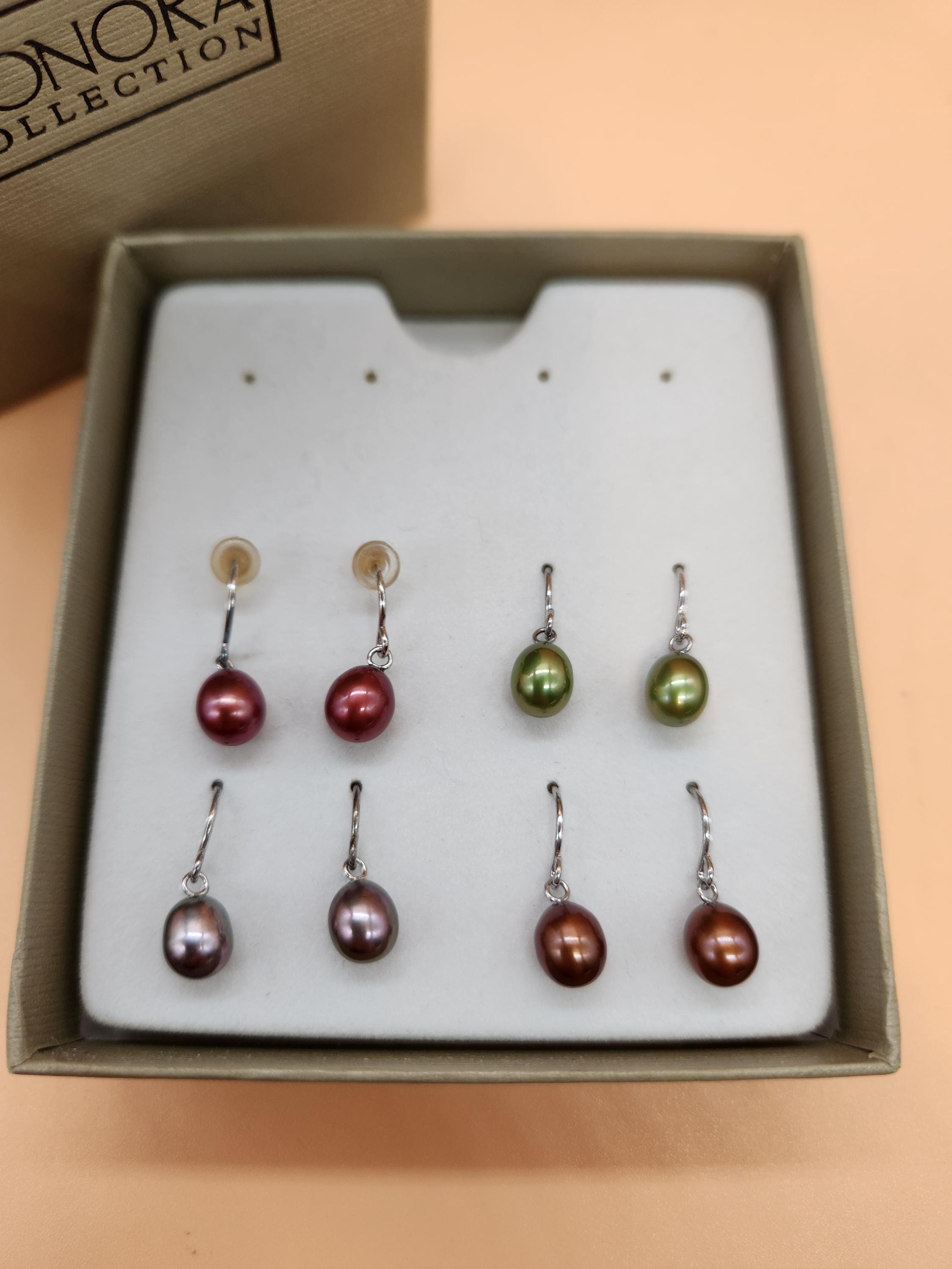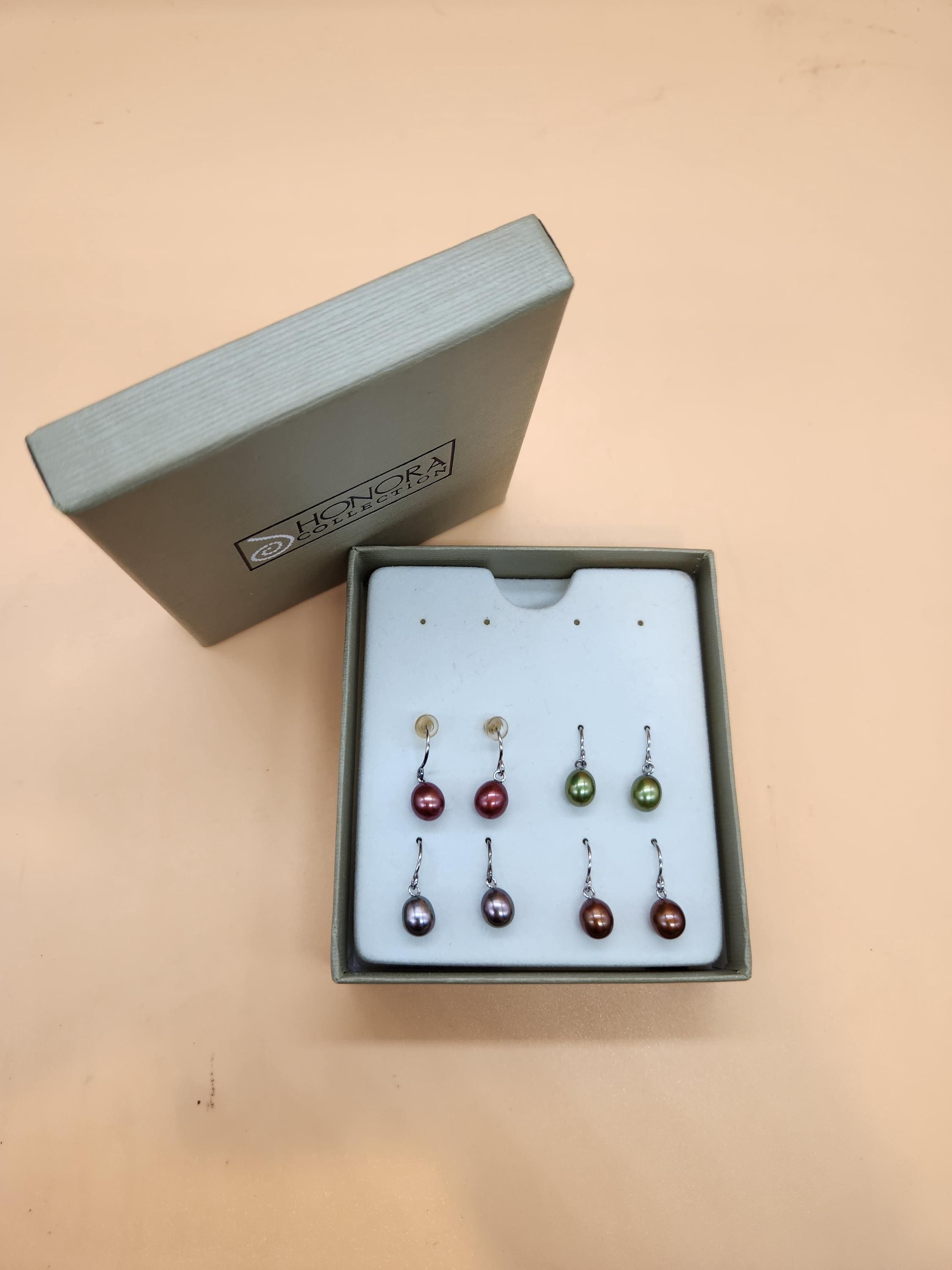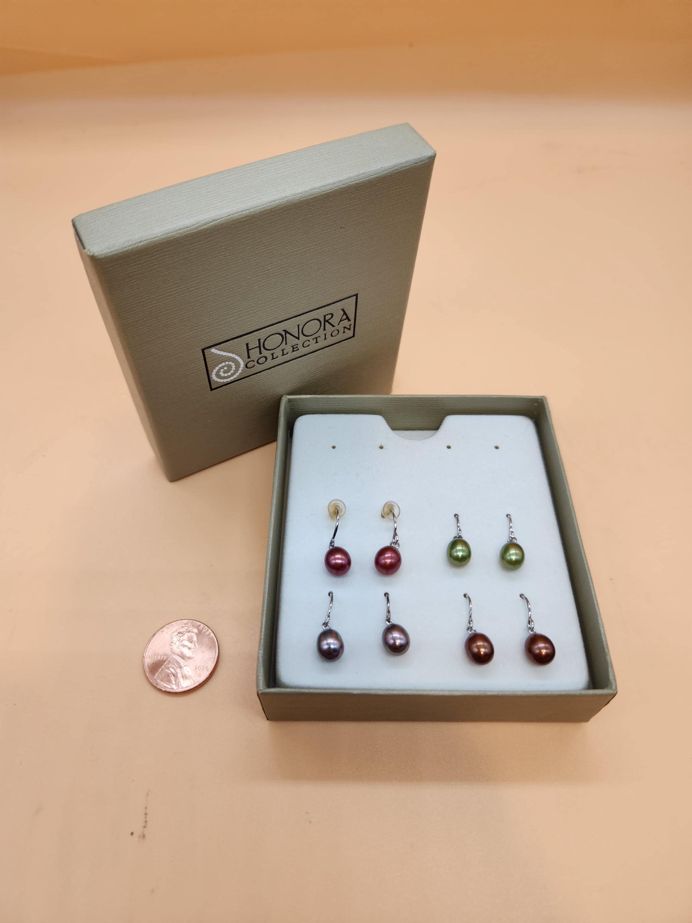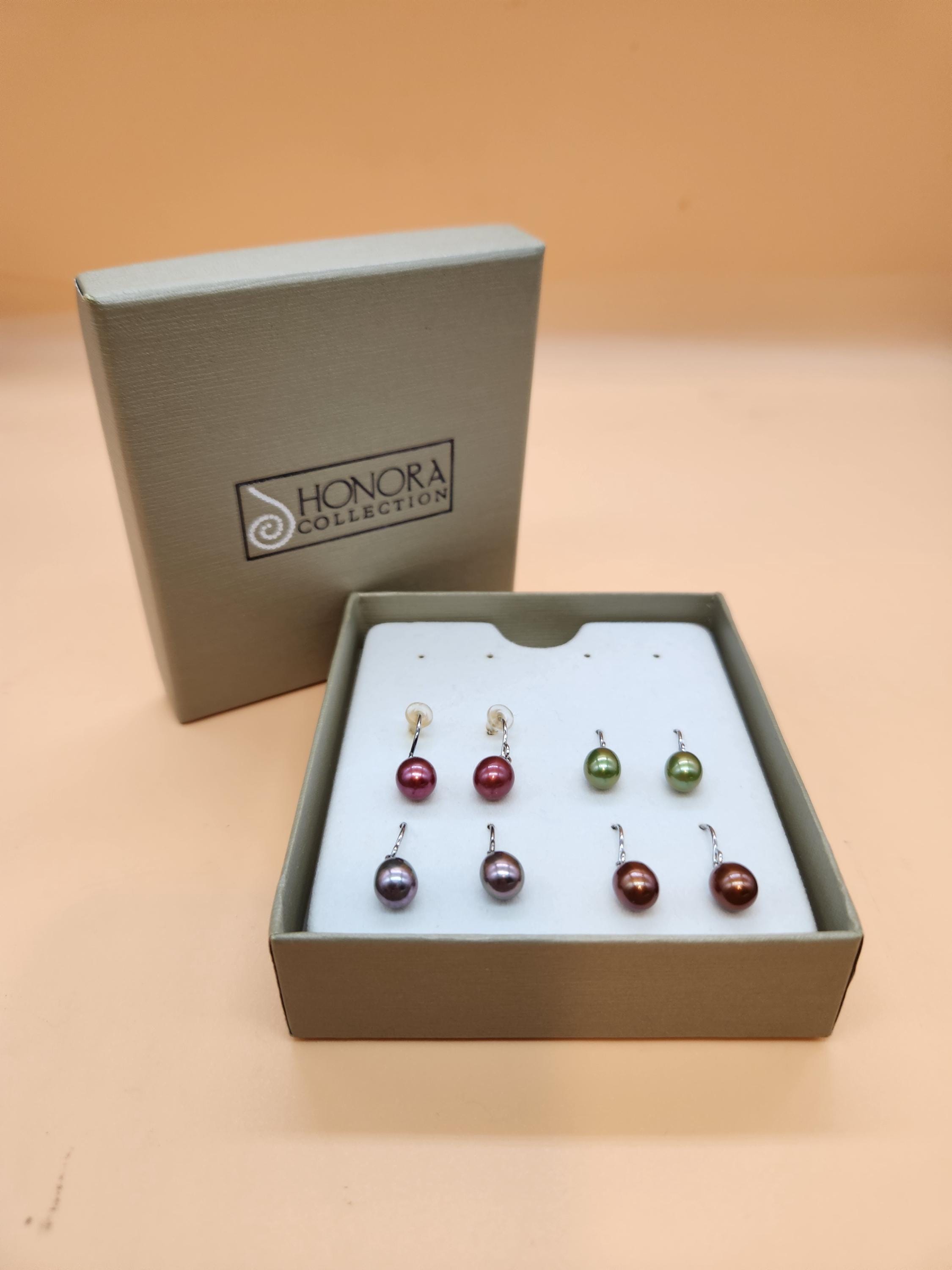 Set of four pair Honora Cultured Pearl Drop Earrings, Silver, Red, Green and Brown, Excellent condition in original box. Marked 925 Sterling Silver.