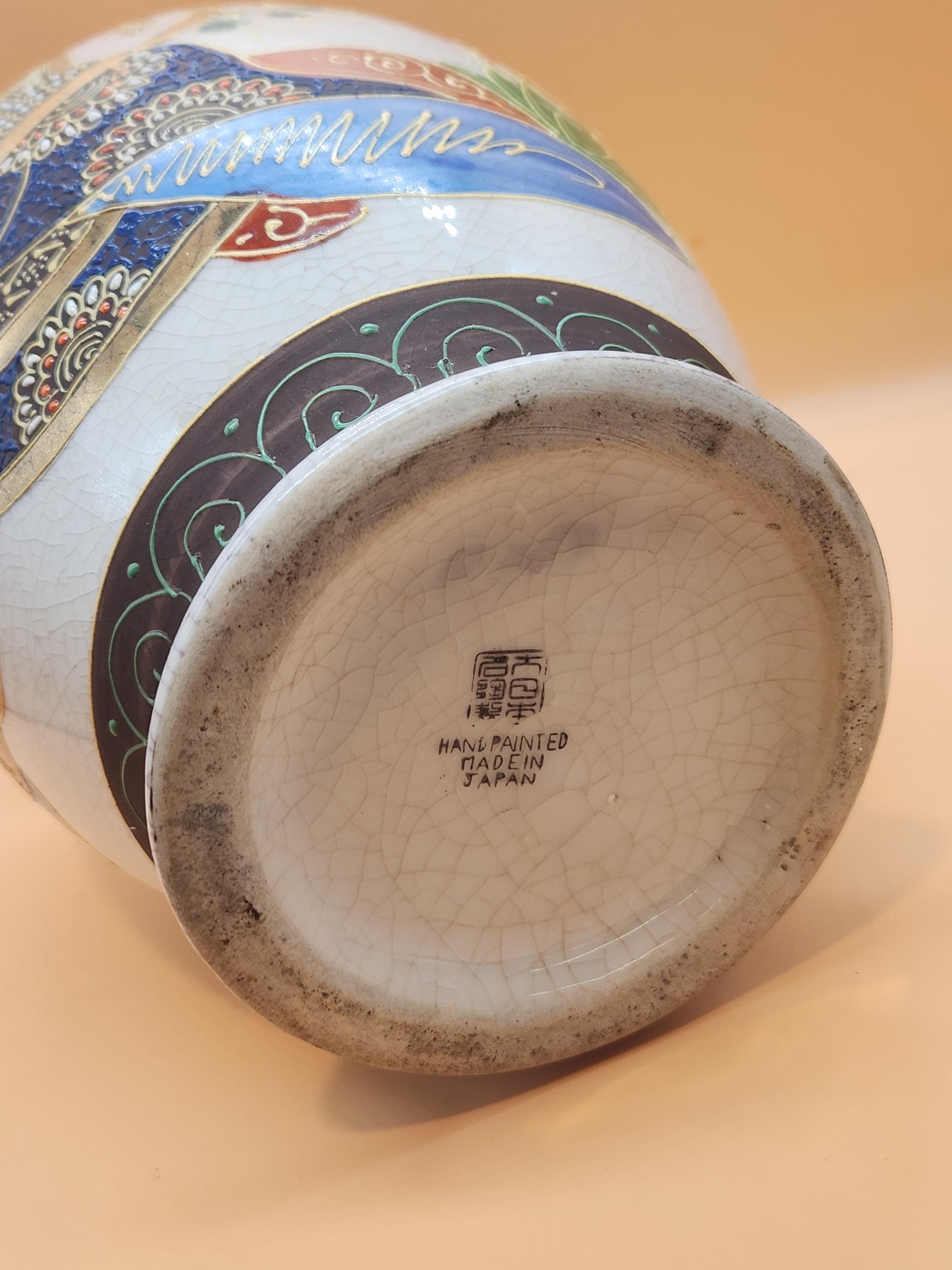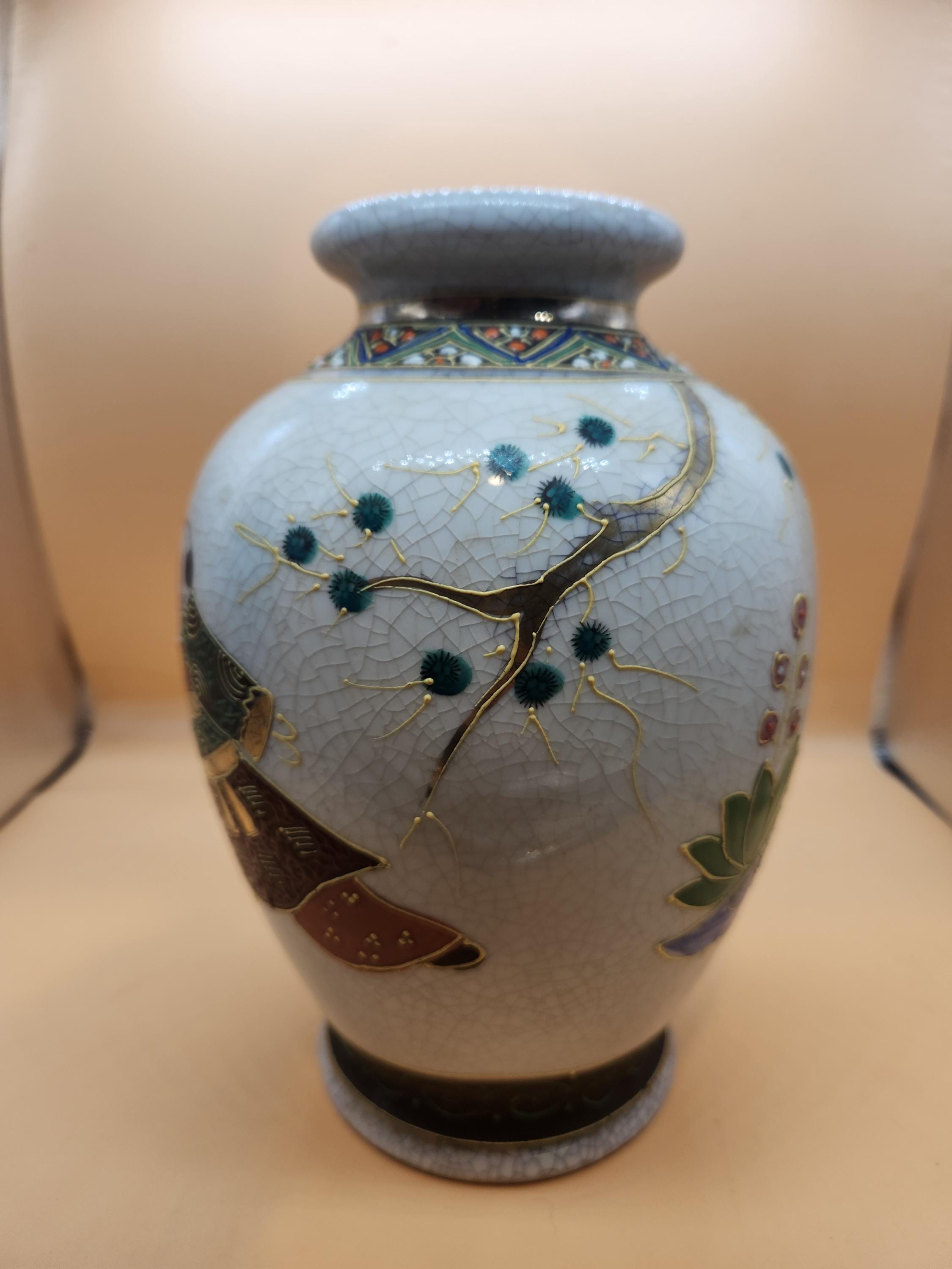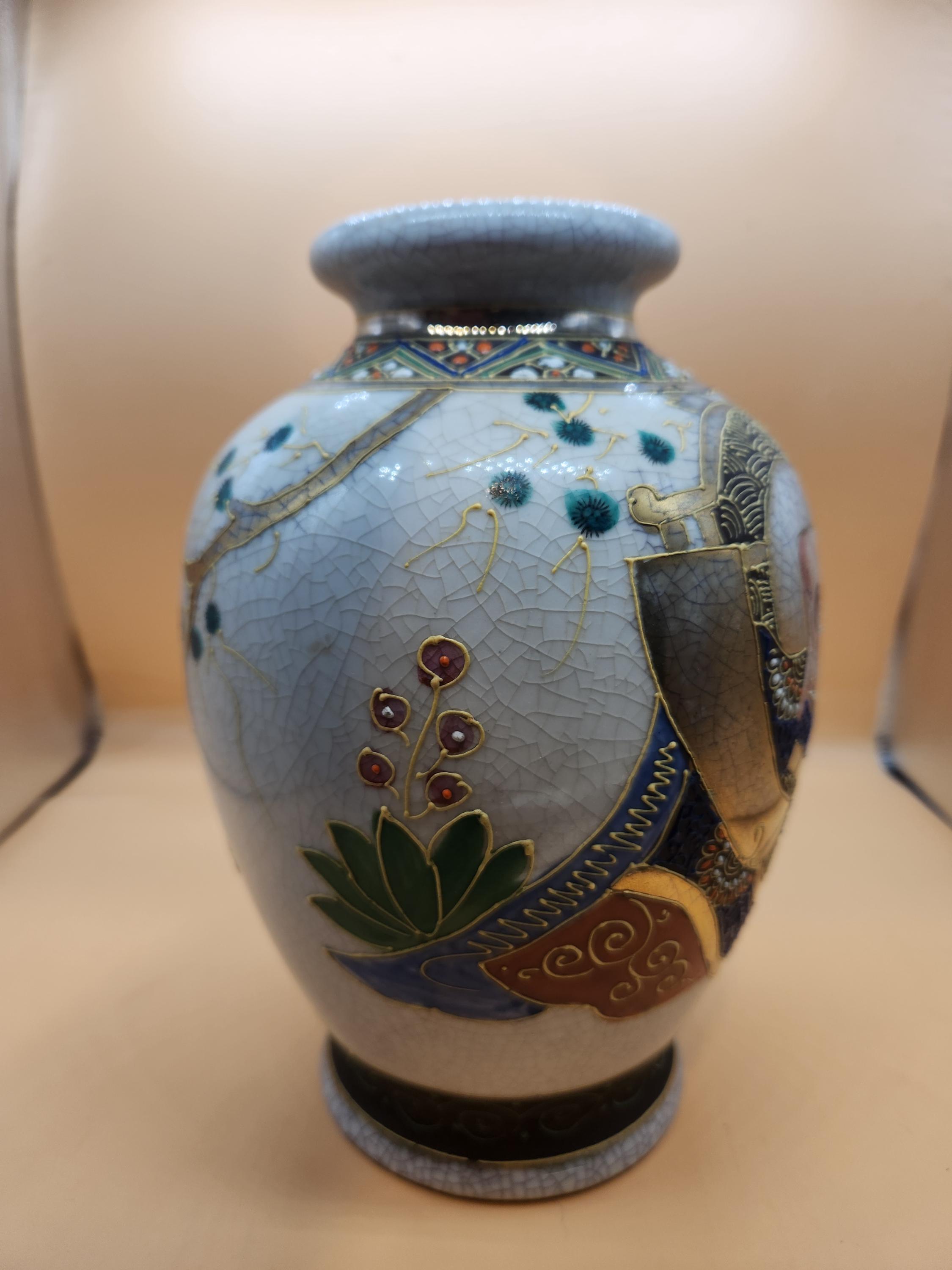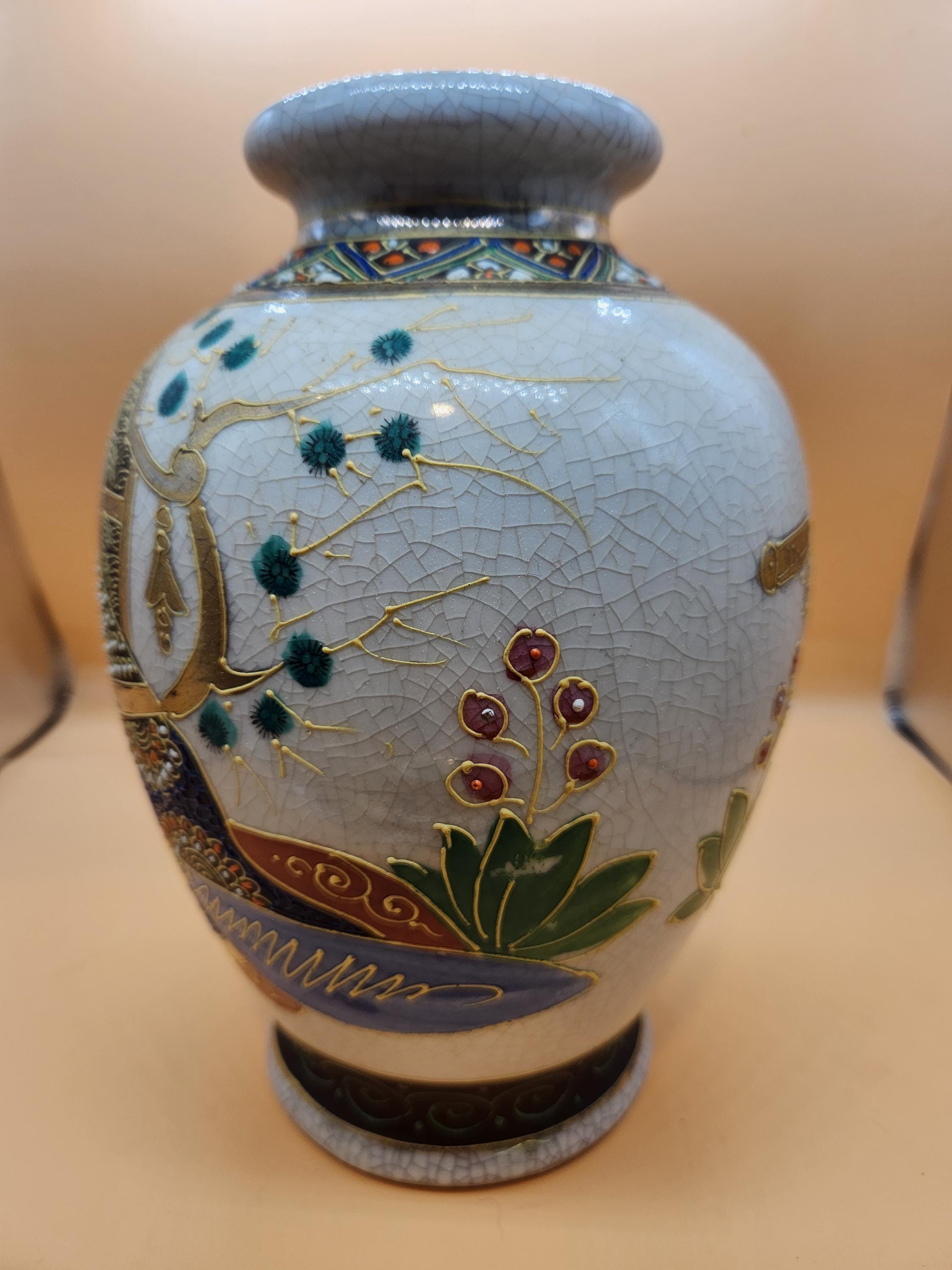 Standing proudly at 8 inches tall with a substantial 5.5-inch diameter, this vase makes a captivating statement. The traditional Moriage technique creates a delightful raised enamel effect, adding depth and texture to the already beautiful design. Despite its age, this vintage treasure remains in excellent condition, with no chips to mar its delicate beauty. As is characteristic of authentic antique Satsuma, it exhibits heavy crazing due to its age, which only enhances its historical charm and authenticity.
