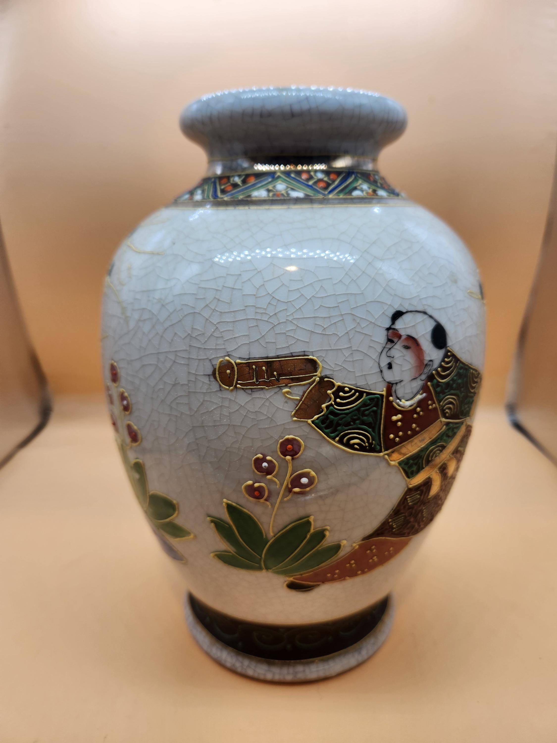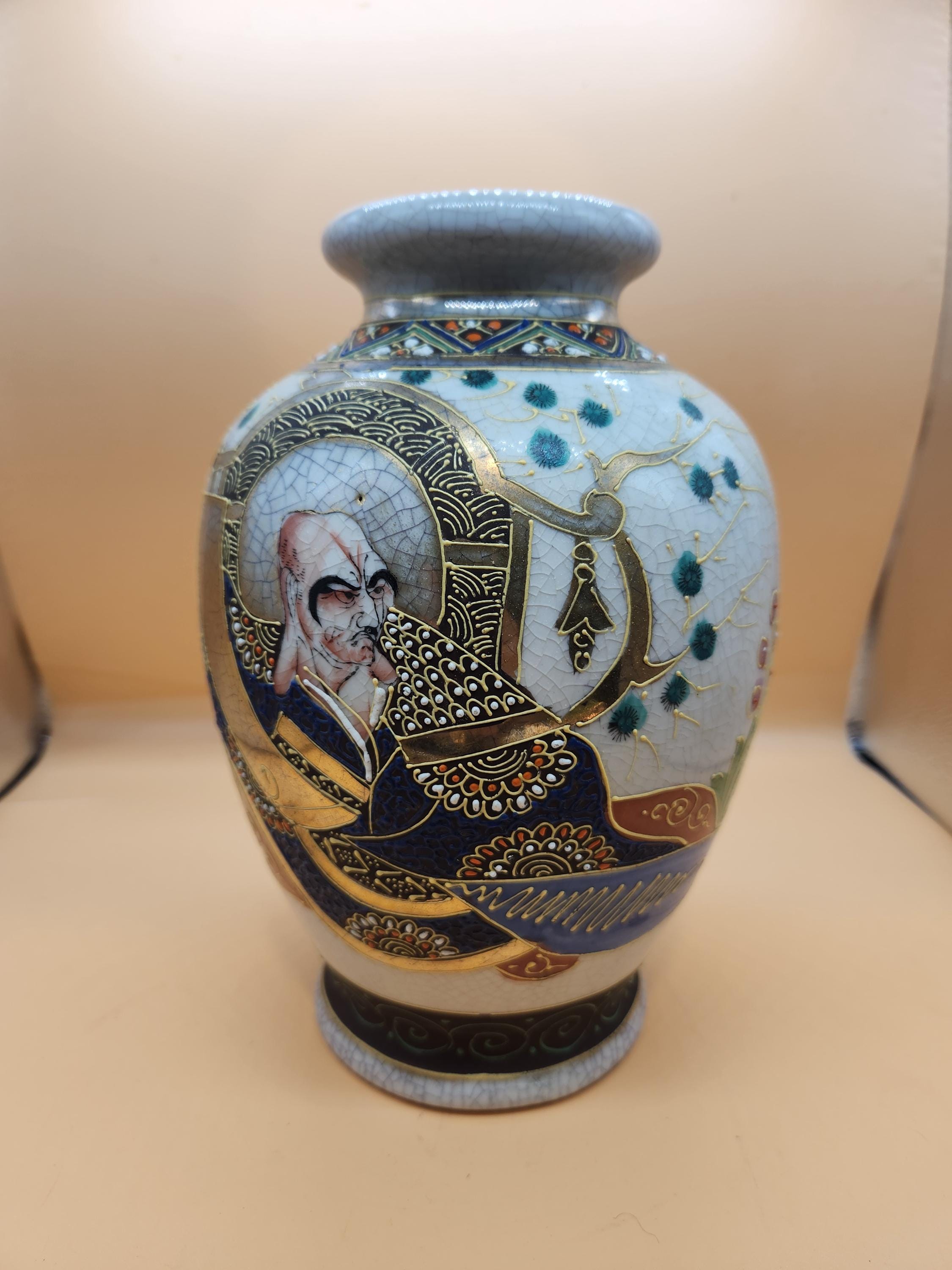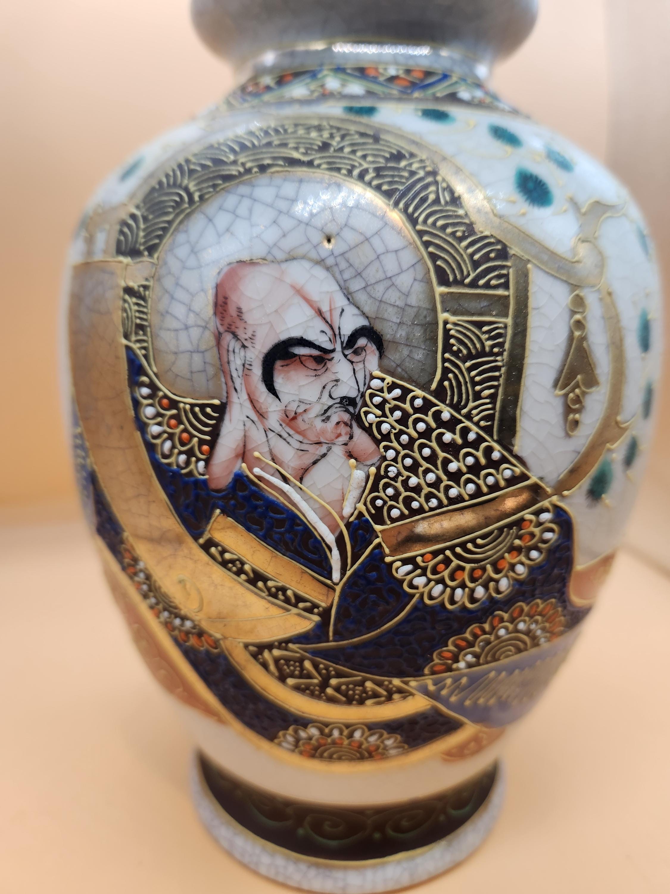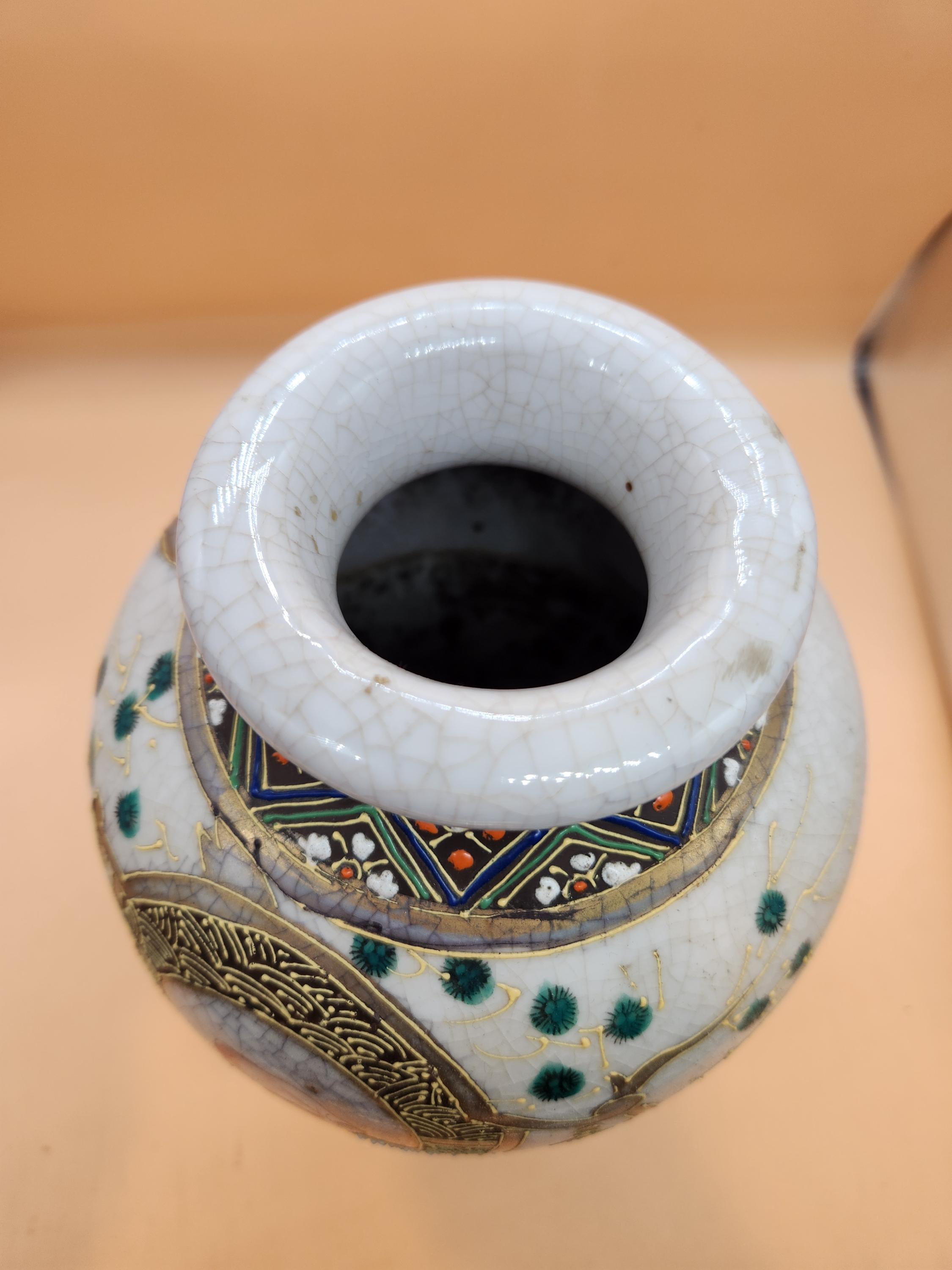 Standing proudly at 8 inches tall with a substantial 5.5-inch diameter, this vase makes a captivating statement. The traditional Moriage technique creates a delightful raised enamel effect, adding depth and texture to the already beautiful design. Despite its age, this vintage treasure remains in excellent condition, with no chips to mar its delicate beauty. As is characteristic of authentic antique Satsuma, it exhibits heavy crazing due to its age, which only enhances its historical charm and authenticity.