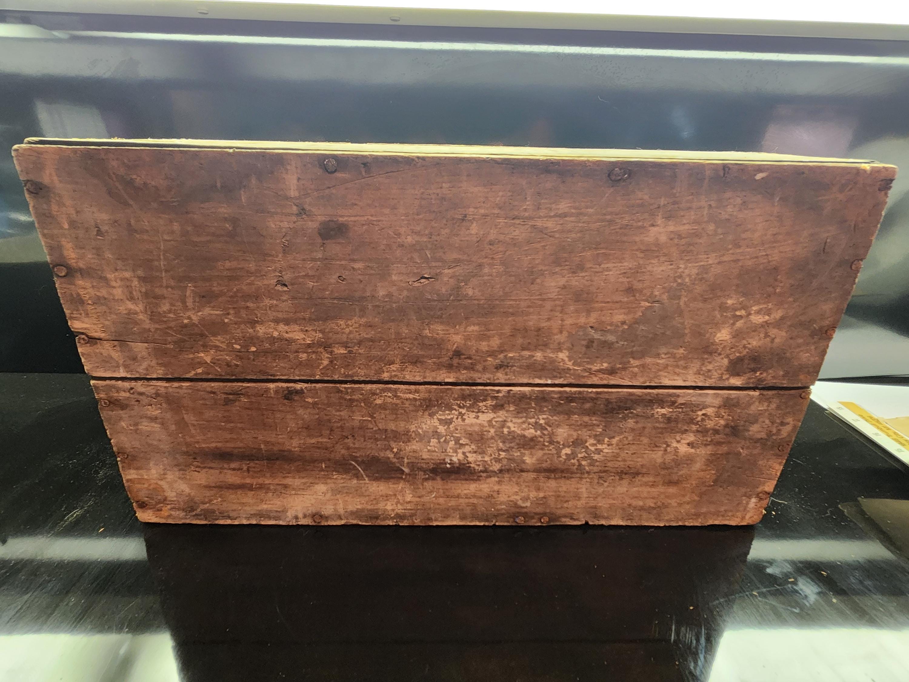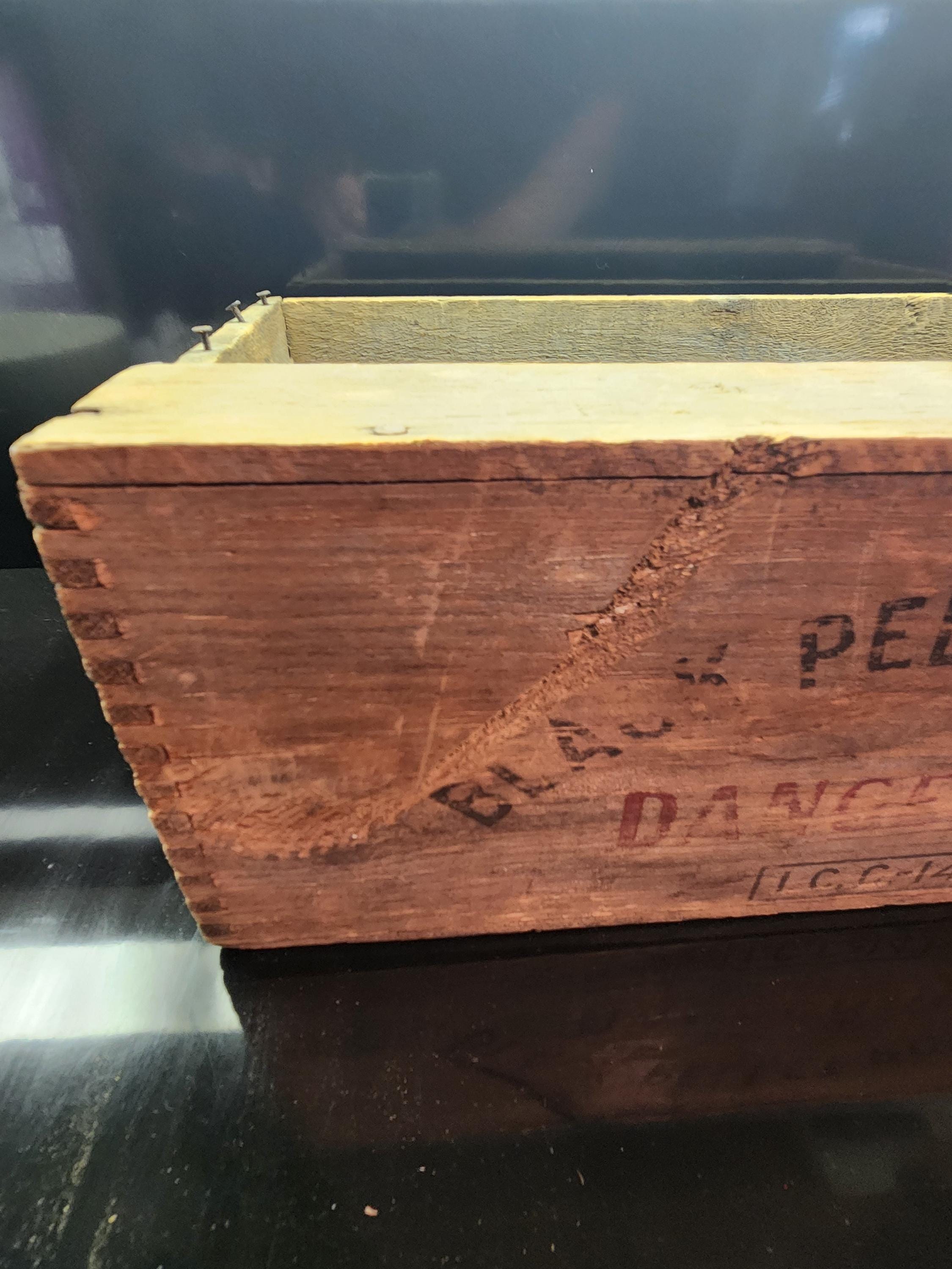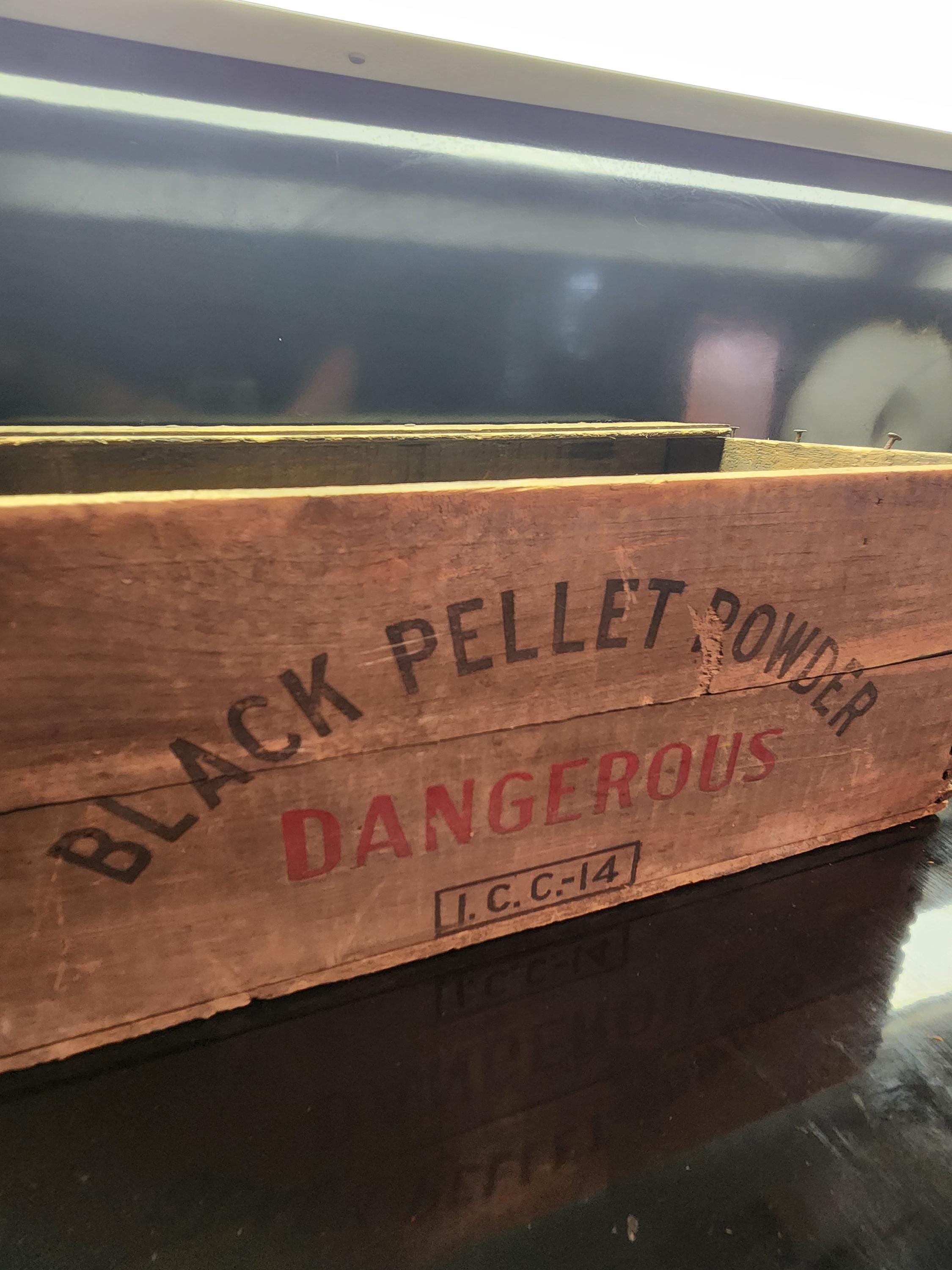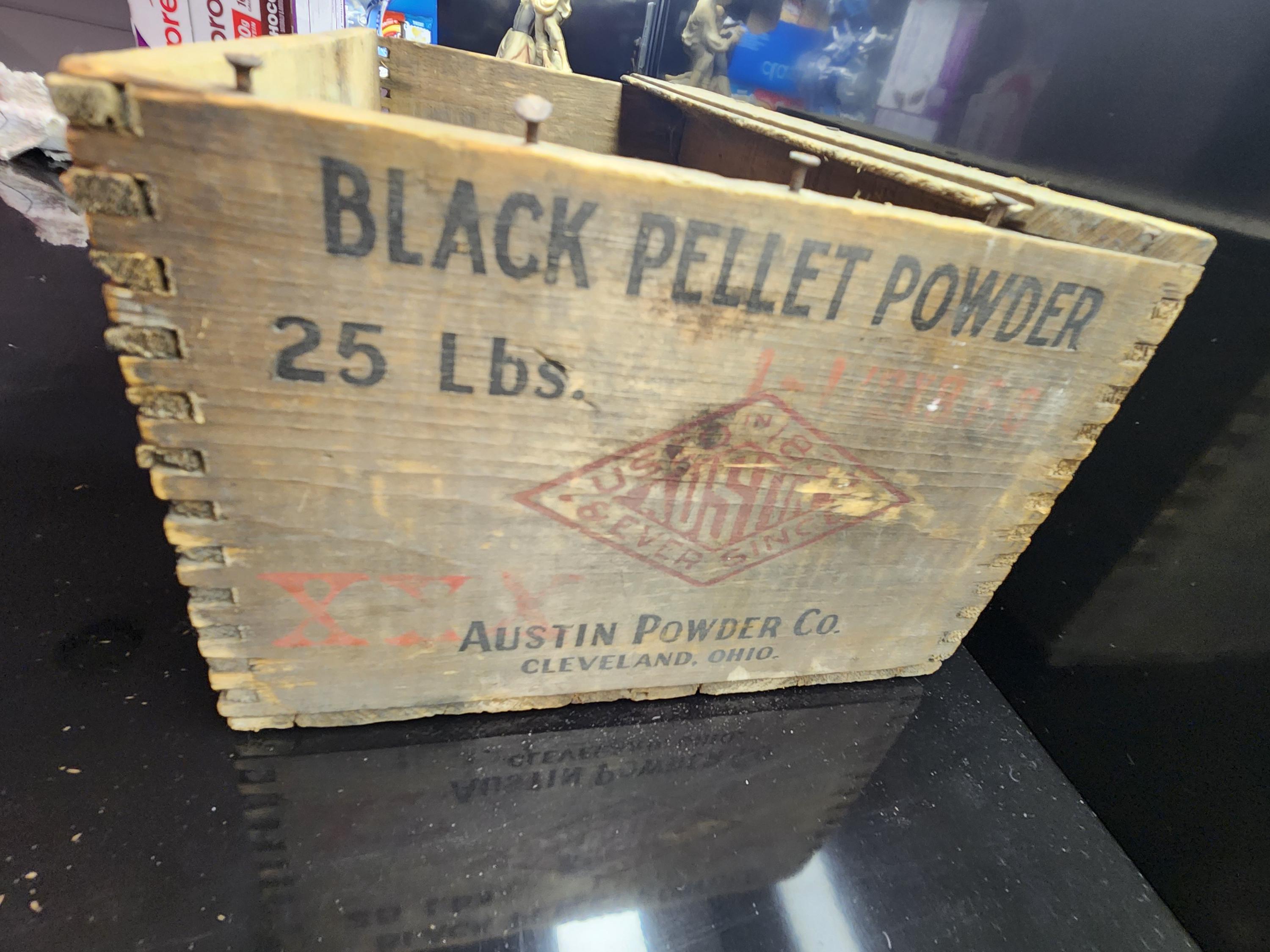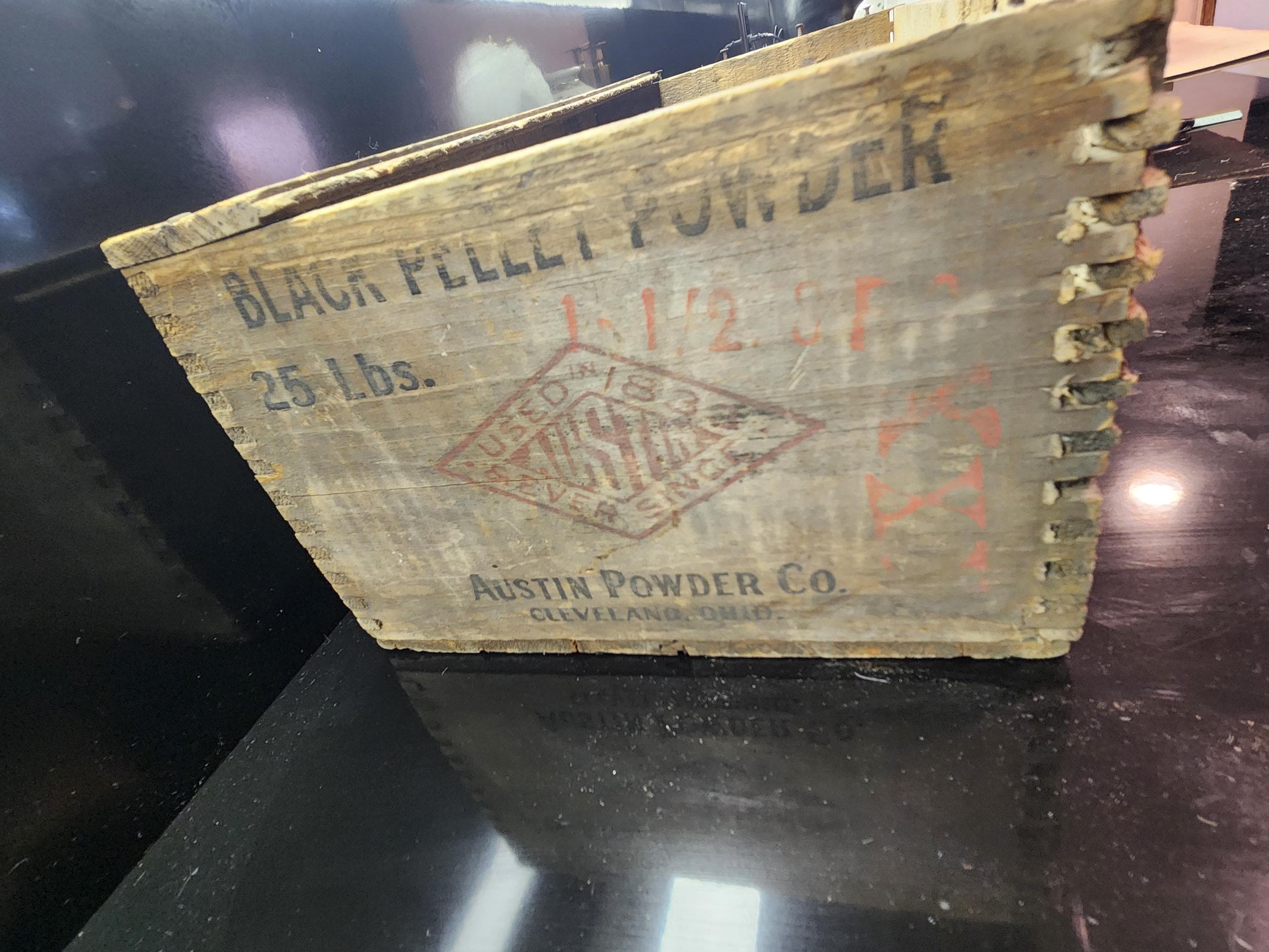 Antique DuPont Black Pellet Powder Wooden Crate, Vintage Ammo Box, I.C.C.-14 25lb Box, 17" x 9 3/4" x 8.5", Marked Dangerous, Good Solid Condition. Austin Powder Company, Cleveland Ohio.