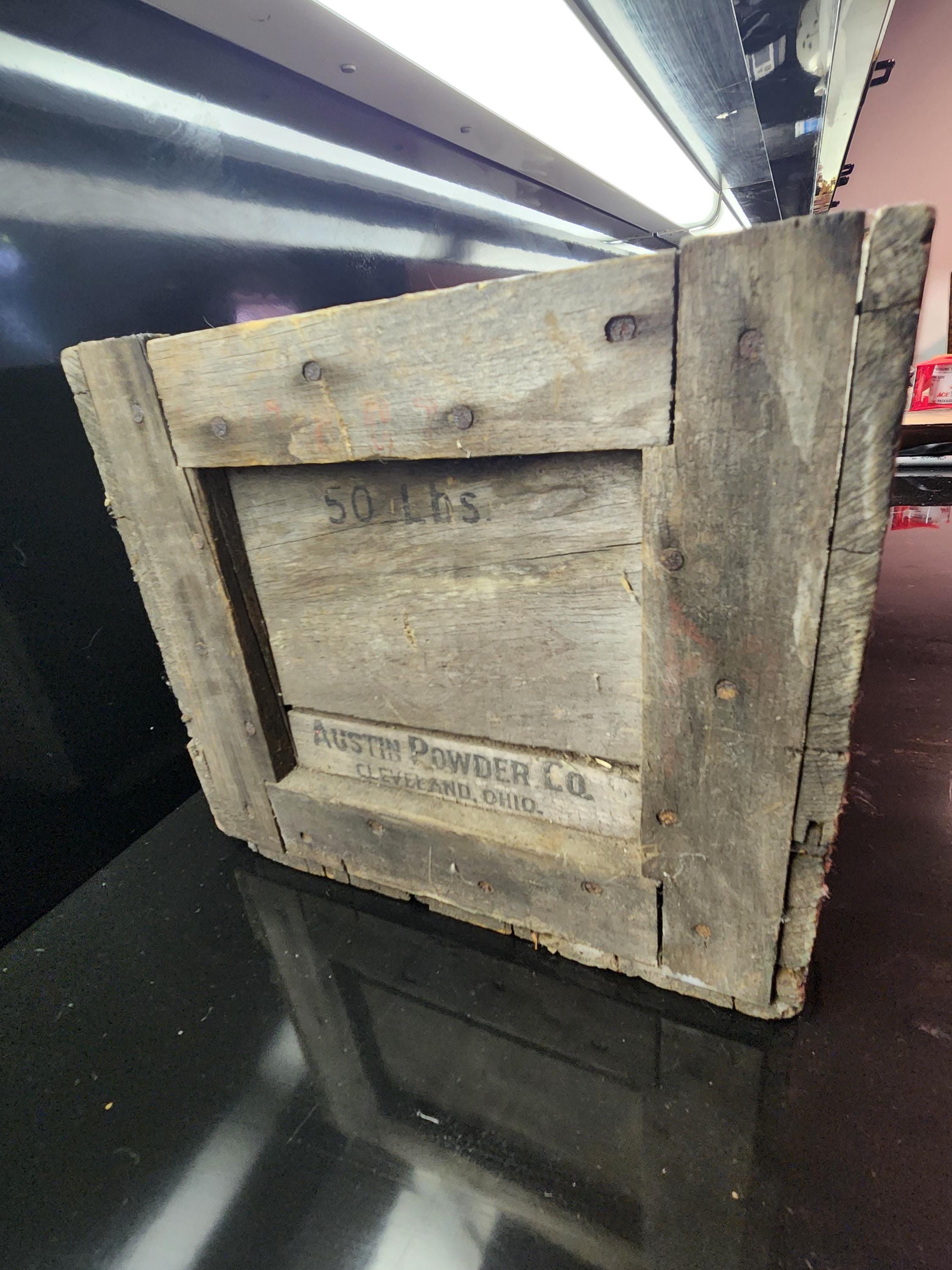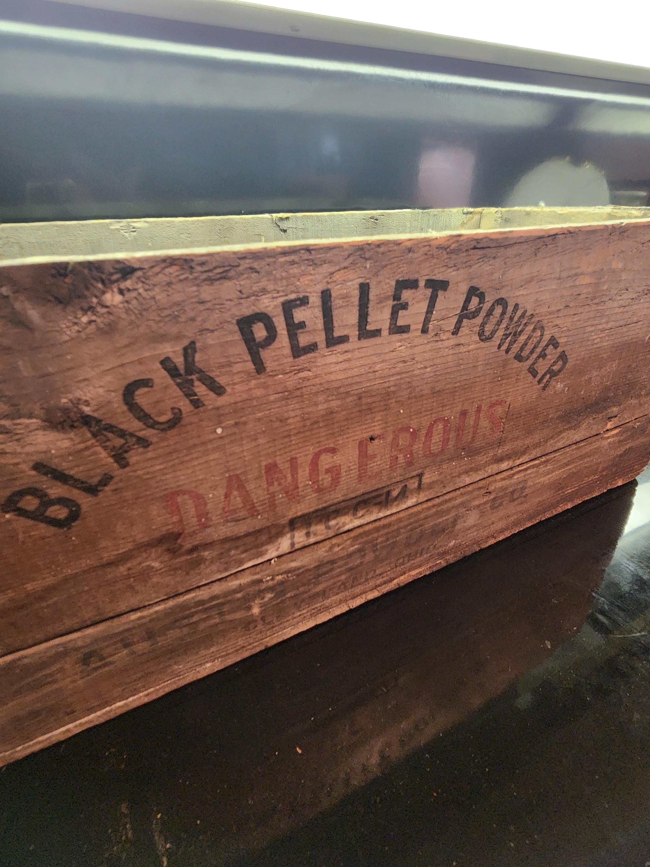 Antique DuPont Black Pellet Powder Wooden Crate, Vintage Ammo Box, I.C.C.-14 50lb Box, 24" x 9.5" x 8", Marked Dangerous, Good Solid Condition. Austin Powder Company, Cleveland Ohio. Back side of the box has some wear over the word Pellet, see pictures.