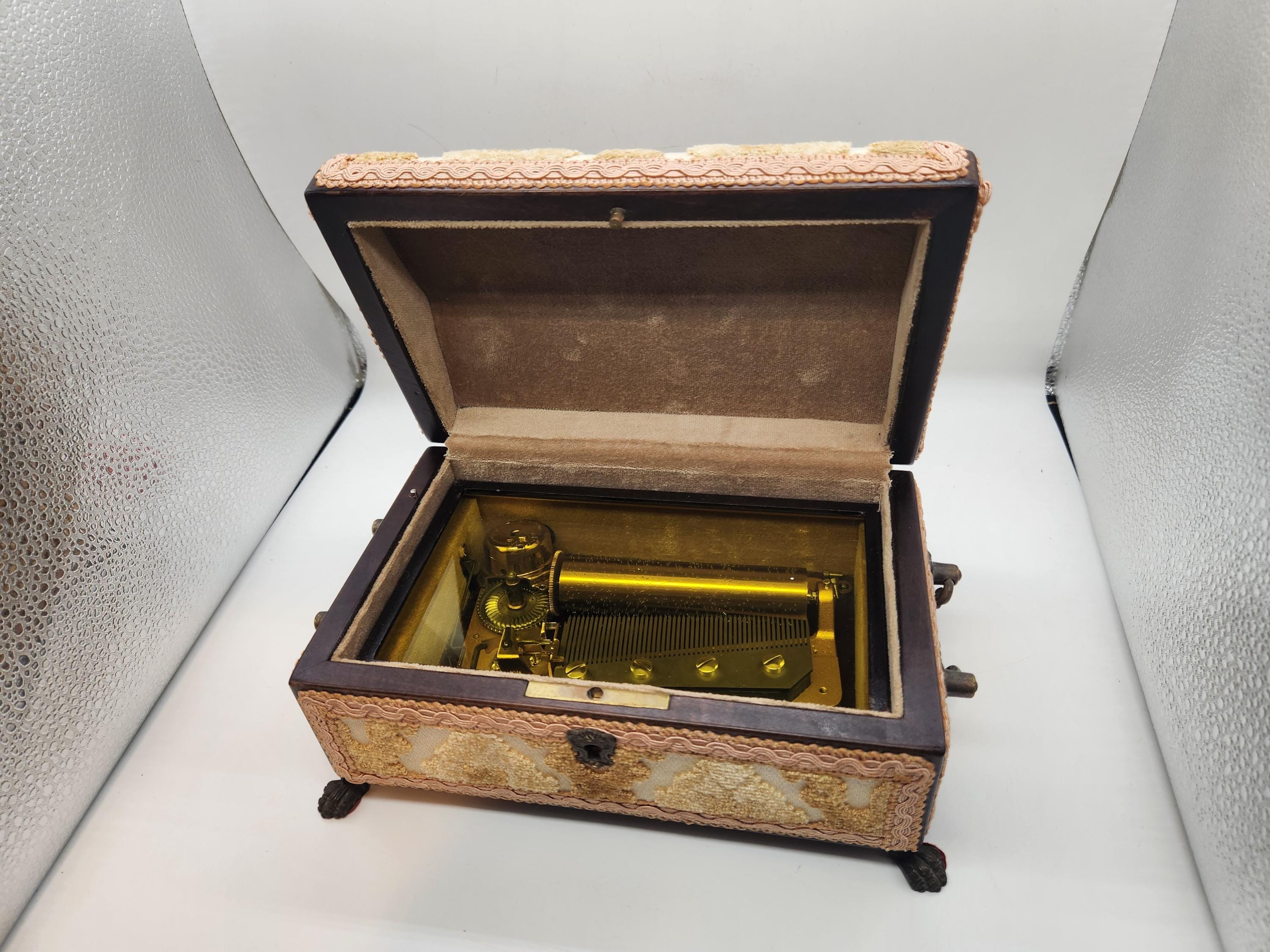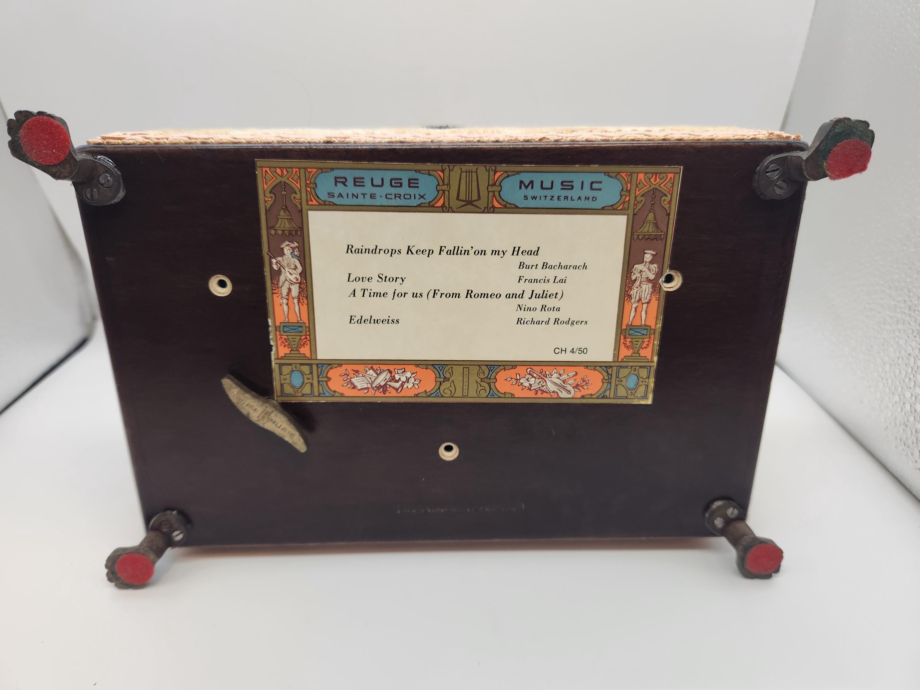For Parts or Repair: Reuge Swiss Saint-Croix CH 4/50 4 Song Wooden Music Box - All parts and screws present, Mechanism is loose and in pieces behind the glass in box, Unknown working condition, for parts or repair, nice decorative cloth wooden box. 8" x 5" x 4", Decorative feet and handles. Very expensive music box in working condition! Has original key with tassle. Plays 4 songs: Raindrops Keep Fallin' On My Head (Burt Bacharach), Love Story (Francis Lai), A Time For Us (From Romeo and Juliet) (Nino Rota), and Edelweiss (Richard Rogers).