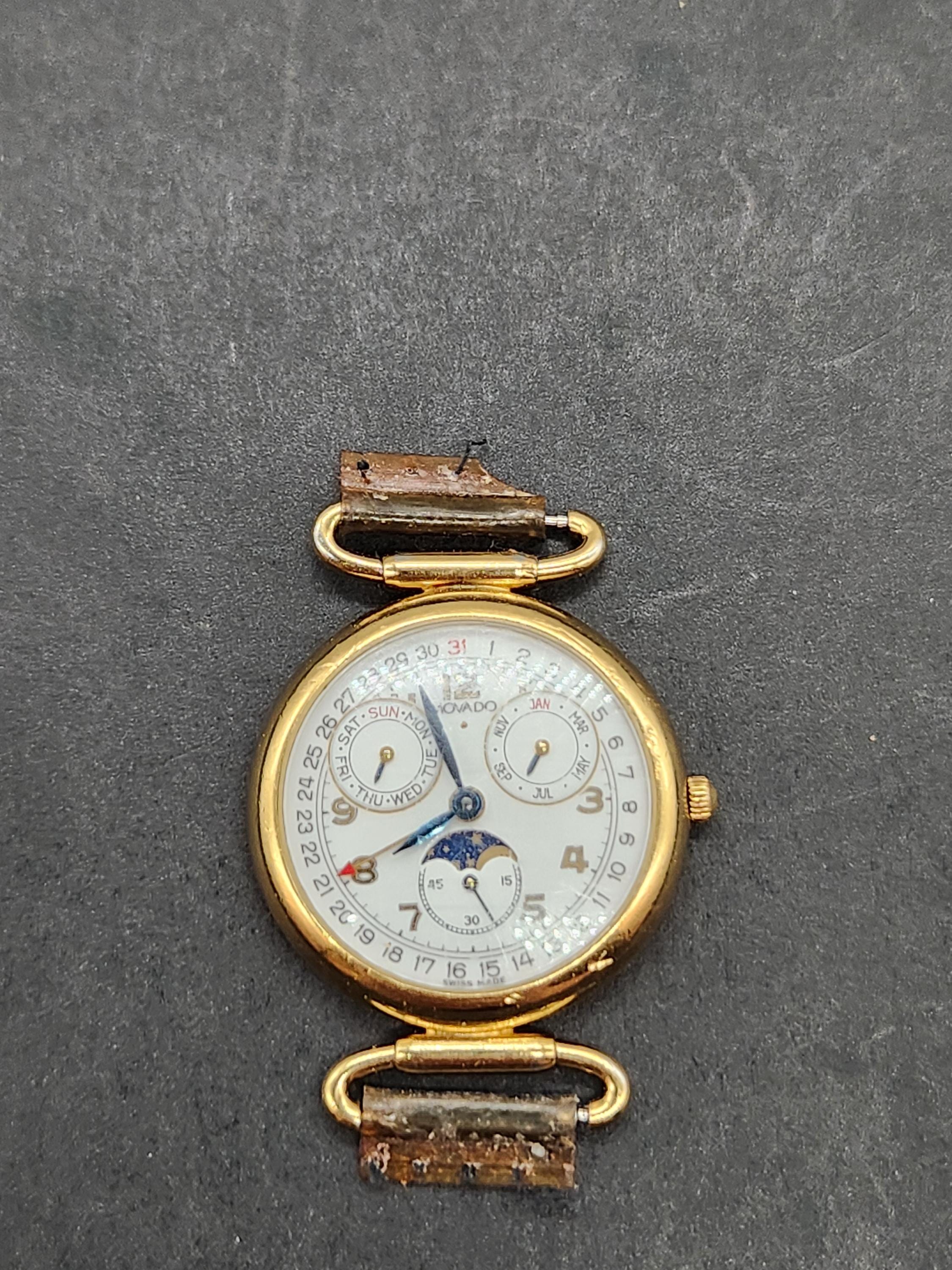 The watch battery was replaced Dec 2025, and the time, date, and month dials have been accurately set. The day of the week dial will take more time (several year cycles) to be accurately set. The watch has been verified to keep excellent time and be in fully functional working order.
