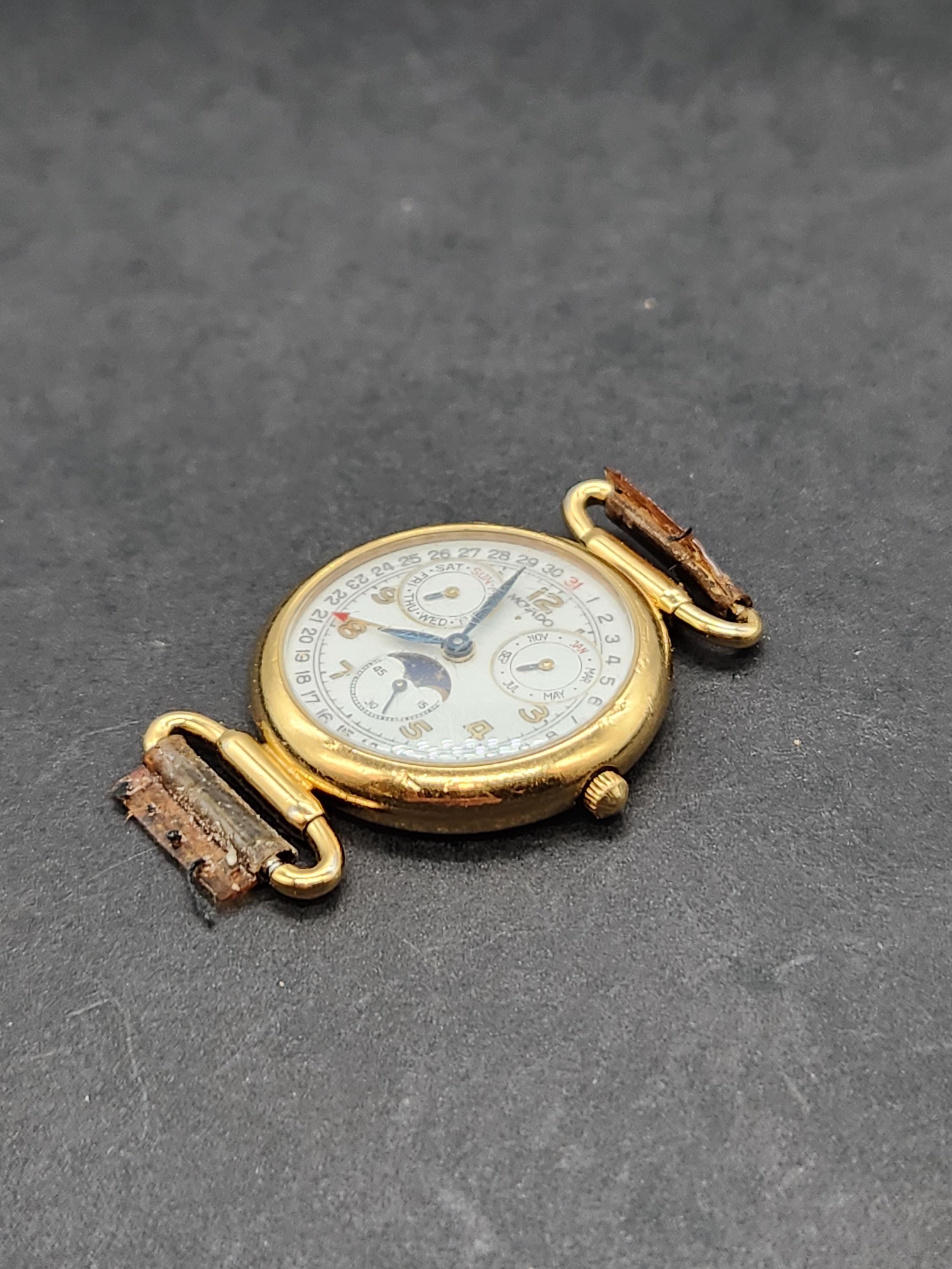 Crafted with a striking gold-tone finish and a durable stainless steel back, this watch is designed to impress. It features a fascinating triple calendar display alongside a captivating moon phase complication, powered by a precise 6 Jewels movement. The crystal exhibits some faint scratches and could be replaced for a flawless look. The stainless steel back also shows faint scratches consistent with its vintage charm. The watch currently has no watchband, but is ready for a new one of your choice. It was originally produced with a brown leather band if you want to restore it to its original state.