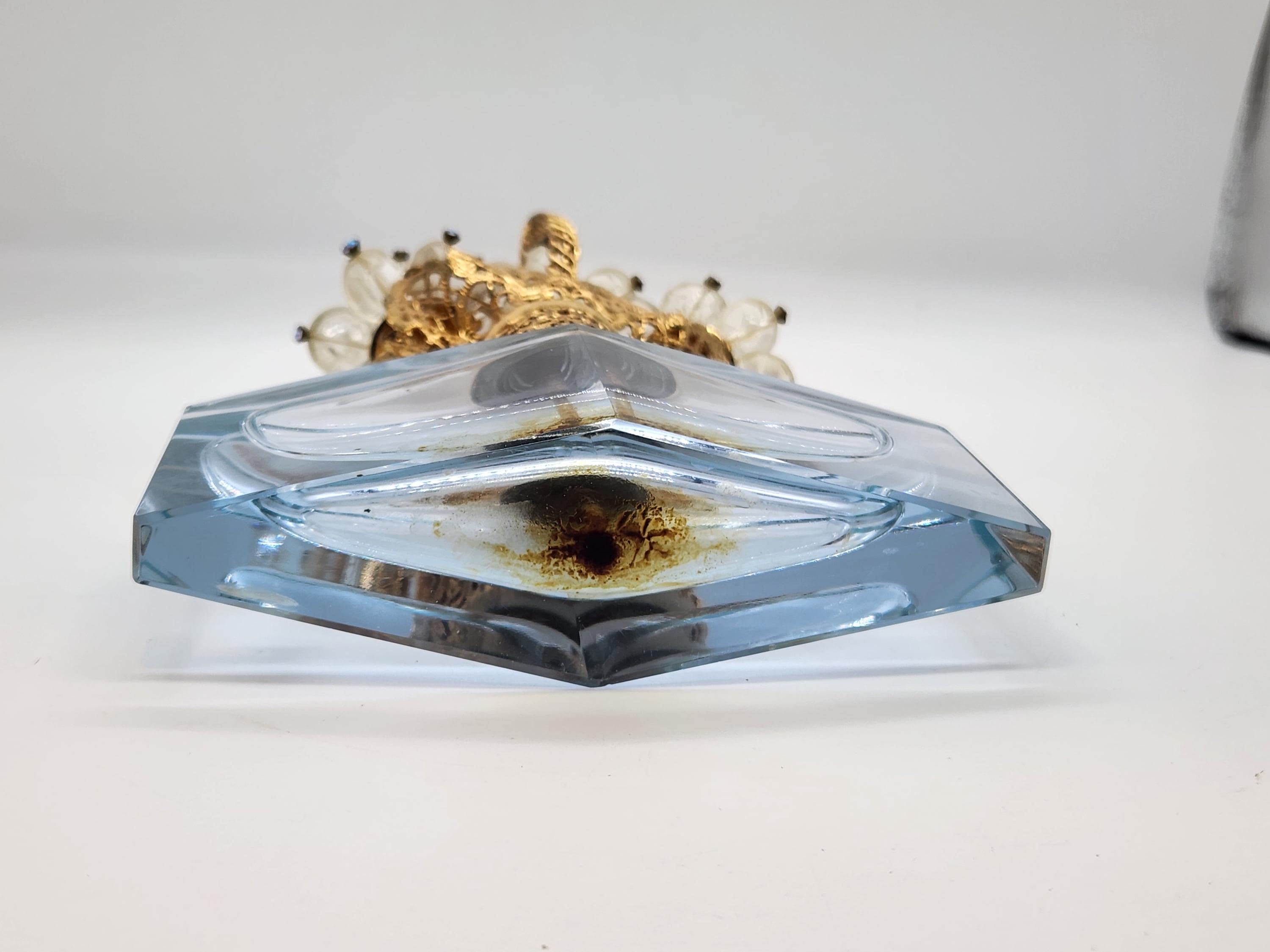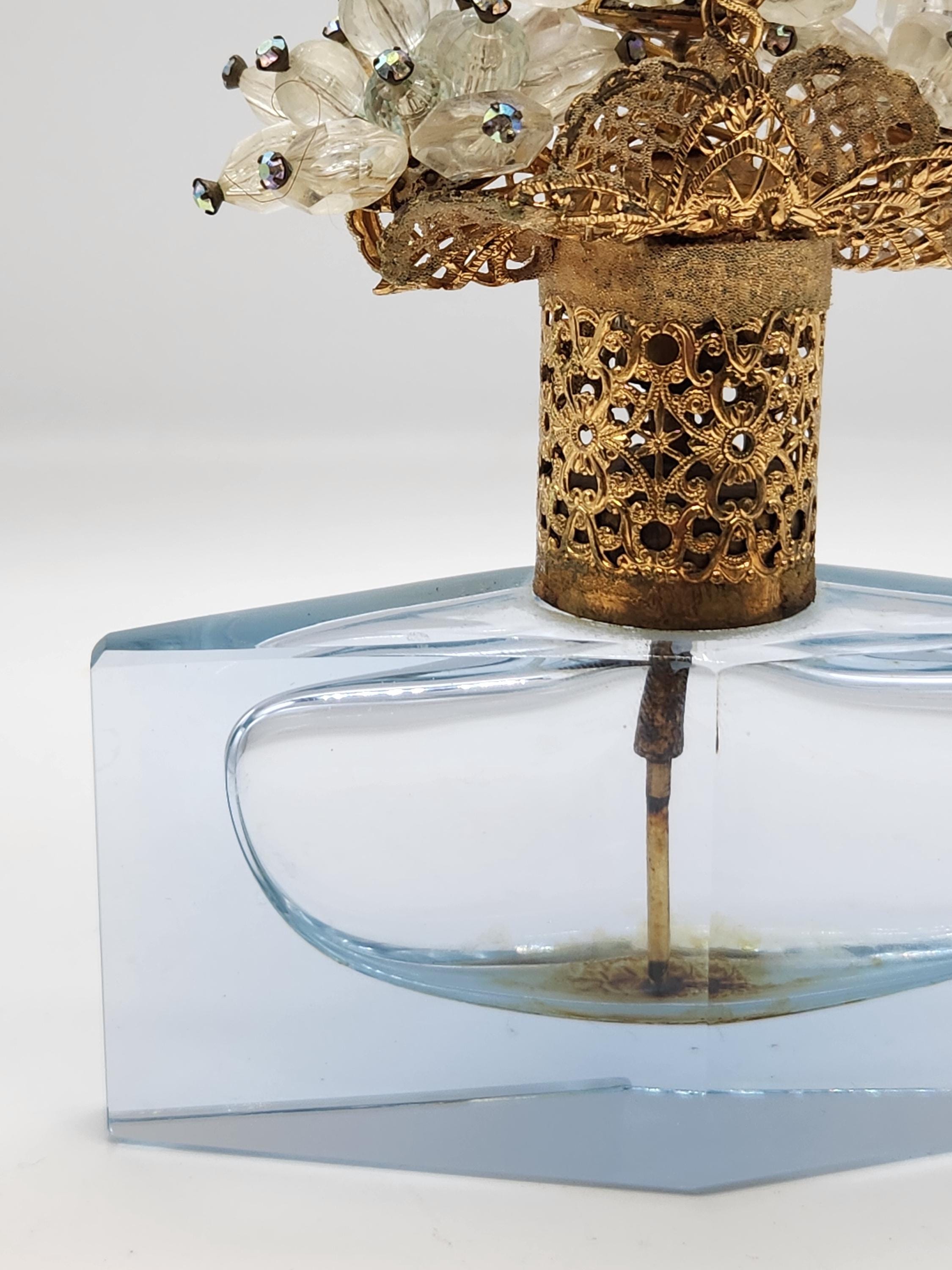 Crowning this magnificent bottle is a delicate brass filigree basket top, adorned with charming beaded flowers, adding an extra layer of intricate beauty and sophistication. Measuring a graceful 4.5 inches wide and standing 6 inches tall, it's perfectly sized to make a statement without overwhelming your vanity or display cabinet. This unique perfume bottle doesn't just hold fragrance; it embodies a bygone era of luxury and craftsmanship.