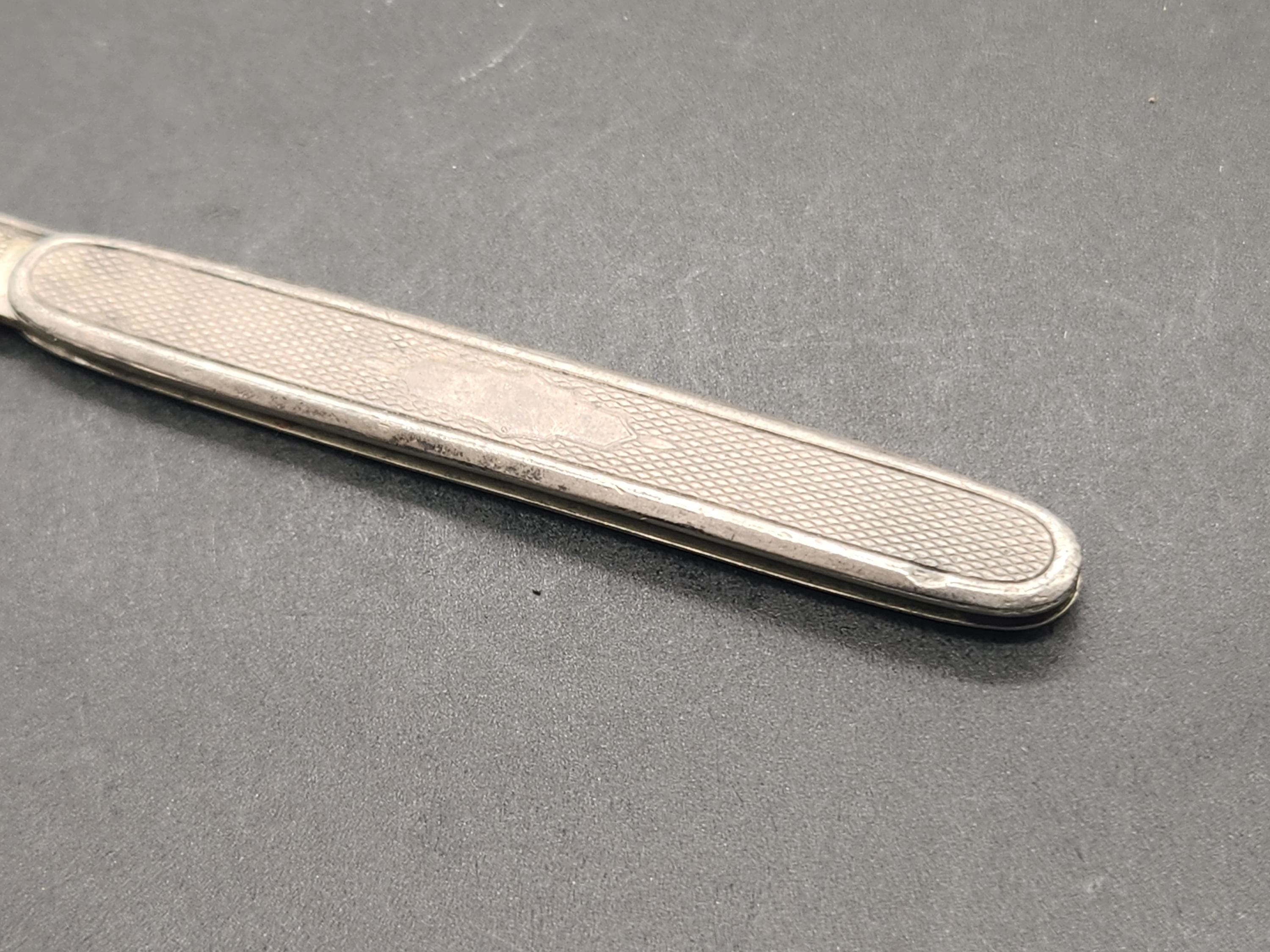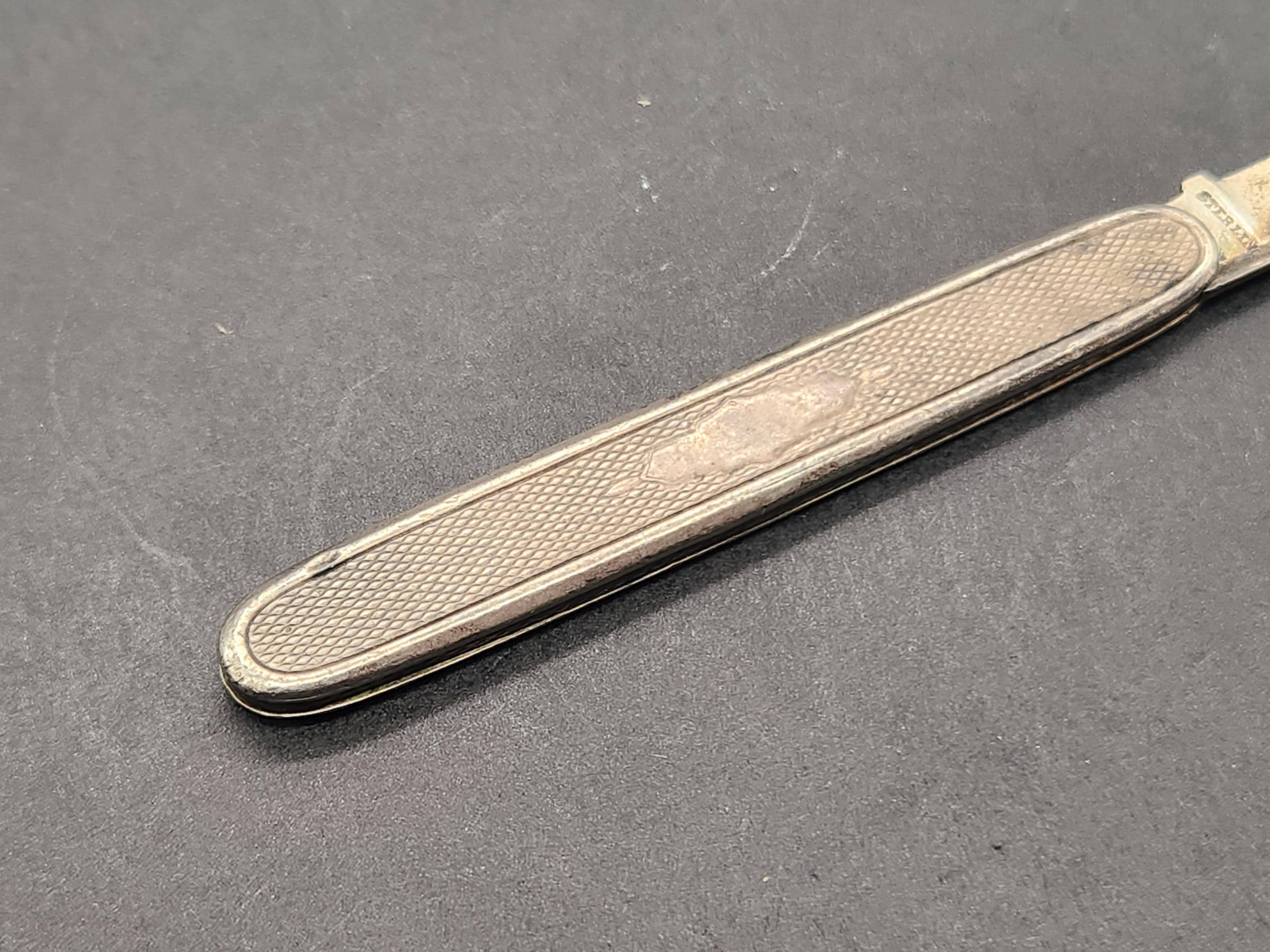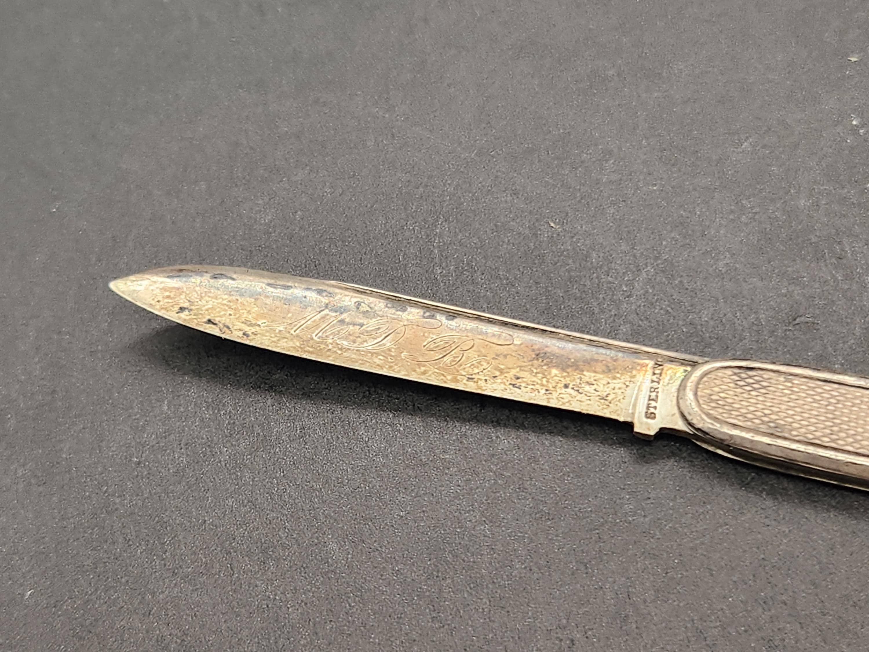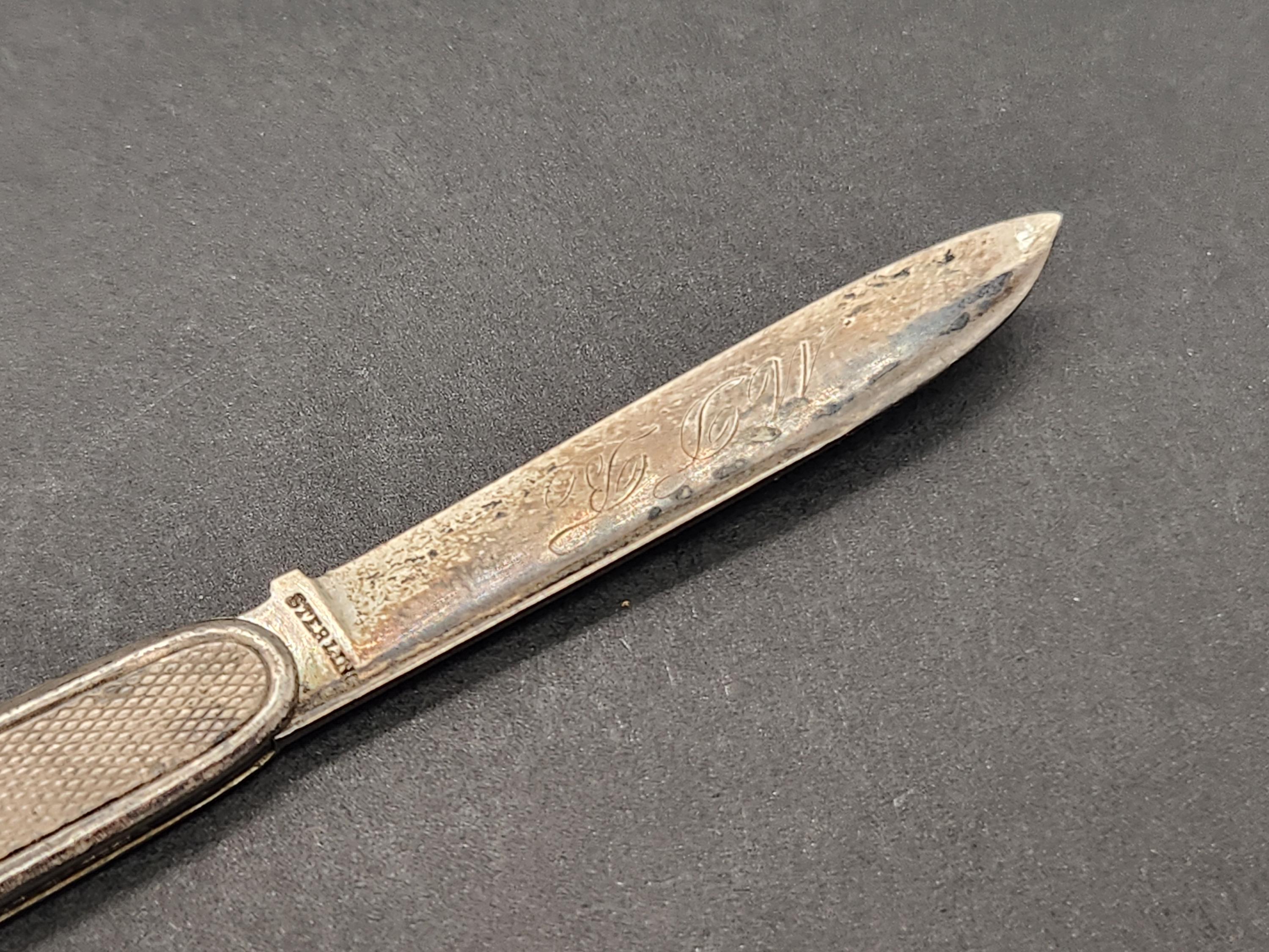 Uniquely, the blades themselves are also crafted from high-quality Sterling Silver, a rare and luxurious detail. One of the blades proudly bears the elegant engraving of the initials 'M.D.B.', adding a deeply personal and intriguing touch to its story. This monogrammed detail suggests a cherished possession, passed down through generations.