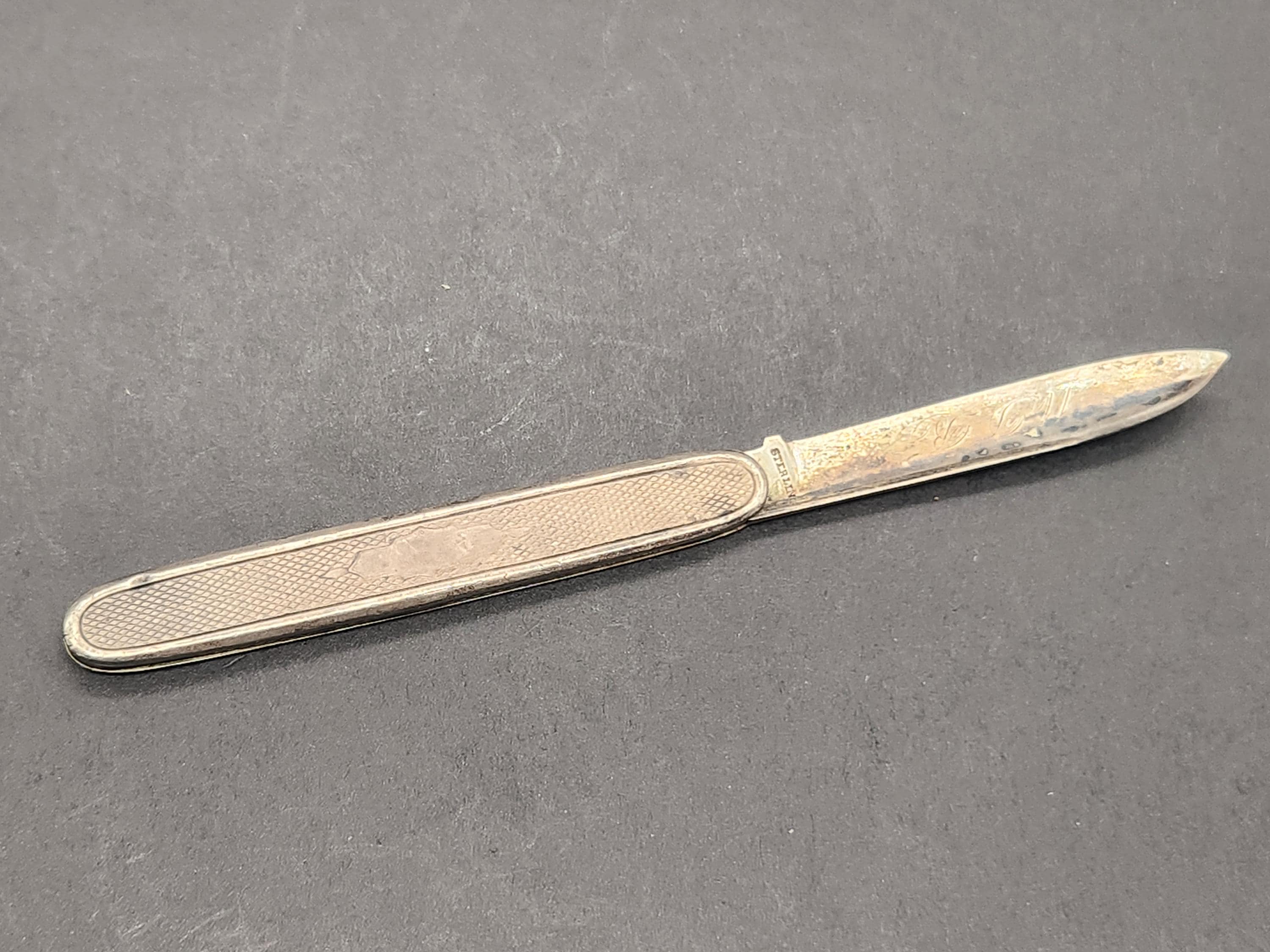 Measuring a compact 3 inches when closed, this unique folding fruit knife features two blades, perfect for everyday carry or as a distinguished collector's item. What truly sets this piece apart is its construction: the entire knife is encased in a beautiful silver case, with a clever metal strip inside that skillfully holds the two outer silver pieces together, ensuring durability and a seamless finish.
