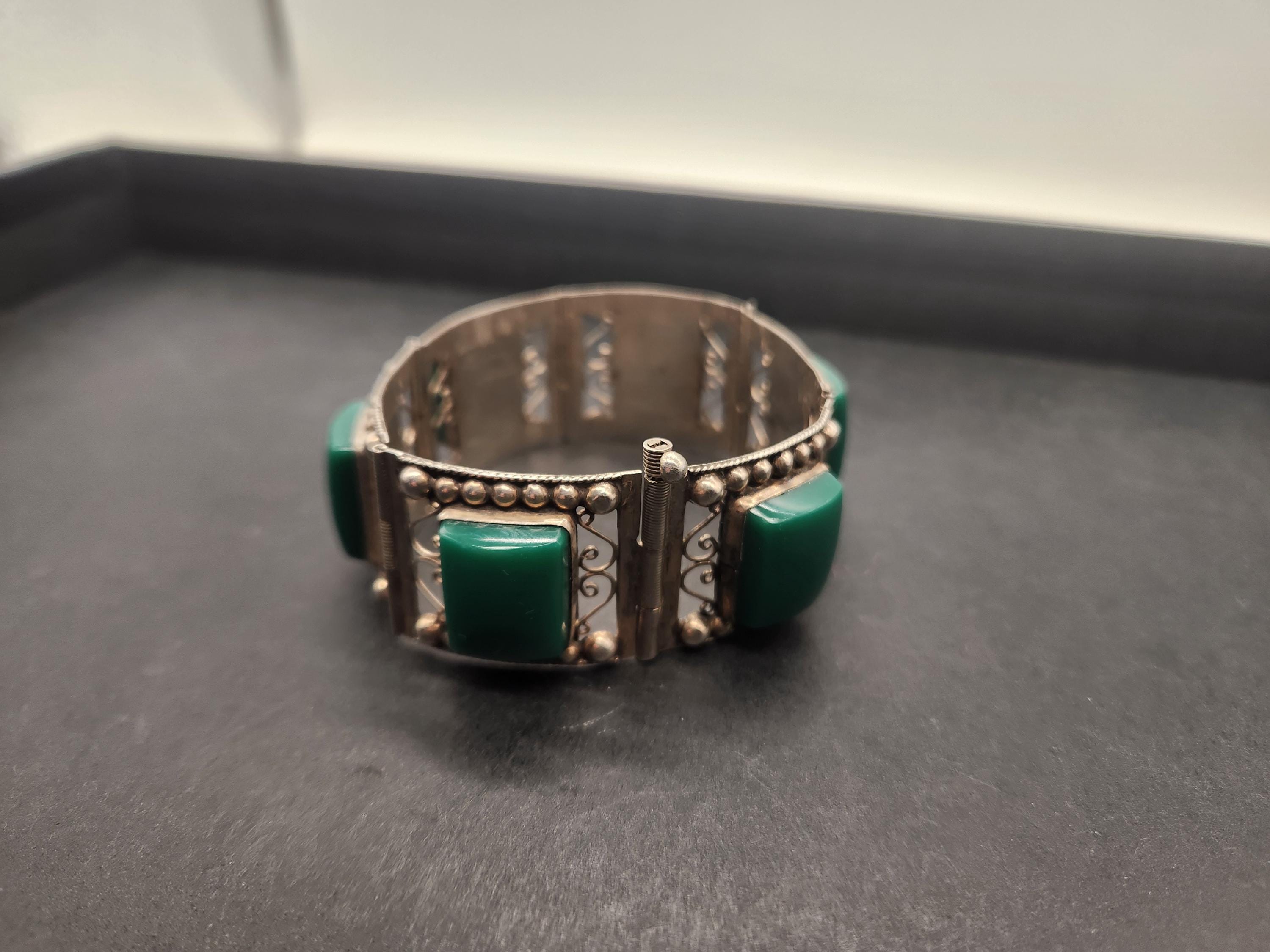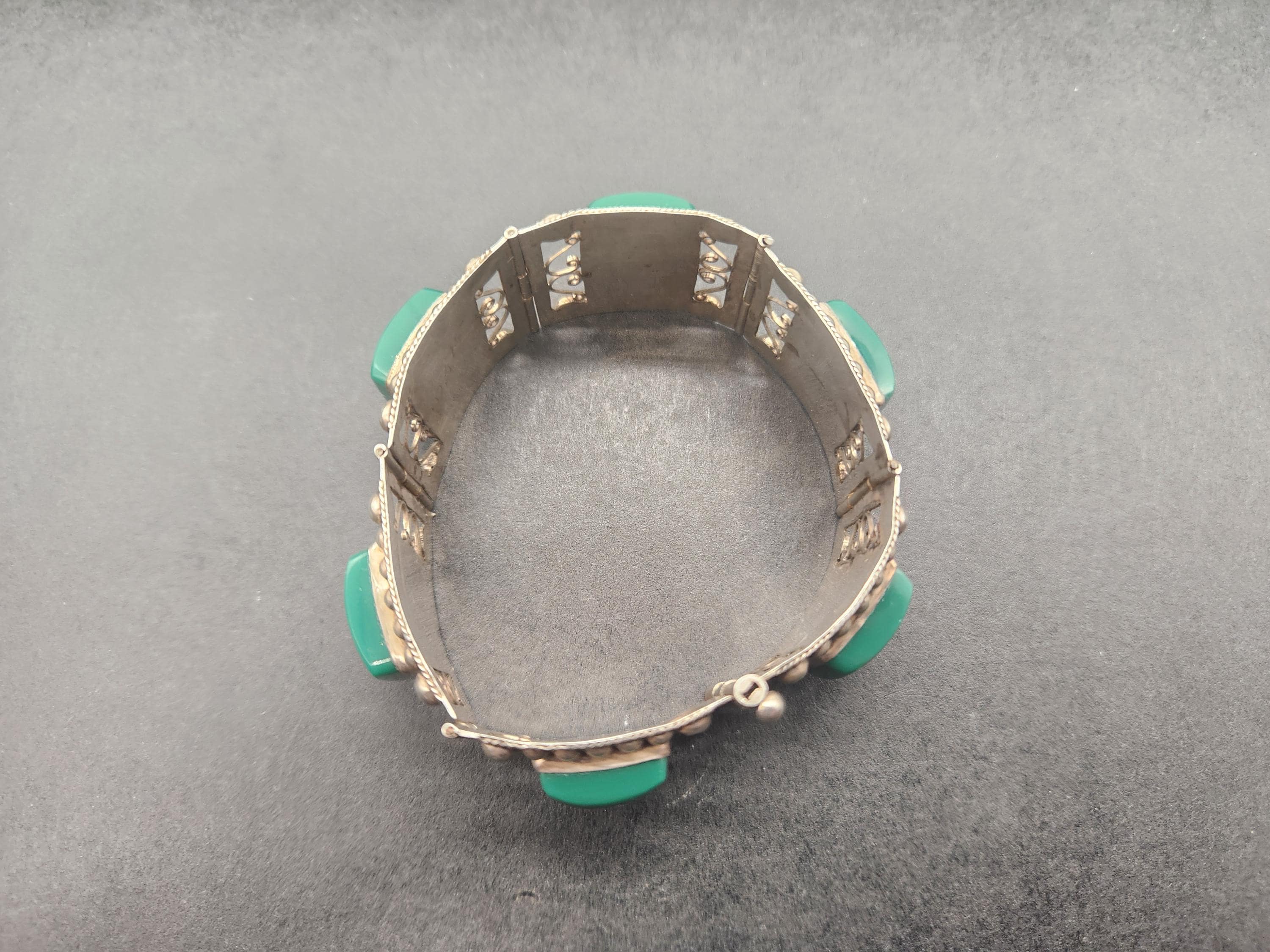Perfect for collectors of vintage jewelry, lovers of Art Deco design, or anyone seeking a distinctive statement piece. It makes an exceptional gift for a birthday, anniversary, or a special treat for yourself. Embrace the allure of yesteryear and add a touch of sophisticated glamour to any outfit with this magnificent green onyx bracelet.