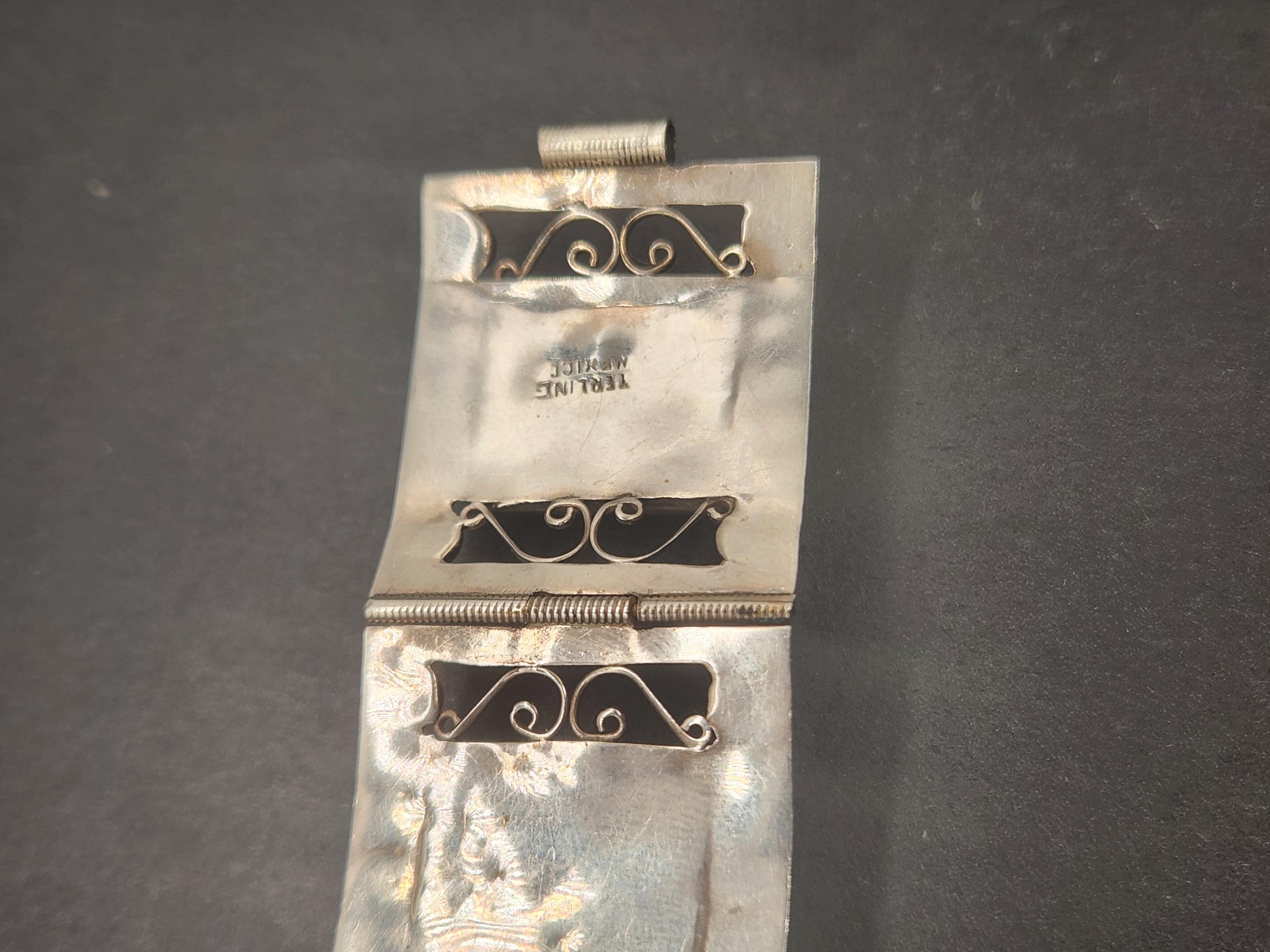 This stunning bracelet measures a comfortable 7 inches in length, making it perfect for most wrists. Its substantial presence is evident in its impressive weight of 42.5 grams, assuring you of its quality and craftsmanship. The piece is authentically marked "Mexico Sterling," a hallmark of genuine Mexican silver artistry from this period. This bracelet isn't just jewelry; it's a wearable piece of history, a conversation starter, and a unique expression of personal style.