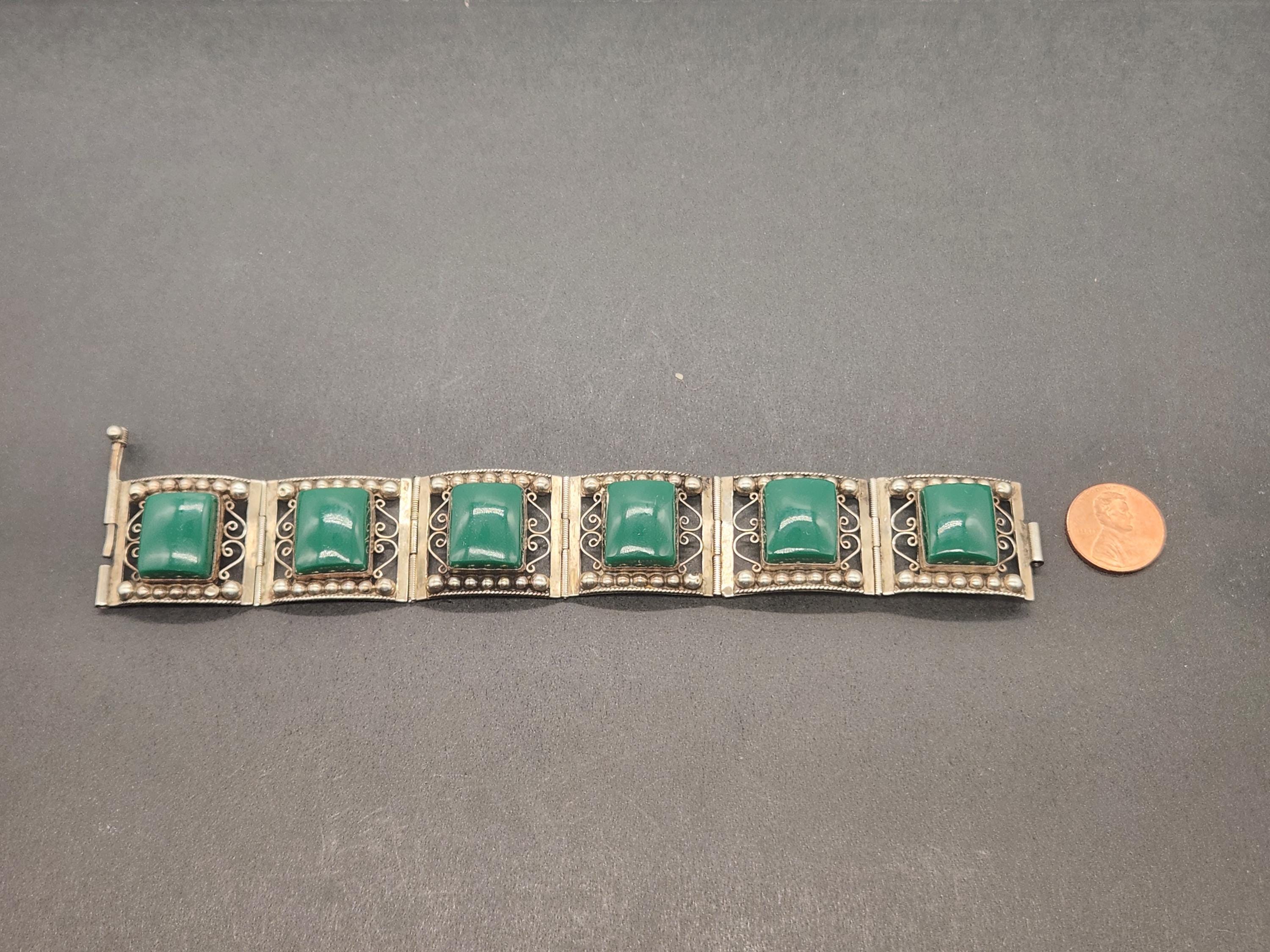 Step back in time with this exquisite Vintage Mexico Sterling Silver Green Onyx Chunky Panel Link Bracelet, a true testament to the sophisticated Art Deco era of the 1940s. Each bold 1-inch panel showcases a captivating oval of natural green onyx, meticulously set in gleaming sterling silver. The rich green hue of the onyx beautifully contrasts with the silver, creating a striking piece that exudes timeless elegance and old-world charm.