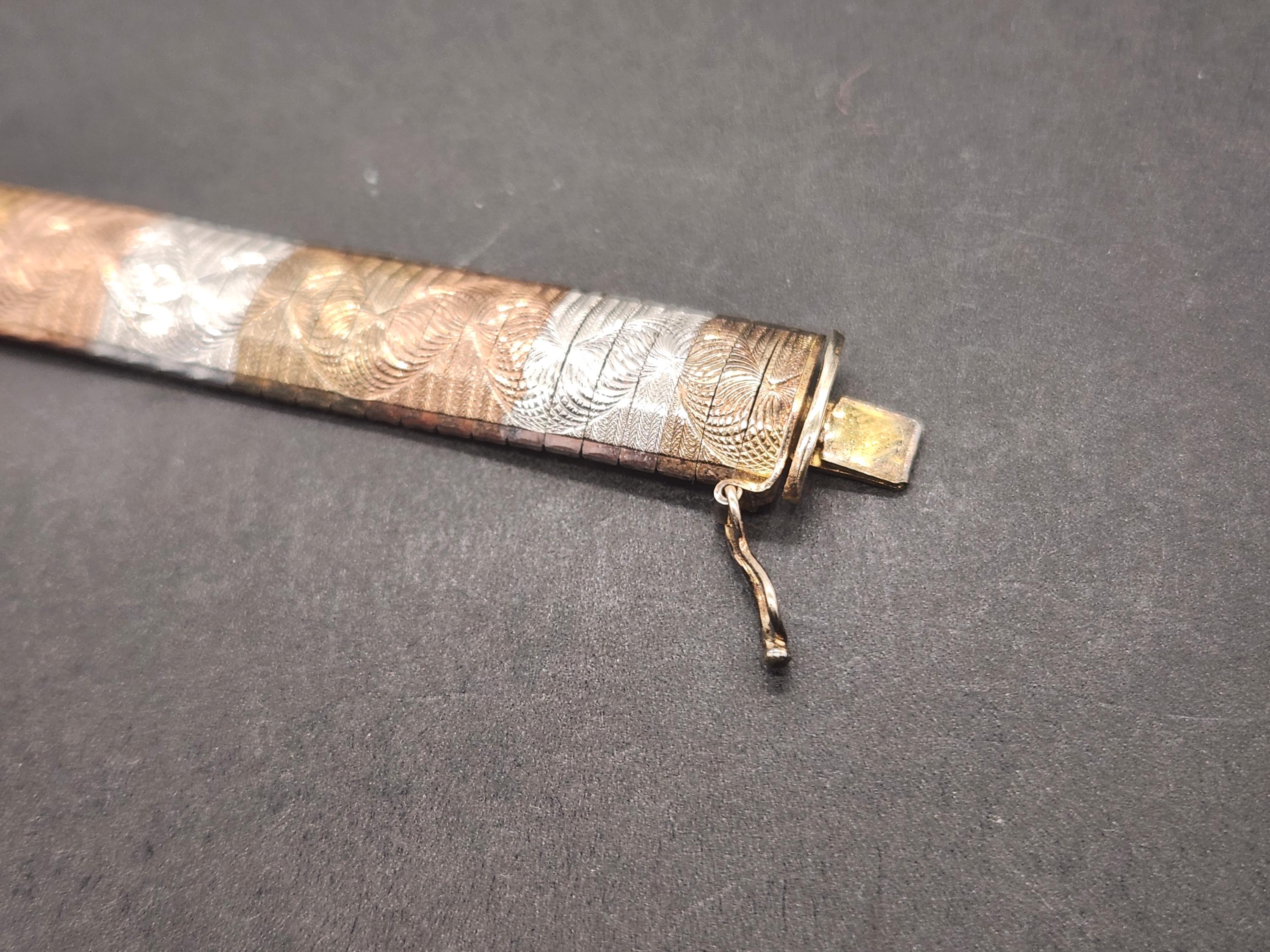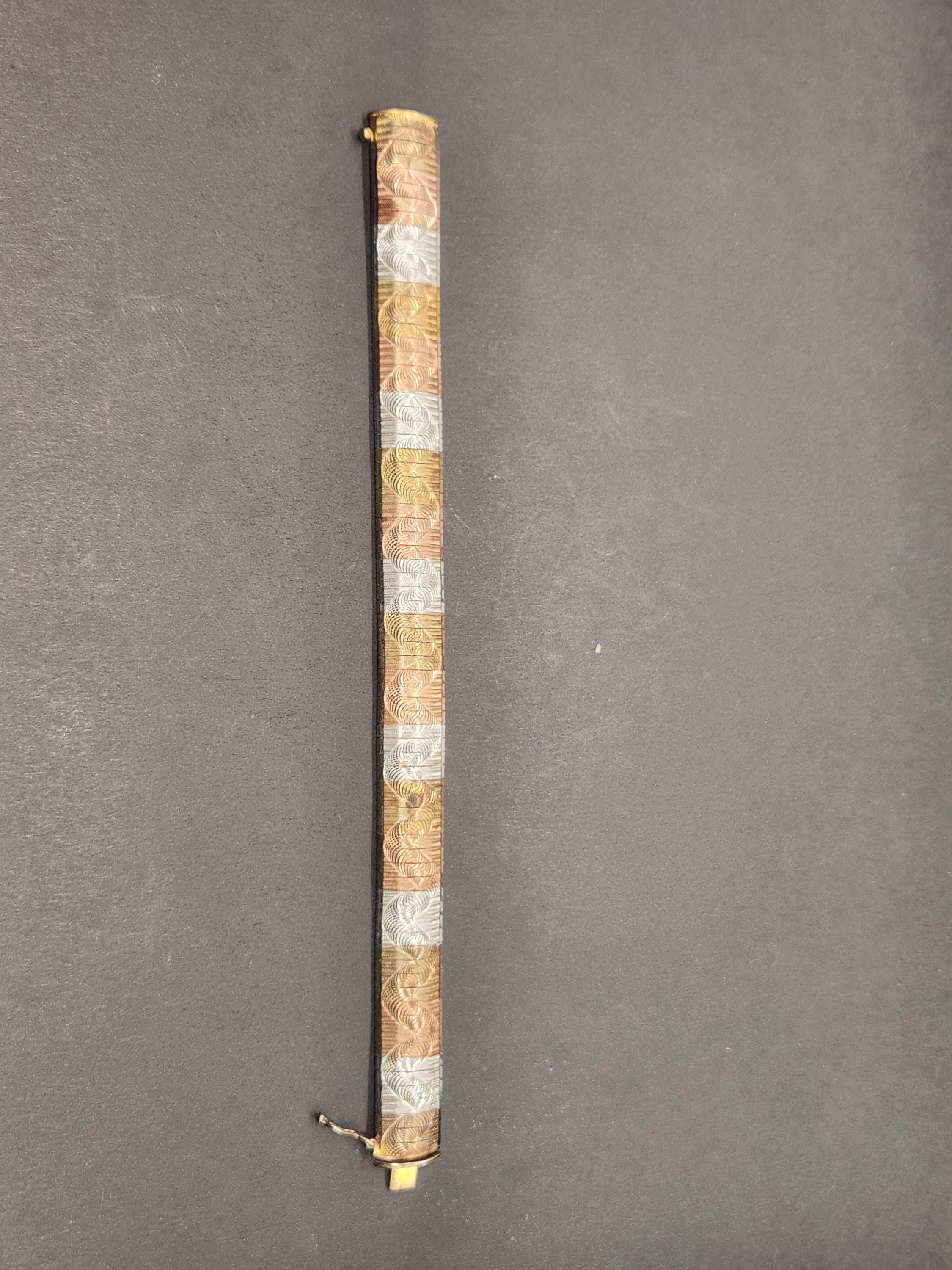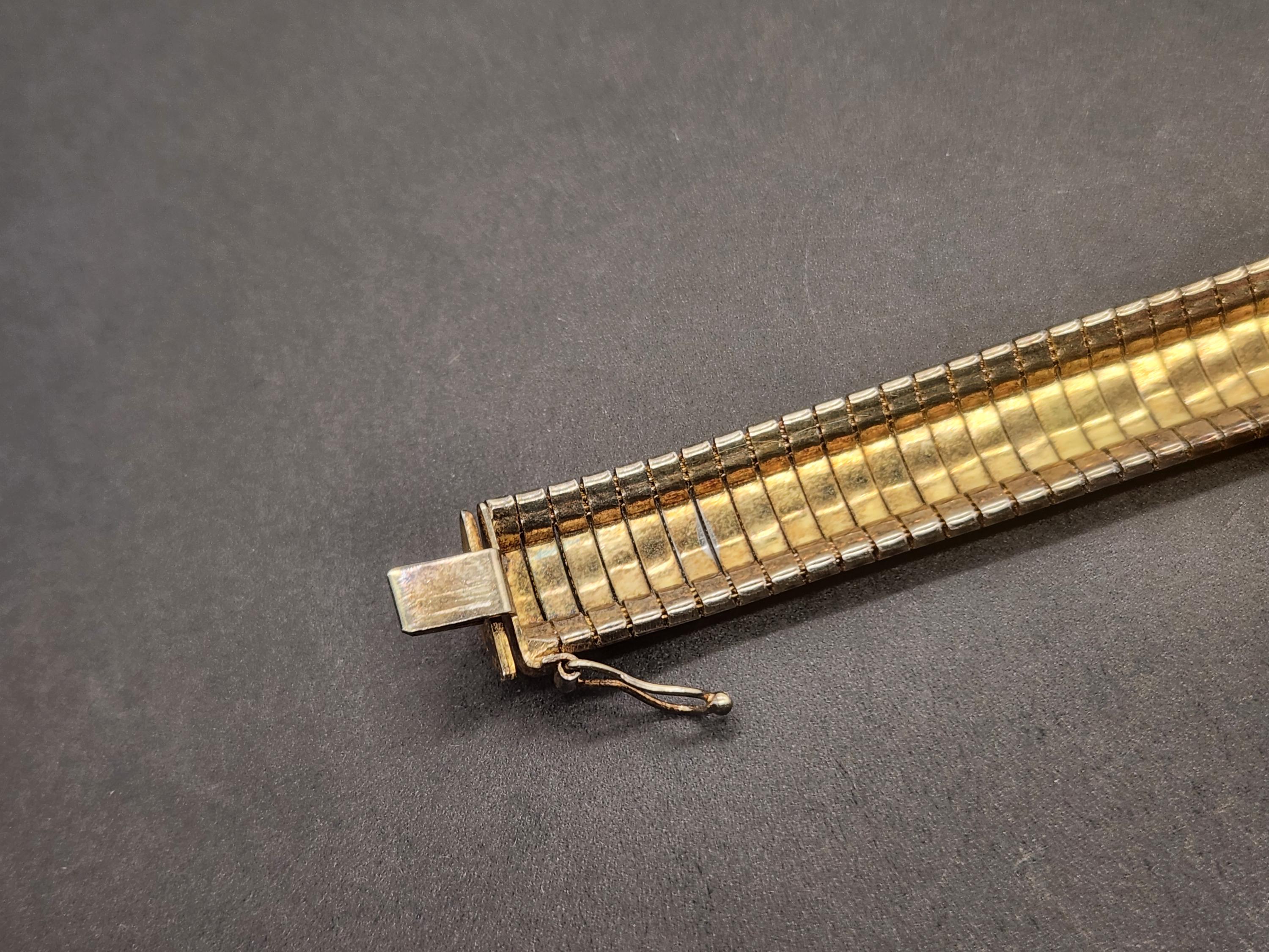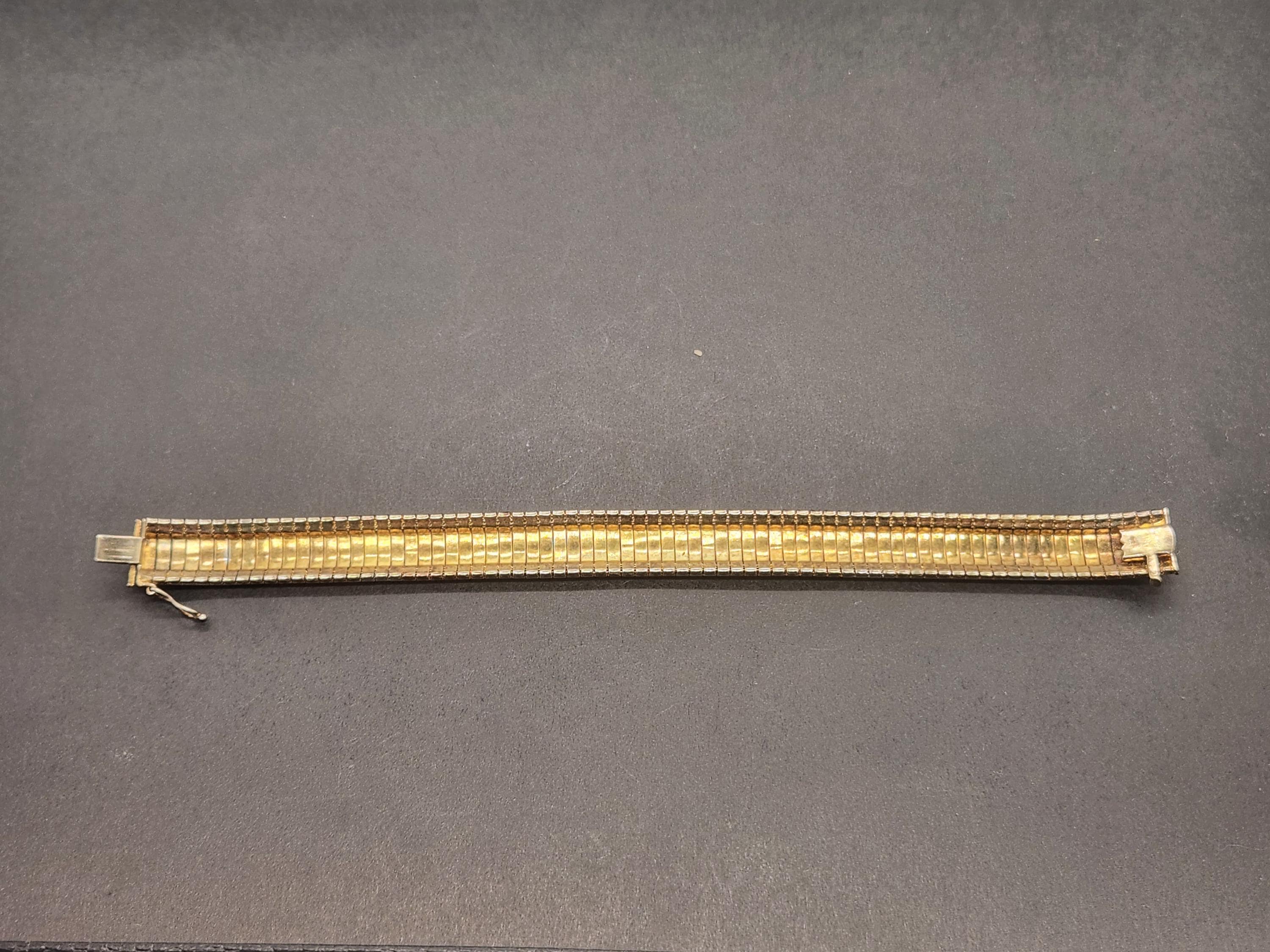 Discover timeless elegance with this exquisite Vintage Two-Tone Flex Bracelet, a true testament to Italian craftsmanship. This stunning piece features a luxurious yellow gold overlay on solid sterling silver, creating a captivating two-tone effect that adds depth and sophistication to any ensemble. Crafted in Italy, this bracelet boasts a wide, flexible design that gracefully drapes around your wrist, ensuring both comfort and style.
