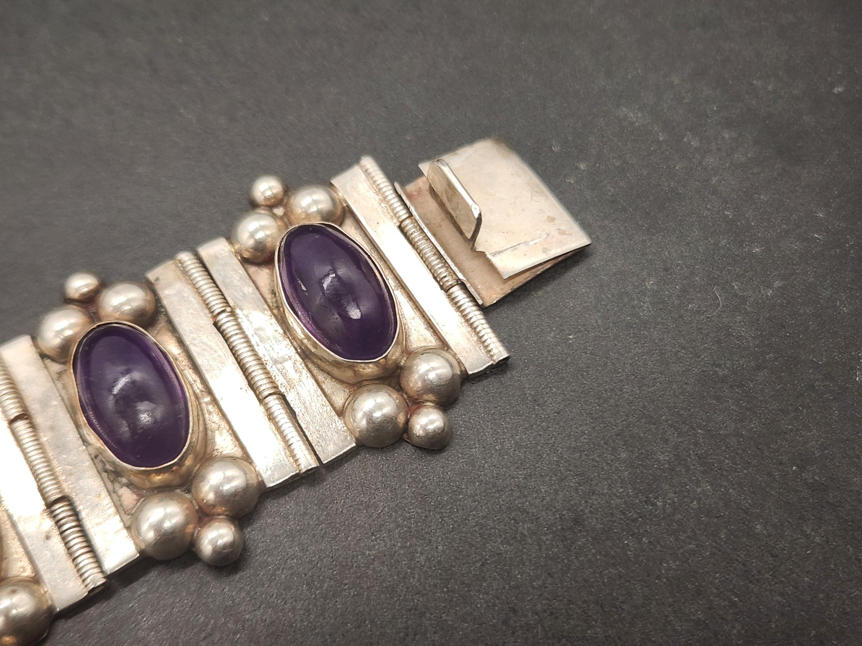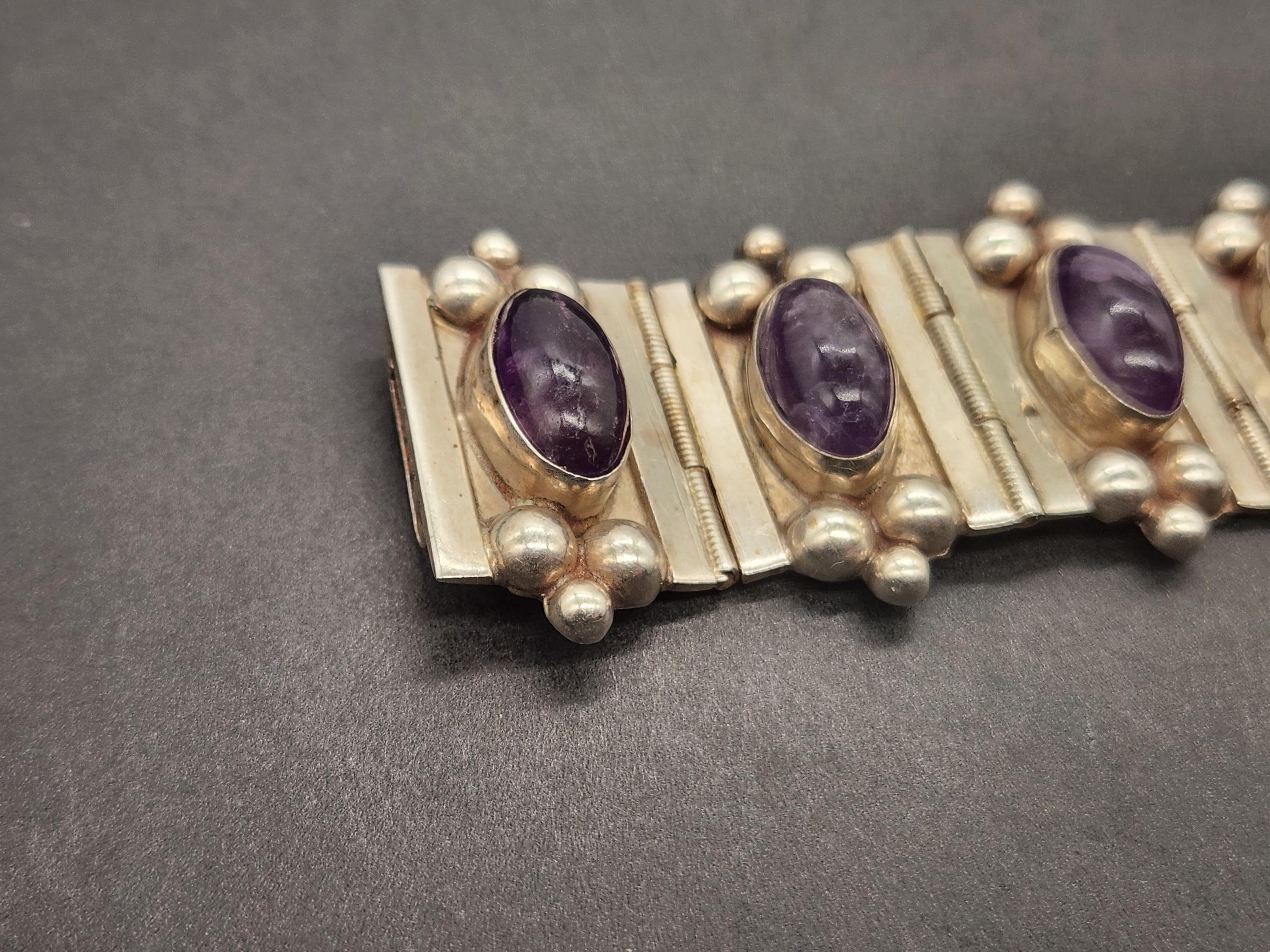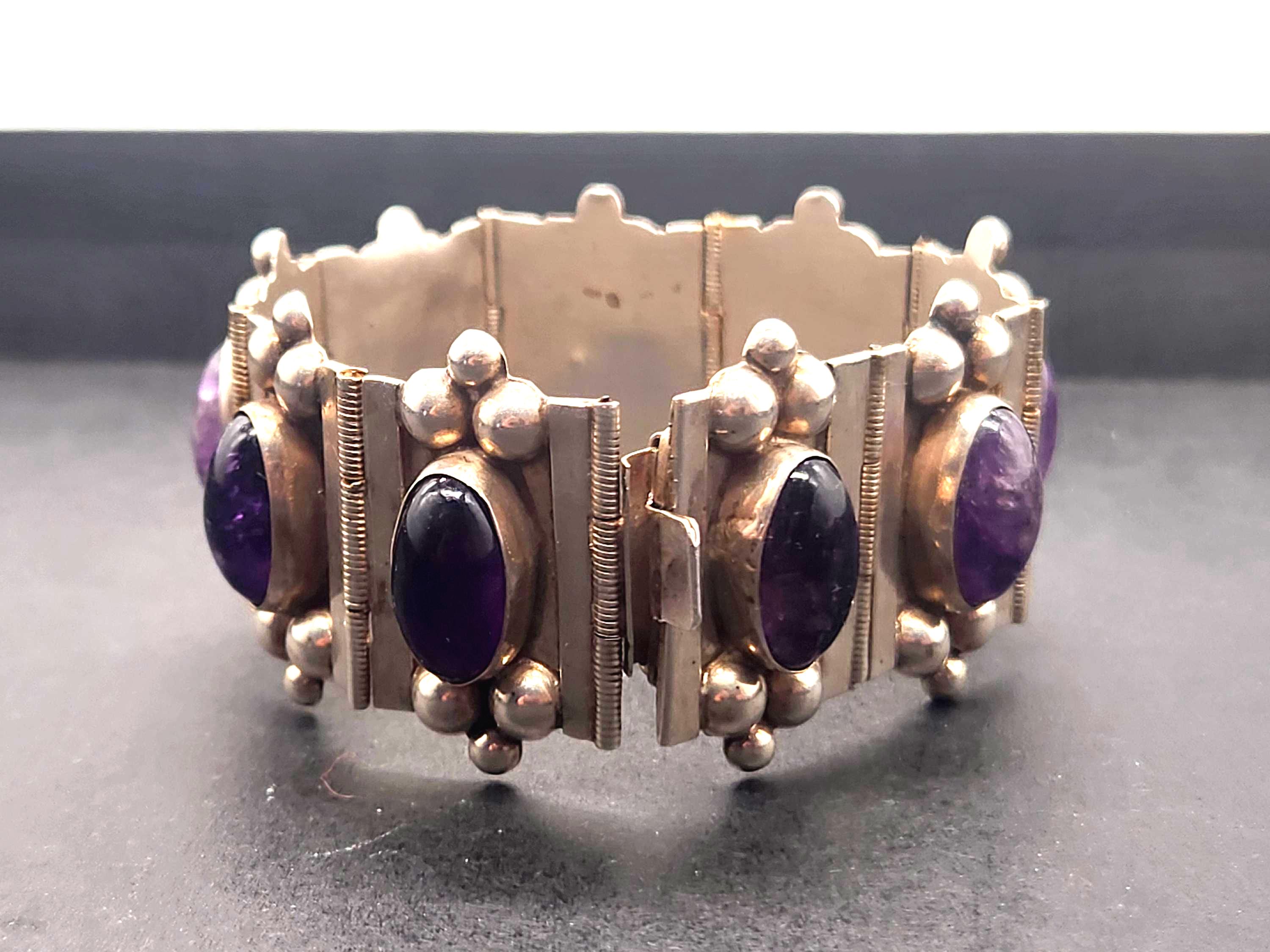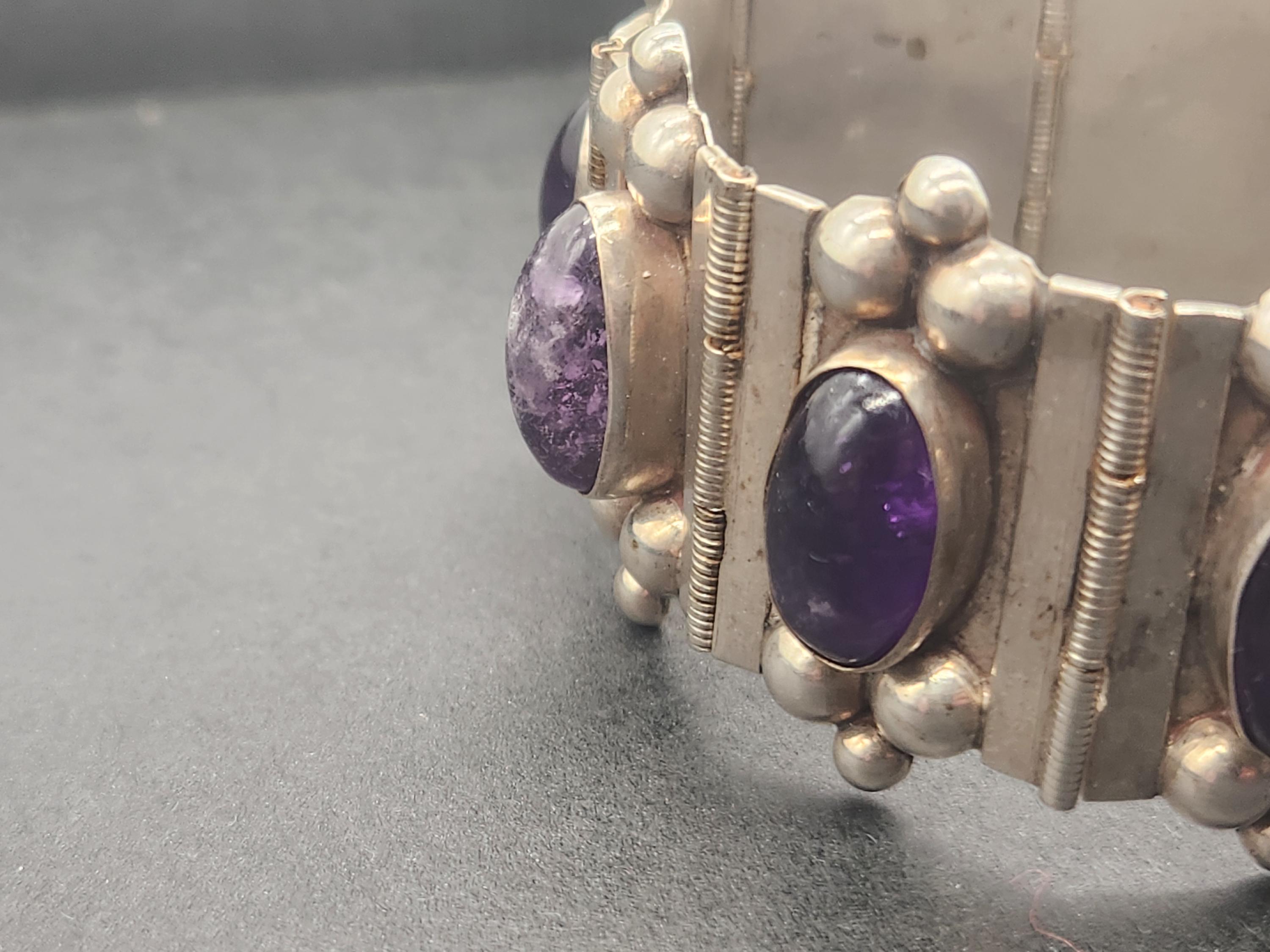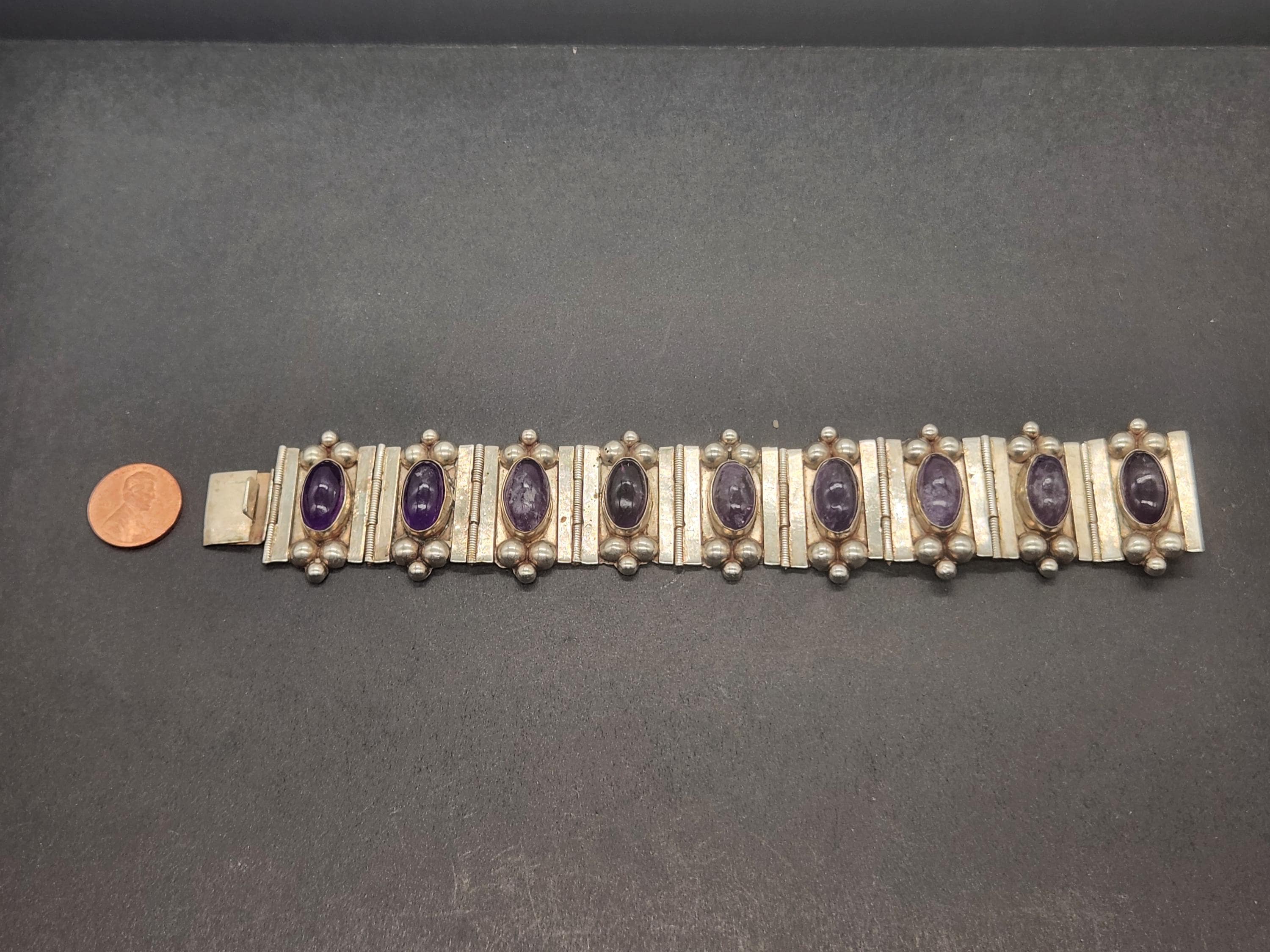 Step back in time with this exquisite Vintage Sterling Silver Mexico Purple Amethyst Chunky Panel Link Bracelet, a true testament to 1940s Art Deco elegance. This stunning piece captures the bold sophistication of its era, featuring vibrant purple amethyst stones meticulously set within substantial sterling silver panels. Each panel measures an impressive 1 inch, creating a striking presence on the wrist.