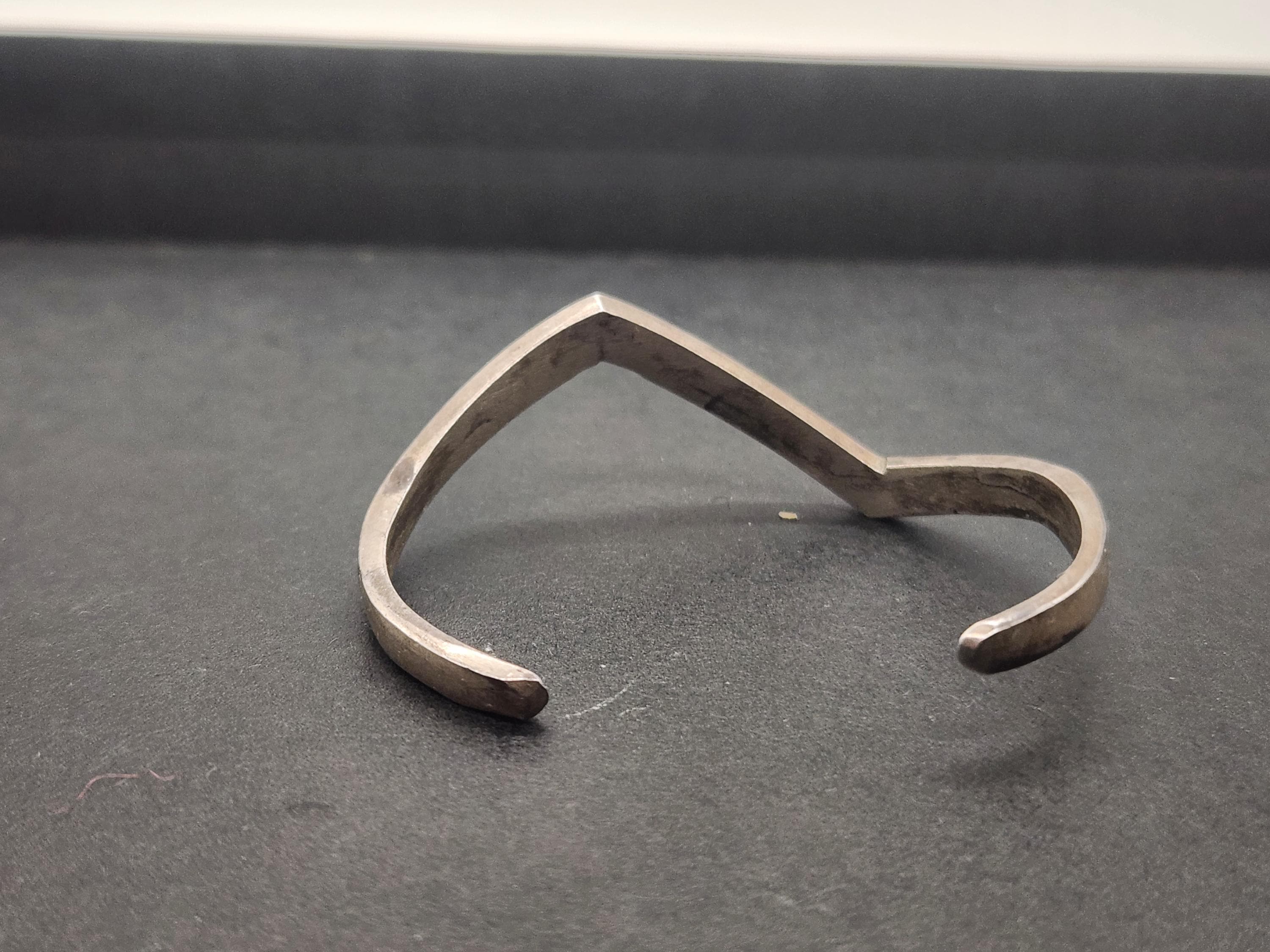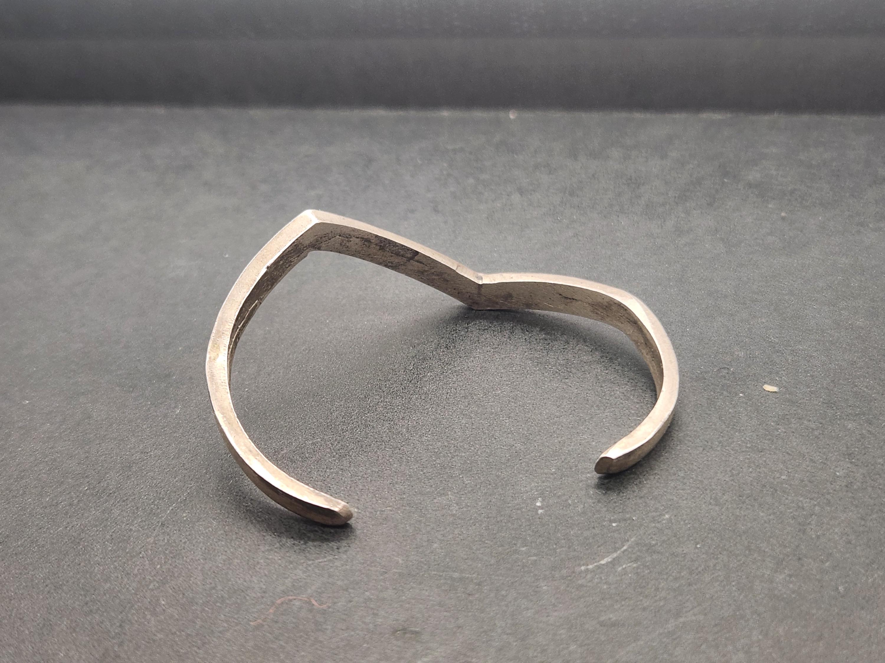 Crafted from sterling silver, this bracelet, while not marked, has been carefully tested to confirm its silver purity, ensuring both its quality and enduring value. Weighing approximately 12 grams, it offers a comfortable yet substantial feel. The intricate inlay work and classic Art Deco-inspired lines blend seamlessly with traditional Navajo aesthetics, making it a unique and cherished addition to any jewelry collection. Its vintage charm and authentic Native American heritage offer a connection to history and culture.