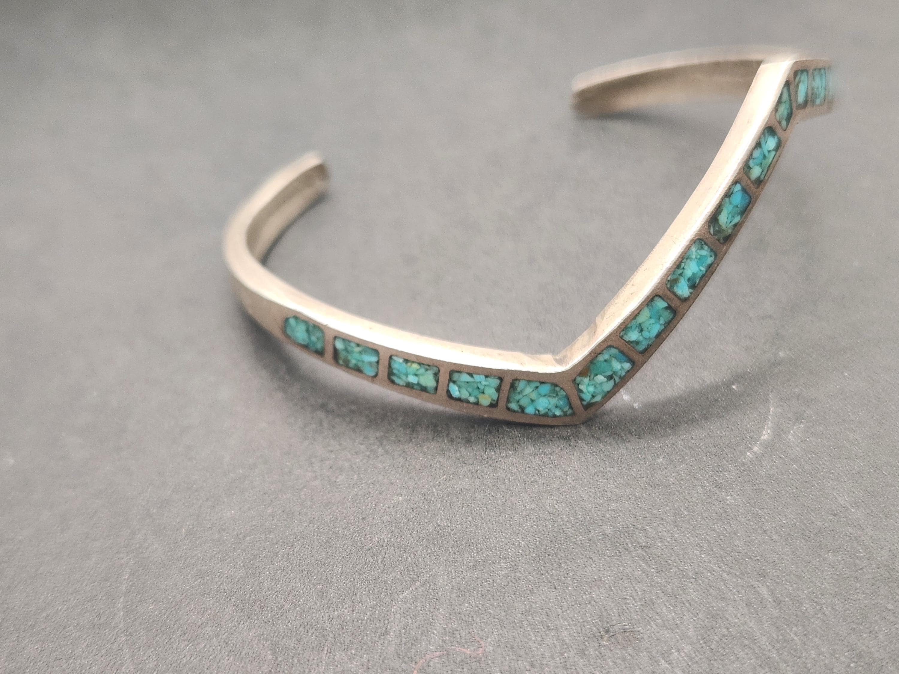 Perfect for collectors of Southwestern jewelry, vintage enthusiasts, or anyone seeking a unique accessory to express their individual style. This bracelet makes an exceptional gift for birthdays, anniversaries, or as a special treat for yourself. Embrace the allure of the past and add a touch of authentic elegance to your look with this remarkable turquoise chip cuff.