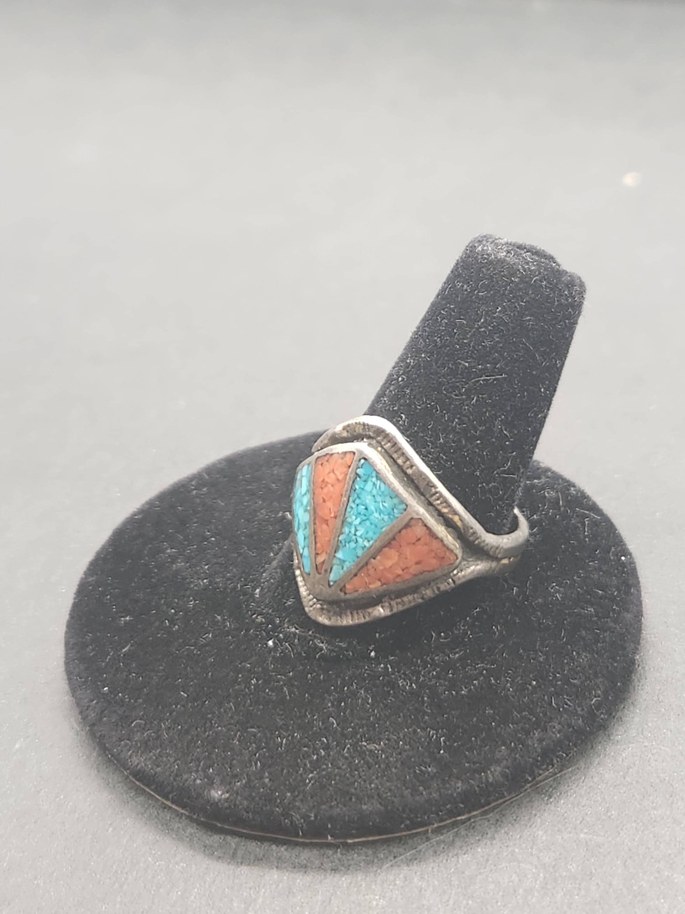 Step back in time with this exquisite Vintage Navajo Turquoise and Coral Chip Inlay Ring, a true testament to Southwestern artistry and Art Deco elegance. This stunning piece features a mesmerizing mosaic of vibrant turquoise and rich coral, meticulously hand-set in a chip inlay style that creates a captivating visual texture. The intricate design evokes the classic Art Deco aesthetic, blended seamlessly with the soulful craftsmanship of Navajo tradition.