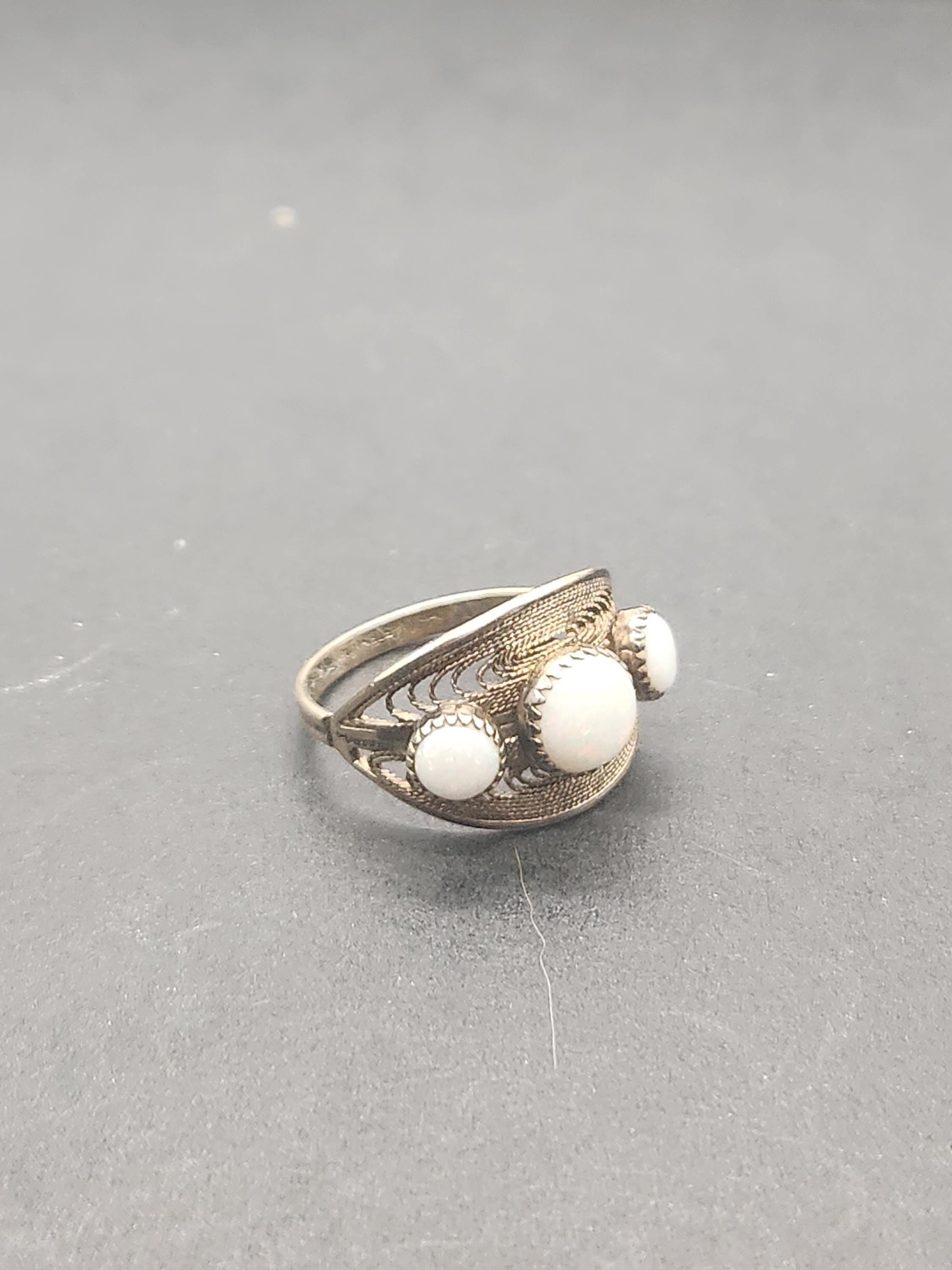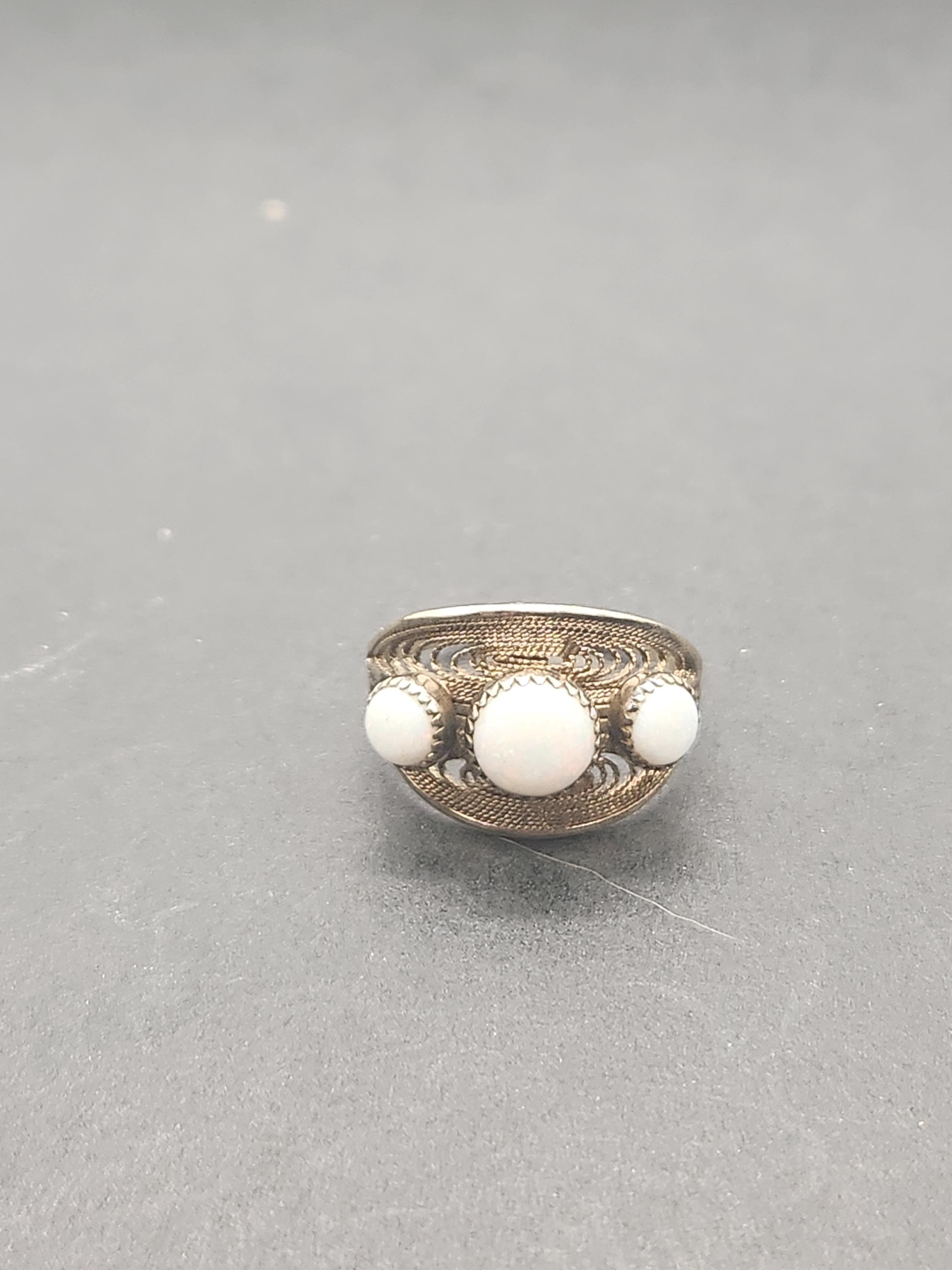 Step back in time with this exquisite Vintage 3 Stone Opal Filigree Ring, a true testament to timeless elegance and craftsmanship. This captivating piece features three brilliant, colorful opals, each radiating a unique play of light that will mesmerize onlookers. The opals are securely set in a nice setting, showcasing their natural beauty against the intricate filigree design.