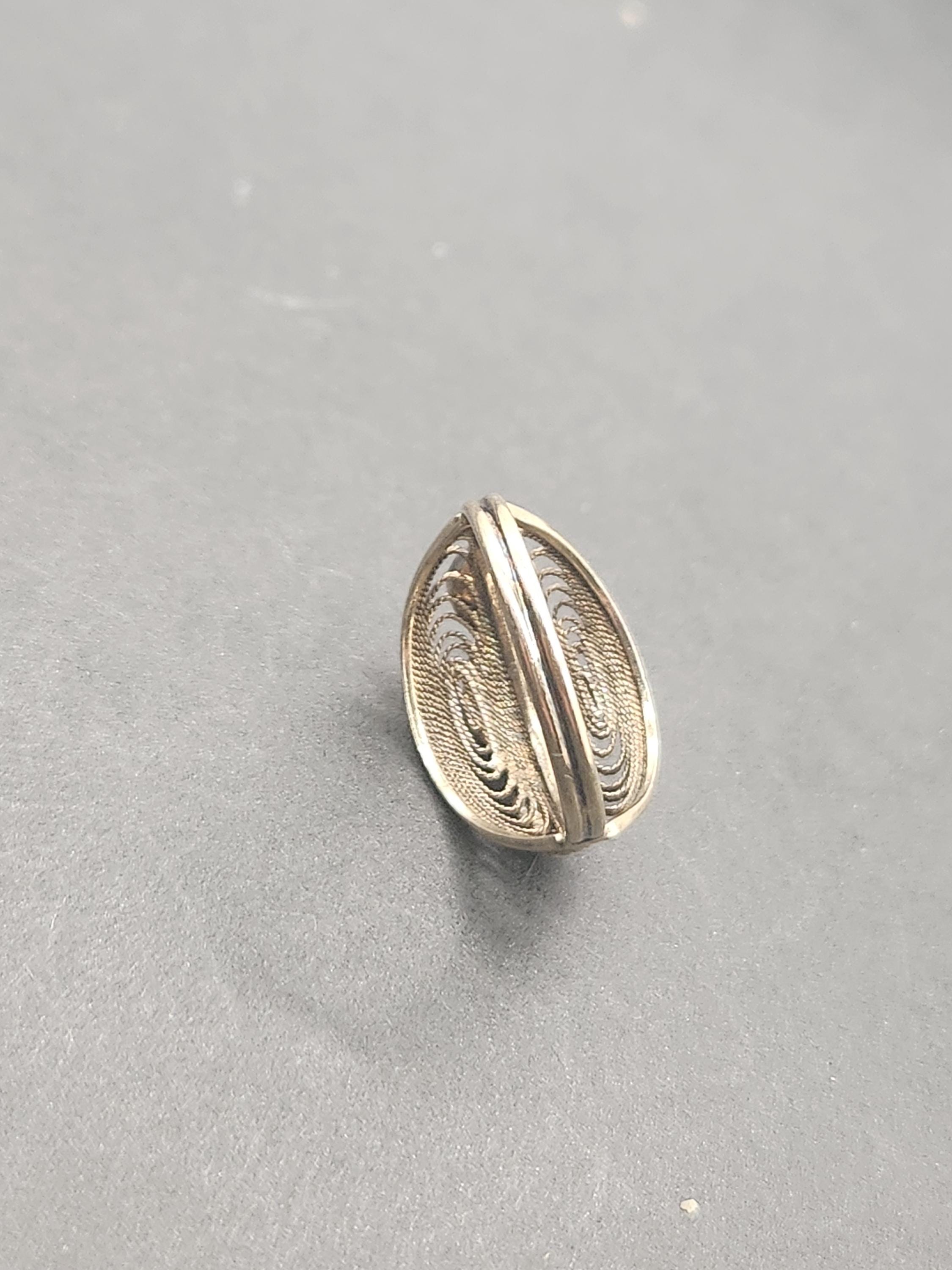 Crafted from high-quality gold over sterling silver, this ring offers the luxurious look of gold with the durability and affordability of sterling silver, making it a perfect addition to any jewelry collection. The band is clearly marked "Sterling," assuring its authenticity and material quality. Sized at a comfortable Size 8, it's ready to adorn your finger or be presented as a thoughtful gift. The detailed filigree work adds a touch of vintage charm, making it a unique statement piece.