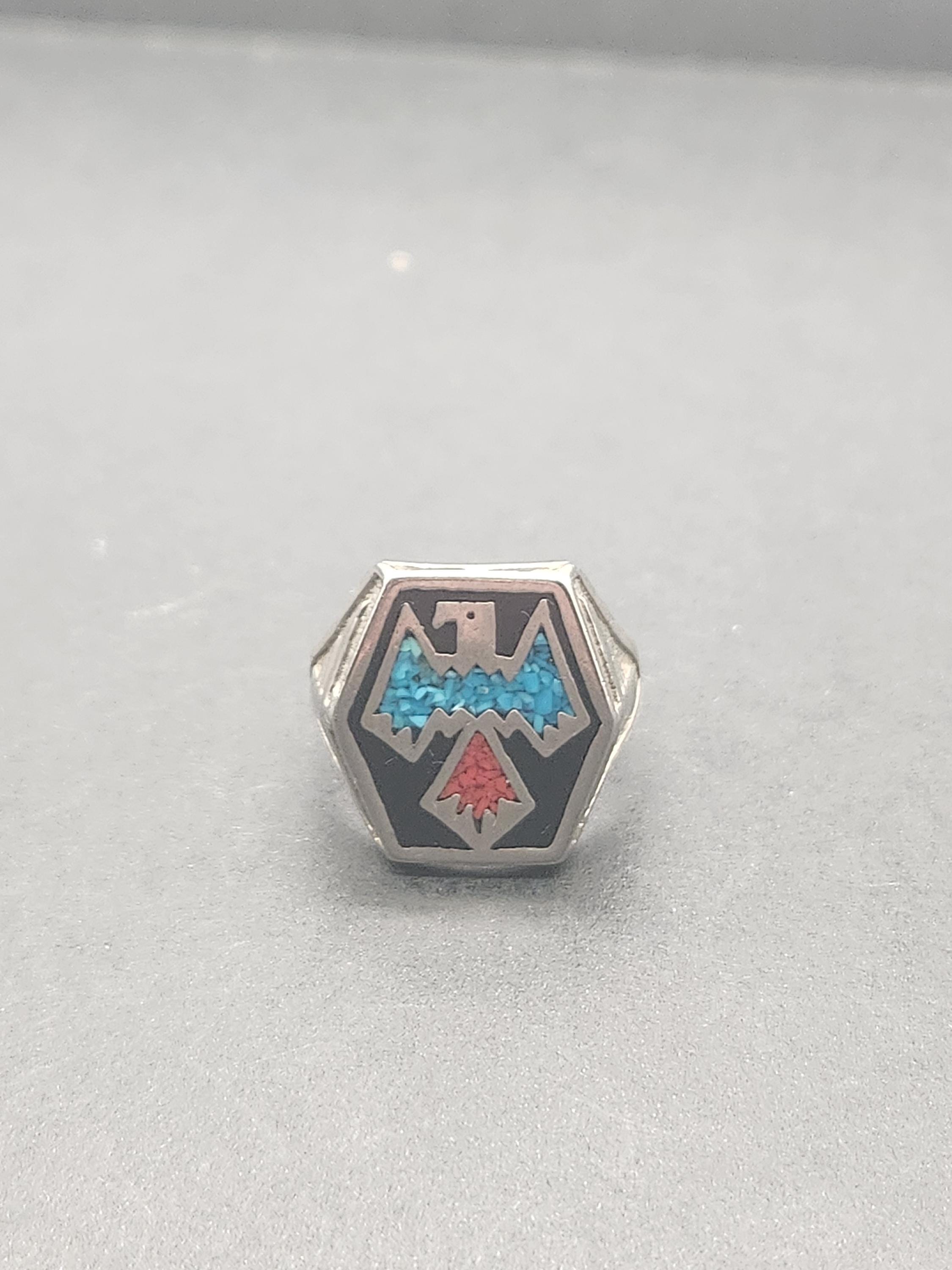Step back in time with this extraordinary 1950s Navajo Thunderbird Cocktail Ring, a true testament to vintage Native American craftsmanship. This striking piece features a meticulously crafted Thunderbird design, brought vibrantly to life through intricate turquoise and coral chip inlay. Each tiny piece of natural stone is carefully set, creating a mesmerizing mosaic that catches the light beautifully.