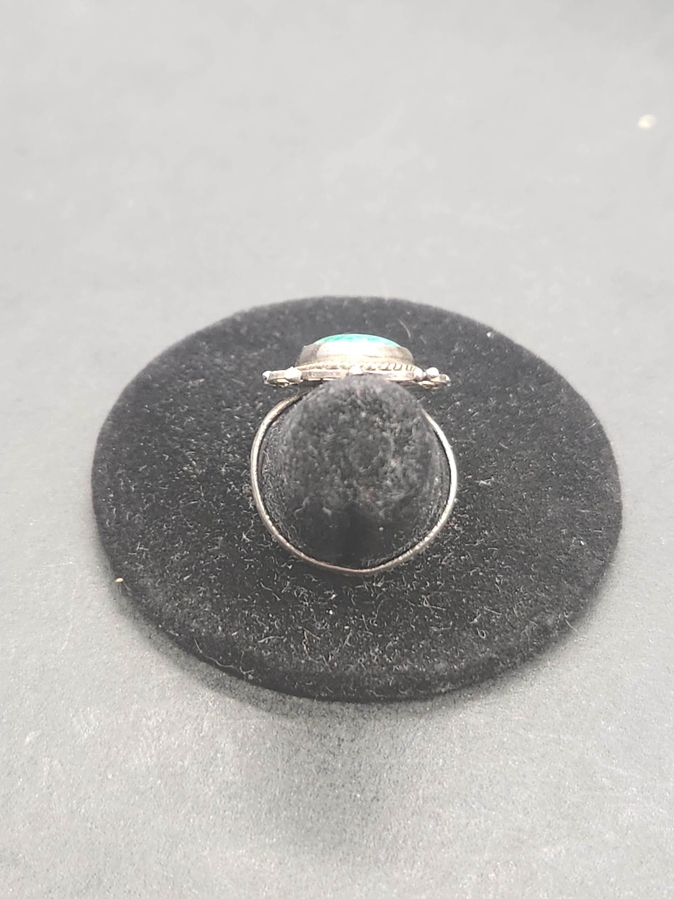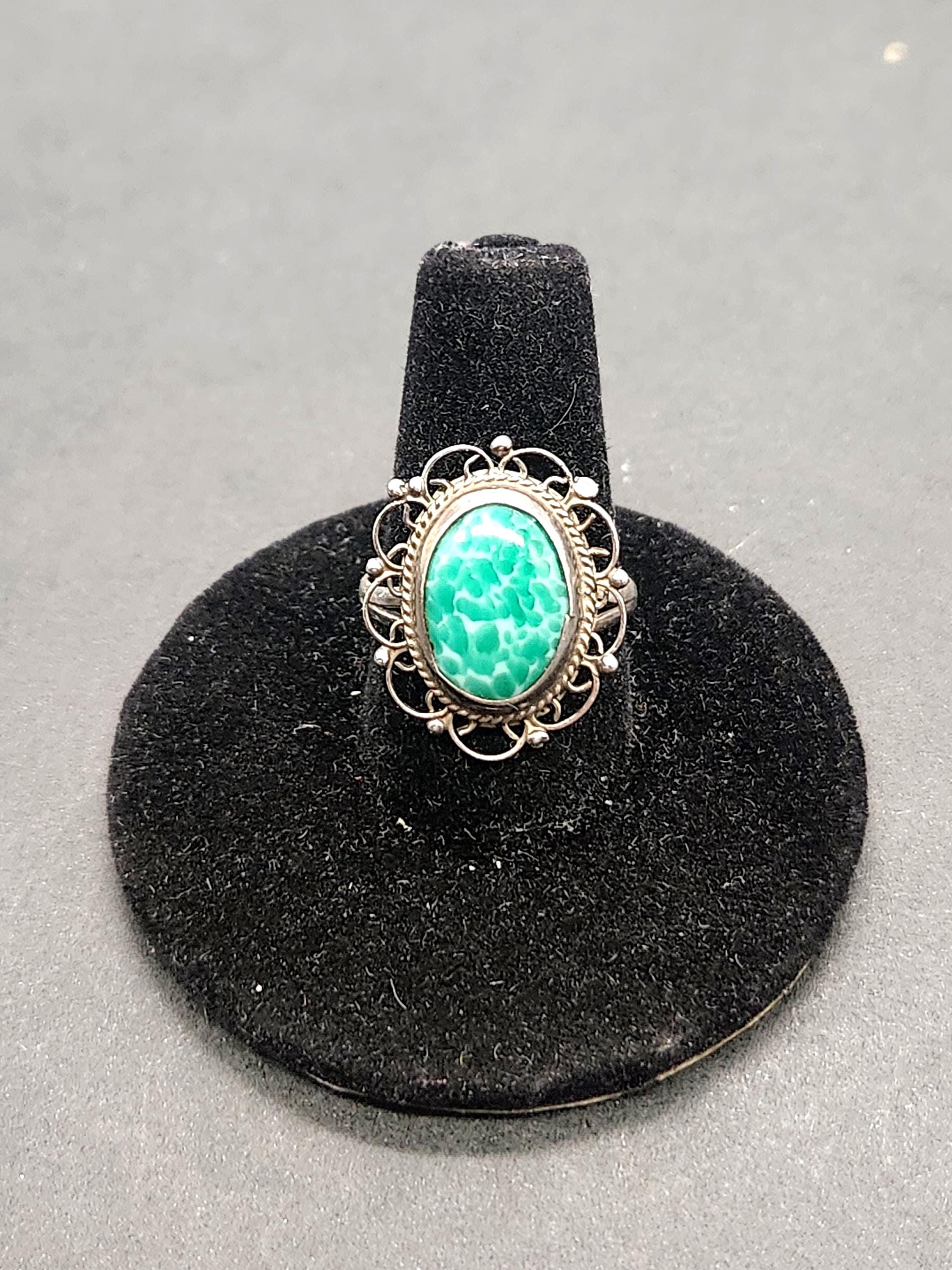 Step back in time with this exquisite Vintage 1950s Navajo Deep Green Peking Glass Filigree Ring, a true testament to mid-century Southwestern artistry. Crafted from genuine Sterling Silver, this ring features a captivating deep green piece of vintage Peking Glass, known for its unique and alluring hue, set majestically within intricate filigree detailing. The delicate silverwork beautifully frames the vibrant gemstone, showcasing the skilled craftsmanship characteristic of Navajo jewelry from this era.