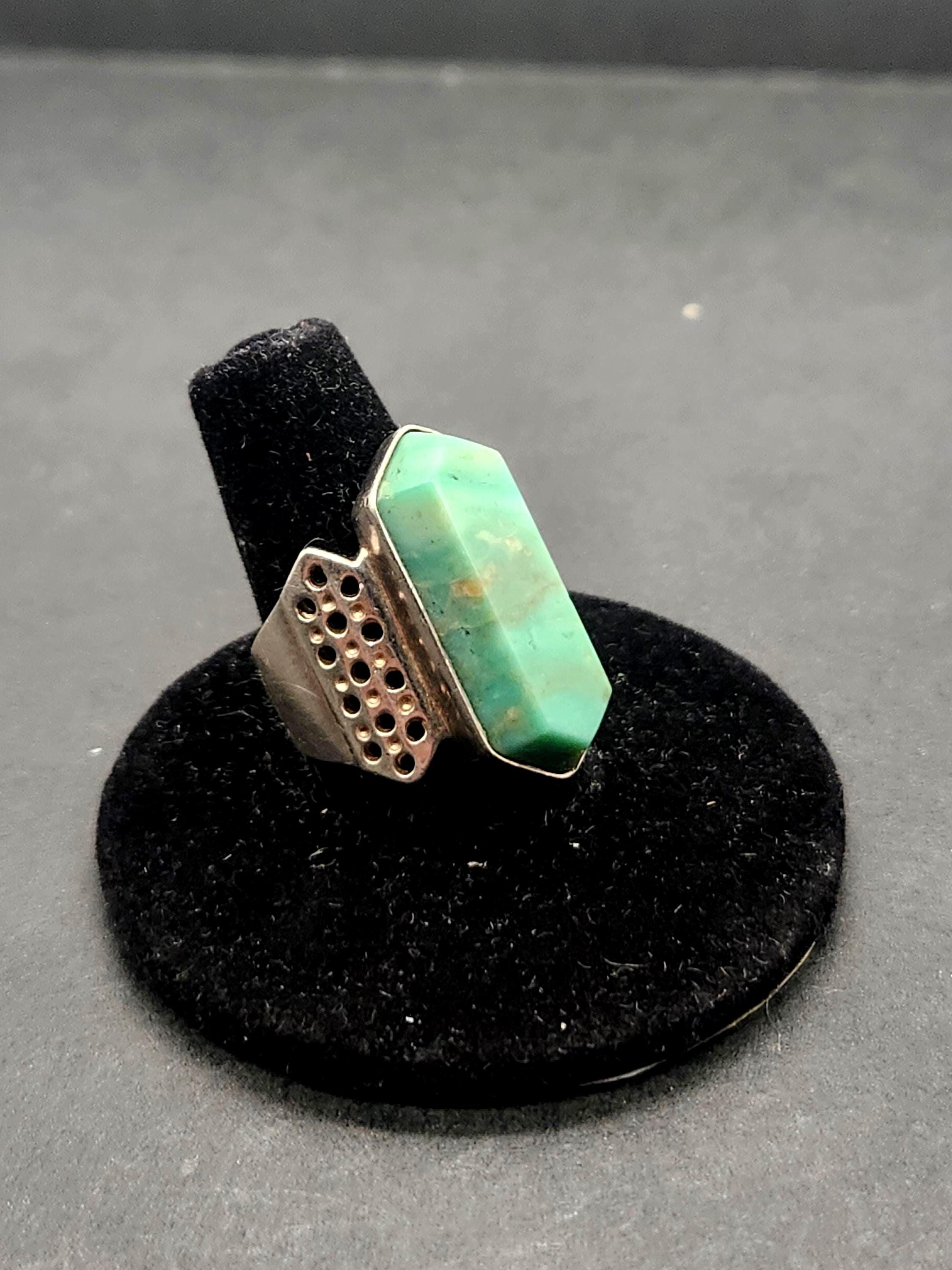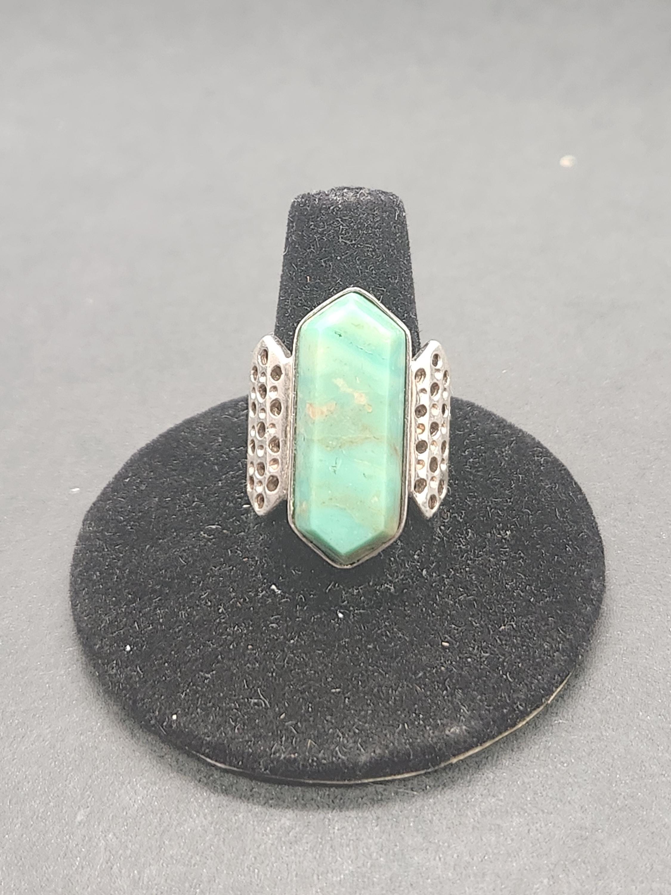 Discover a piece of wearable art with this stunning vintage Jay King Mines Desert Rose Trading Co (DRT) sterling silver ring. This exquisite piece features a captivating long hexagon-shaped turquoise stone, renowned for its natural veining that tells a unique story within each swirl and line. The craftsmanship of Jay King, a name synonymous with quality and natural stone jewelry, truly shines through.