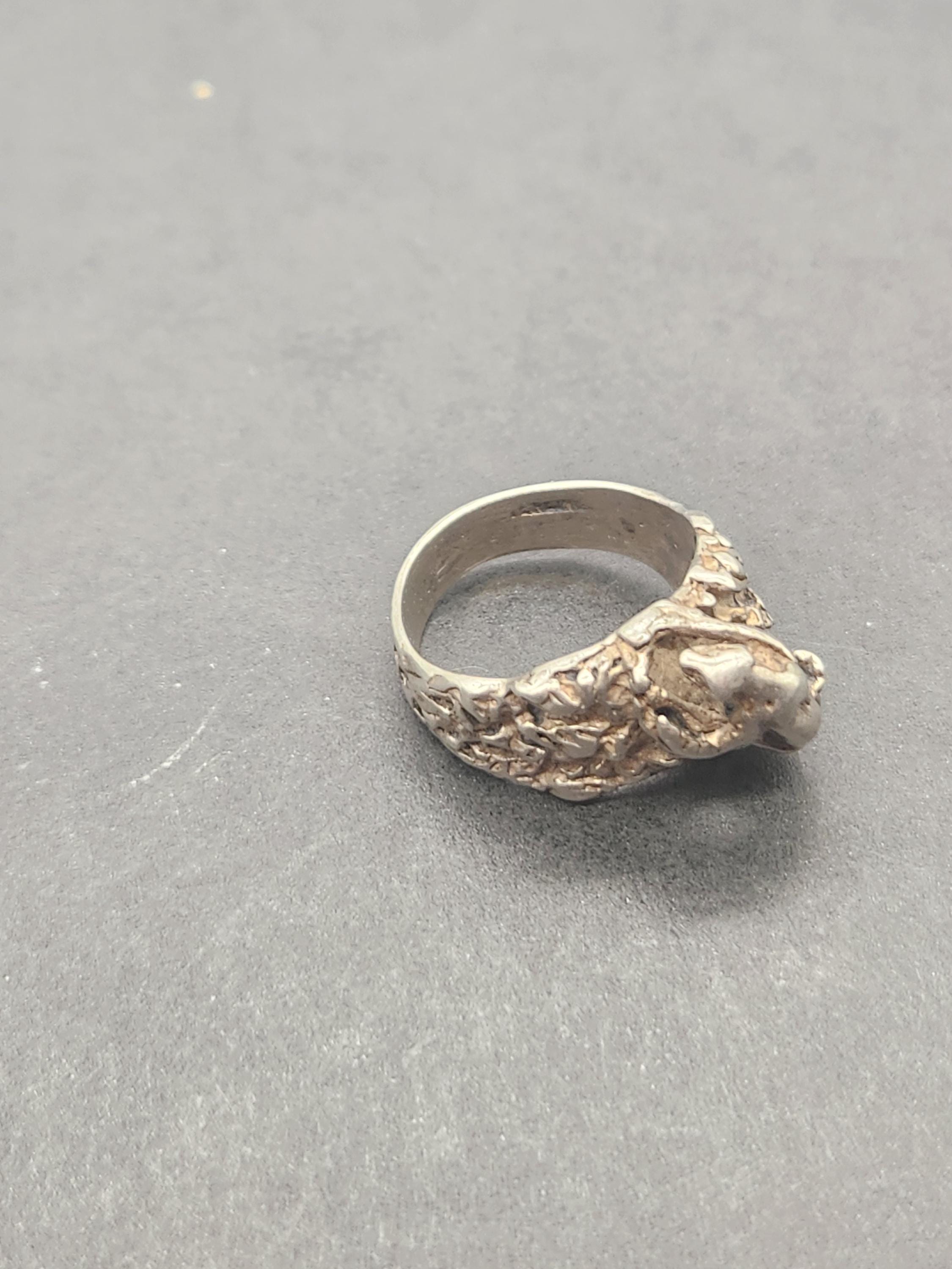 This magnificent ring is clearly marked 'Sterling,' assuring its quality and authenticity, and weighs a substantial 7.7 grams, giving it a luxurious feel on the finger. It is a US size 7.5, perfect for those who appreciate unique, large-scale jewelry that makes a statement. Whether you're a lover of big cats, vintage aesthetics, or simply seeking a distinctive accessory, this panther ring is an exceptional find.