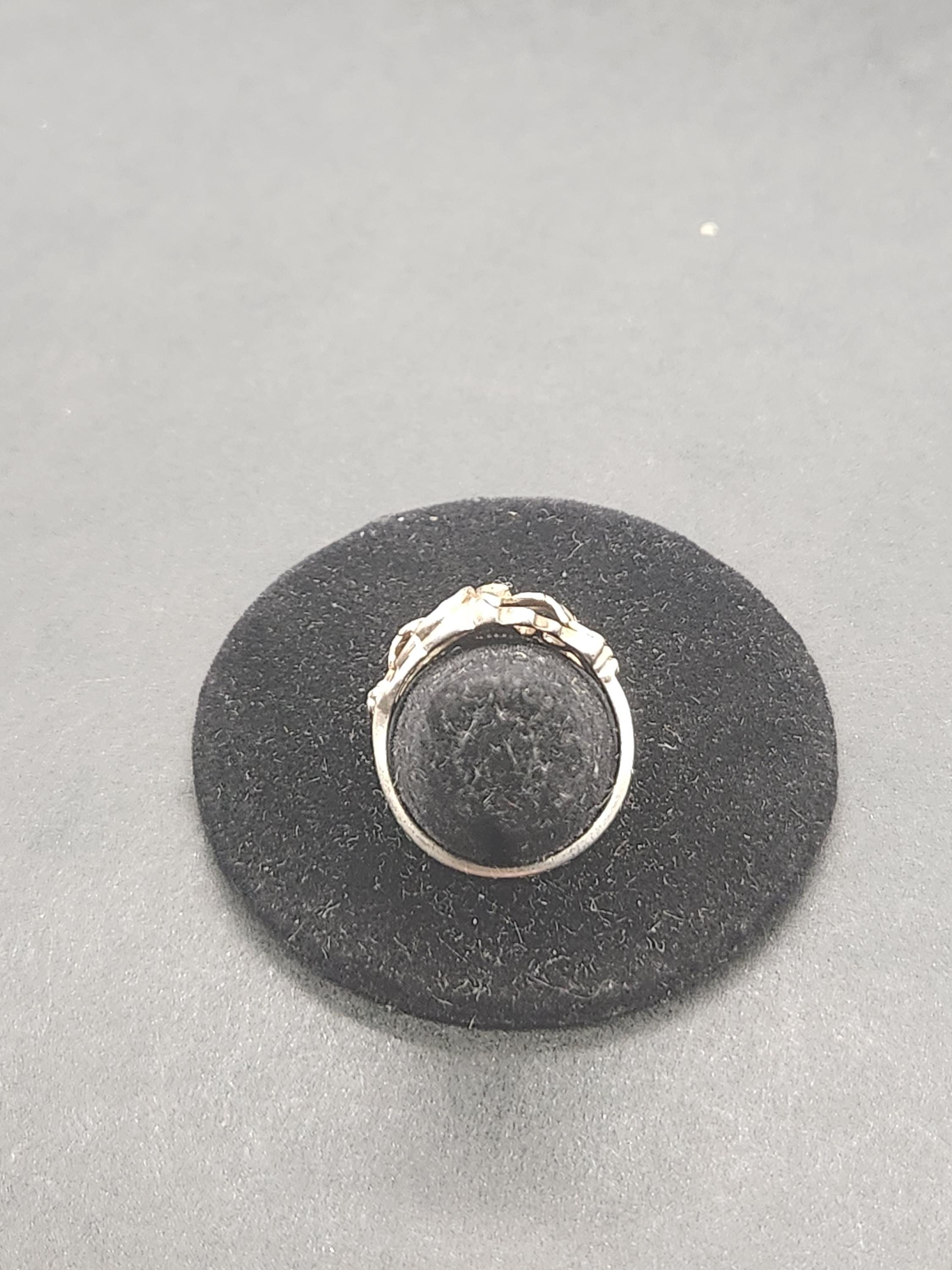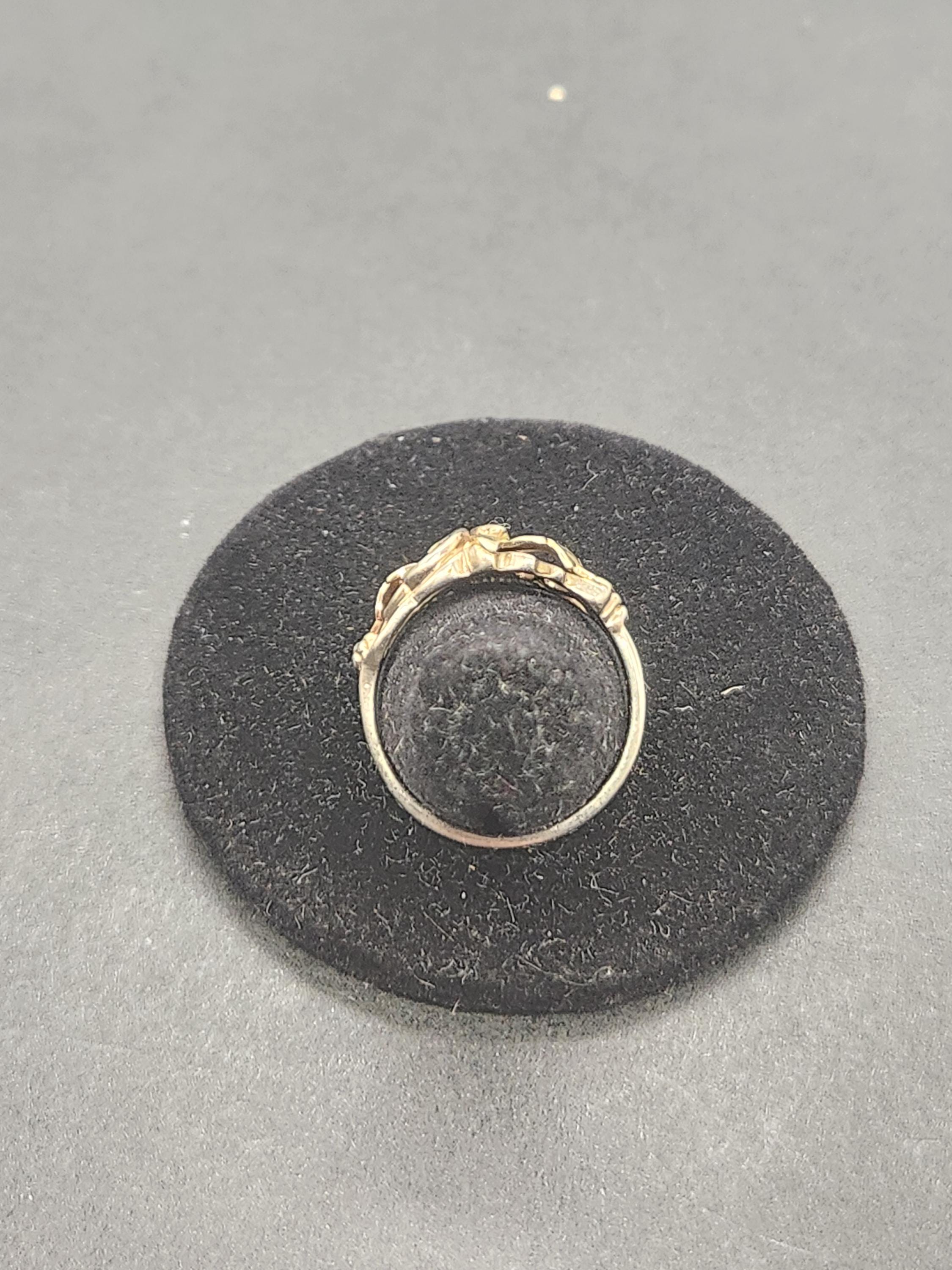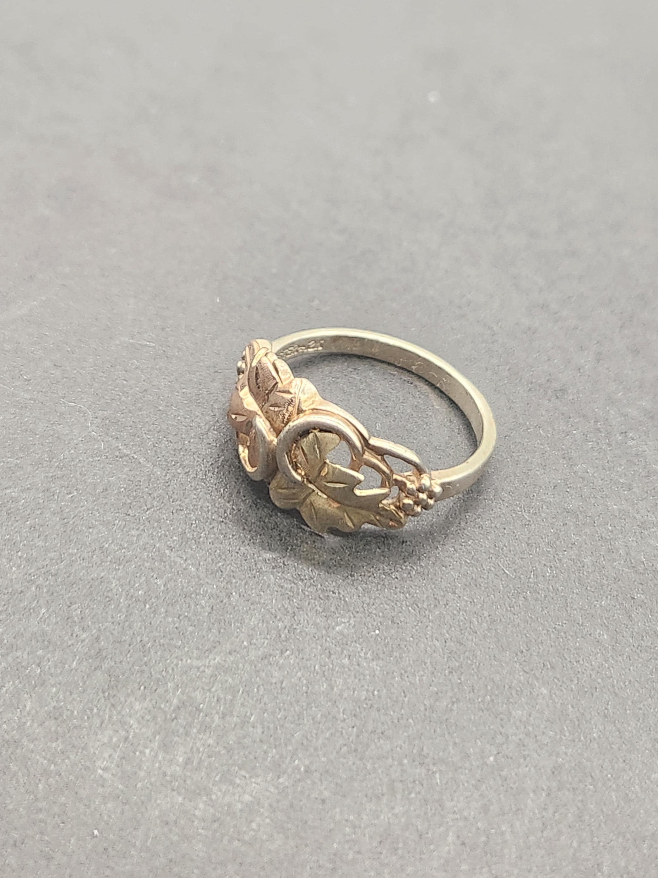 Perfect for those who appreciate unique, nature-inspired jewelry, this ring is marked 'Sterling 12K,' assuring its quality and authenticity. With a comfortable size 7.5 and a total weight of 3.09 grams, it's designed for everyday wear or as a special accent for any occasion. The delicate design makes it a versatile addition to any jewelry collection, offering a touch of vintage charm and quiet luxury.