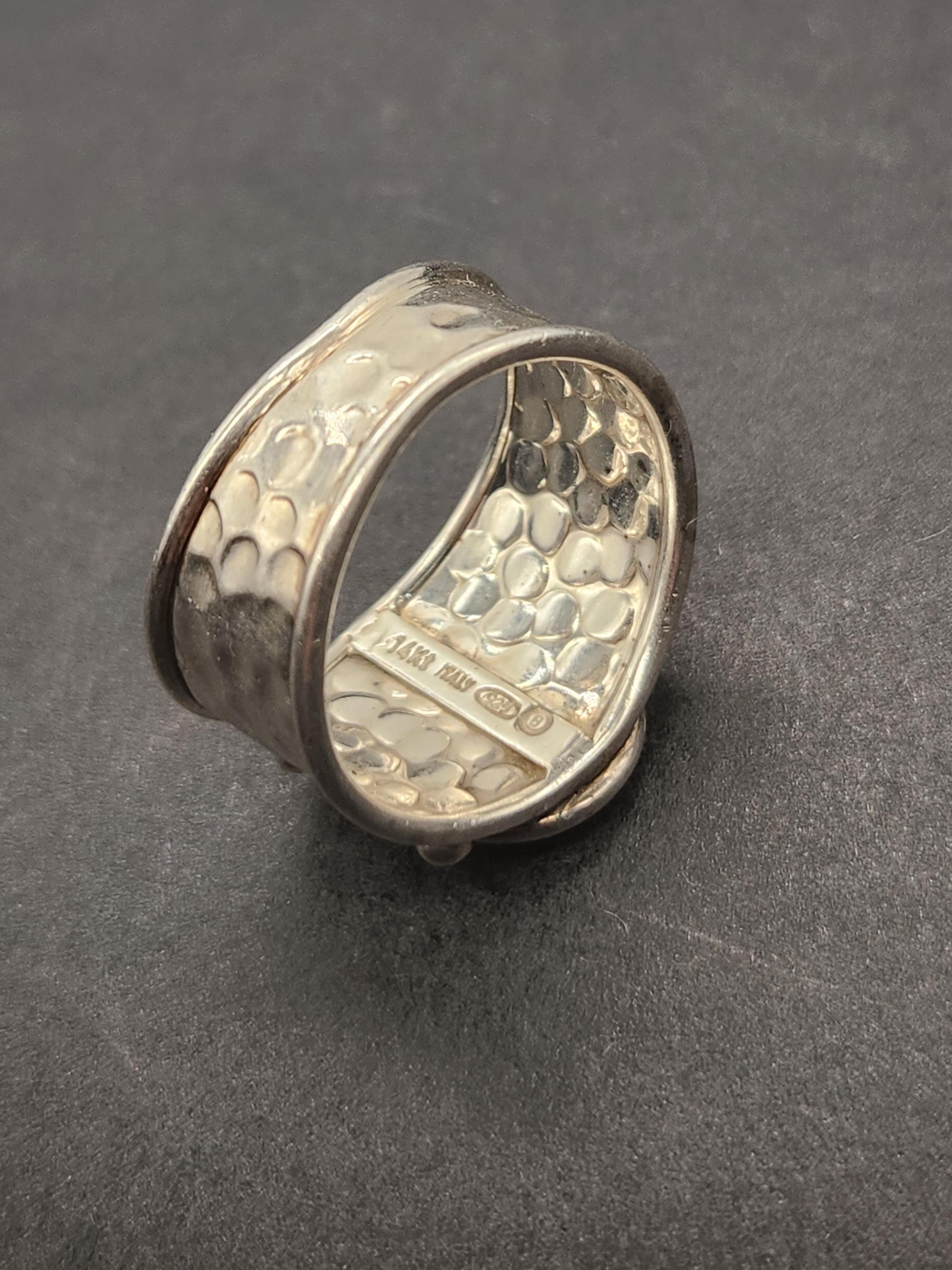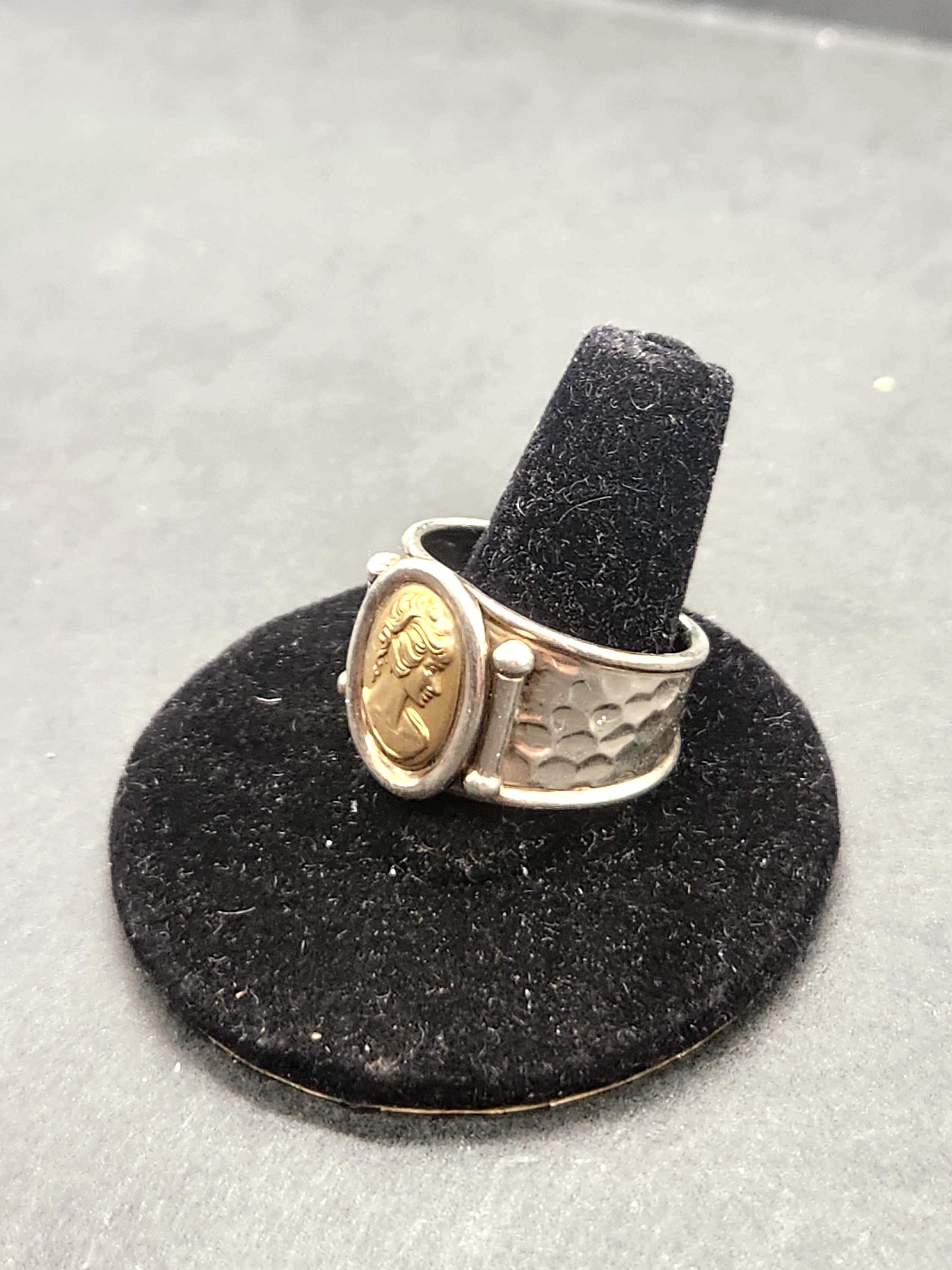 Step into timeless elegance with this exquisite Italian 14K Gold Cameo Ring, a true testament to classic craftsmanship and sophisticated design. This captivating piece features a beautifully detailed cameo, meticulously set in a unique hammered sterling silver band that adds a touch of artisanal charm and texture. The harmonious blend of precious metals, with the warm glow of 14K gold embracing the intricate cameo, creates a striking contrast against the cool luster of the sterling silver.