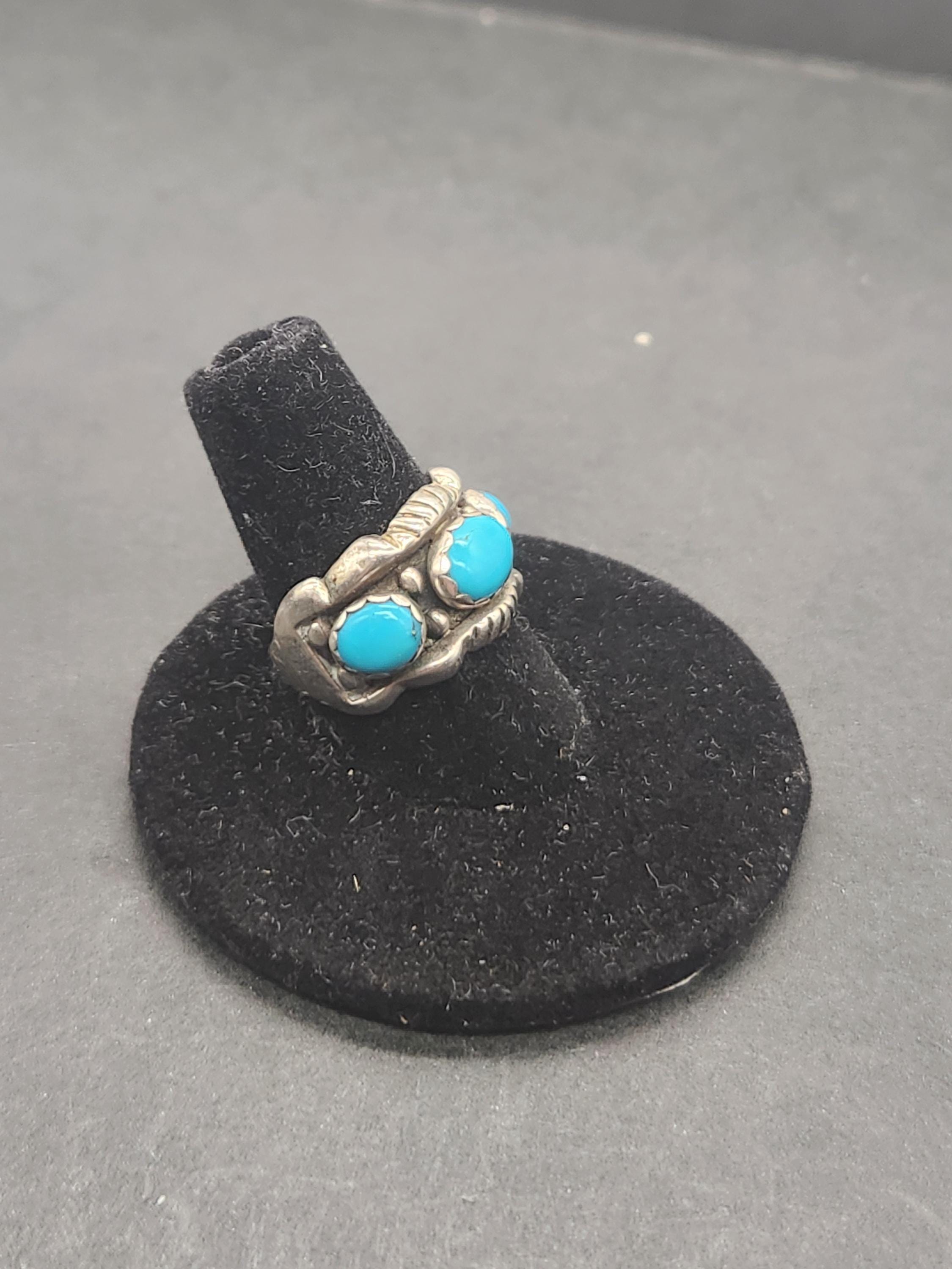 Step back in time with this exquisite Vintage 3 Stone Turquoise Sterling Silver Ring, a true testament to timeless elegance. This captivating piece showcases a classic Art Deco style, featuring three vibrant turquoise stones meticulously set in gleaming sterling silver. The ring is a size 6, offering a comfortable fit for many, and boasts a substantial weight of 5.2 grams, ensuring a quality feel and lasting durability. Each turquoise stone radiates a unique charm, evoking the serene beauty of the Southwest and adding a pop of natural color to any ensemble.