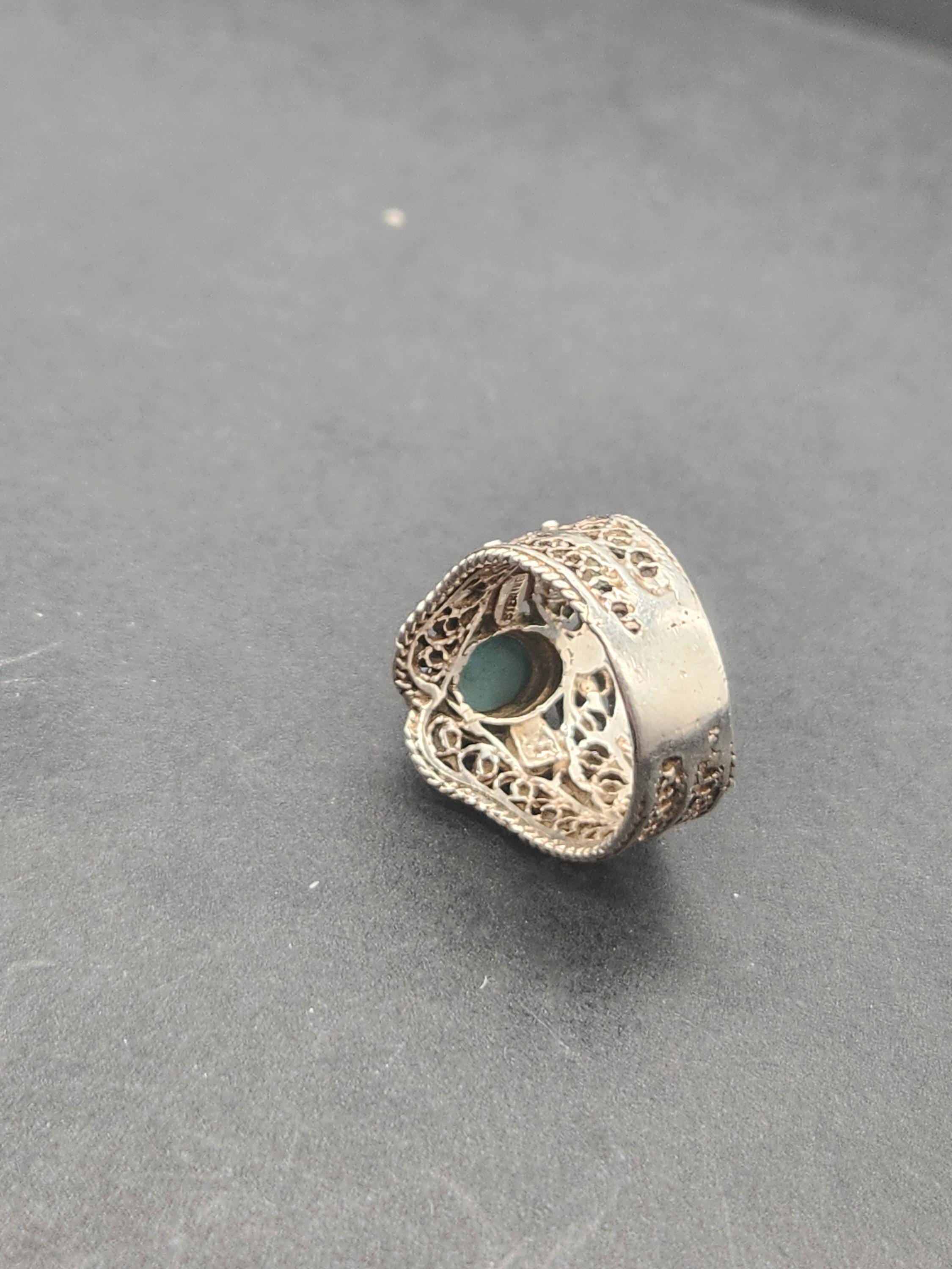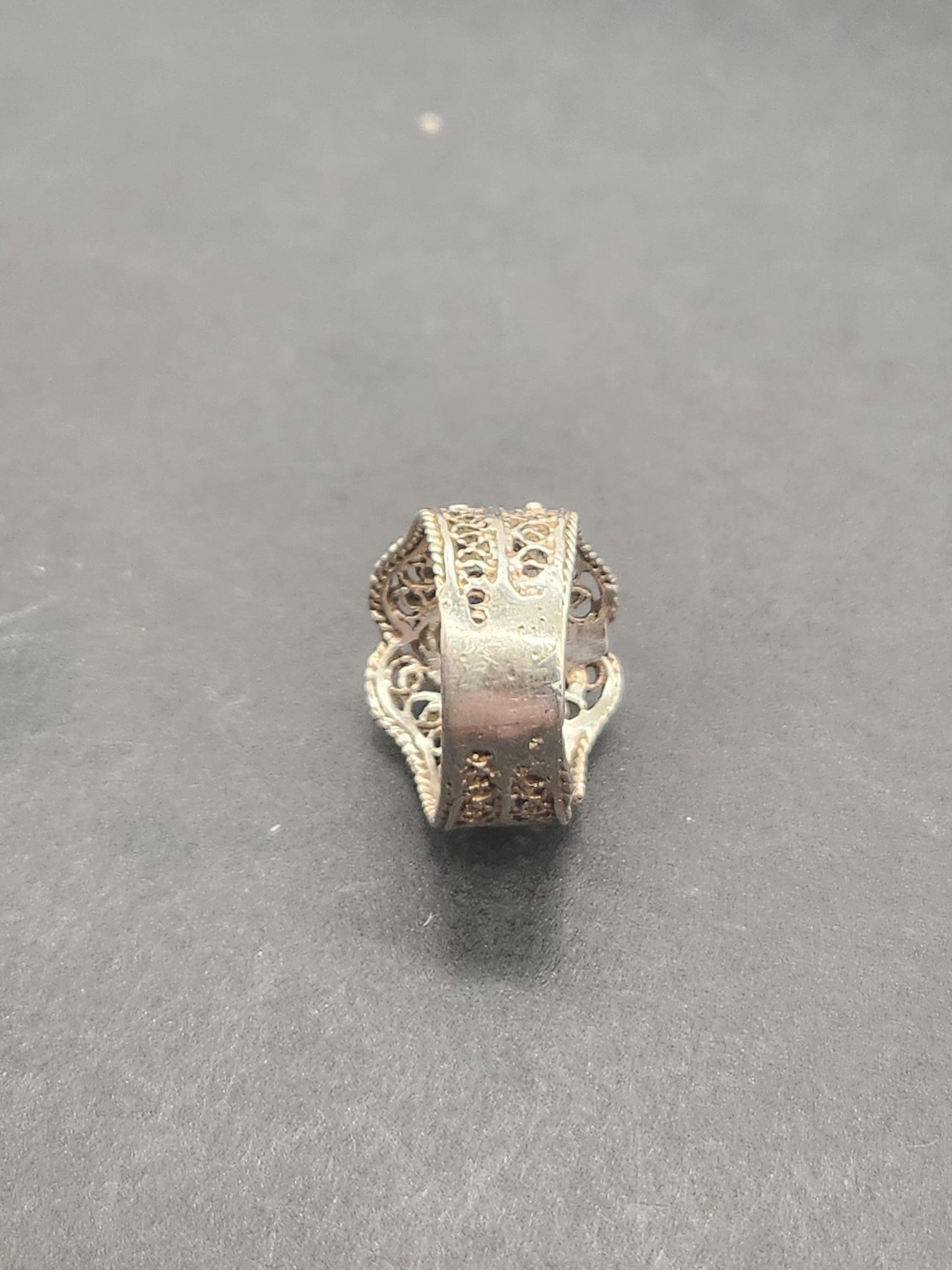 This unique ring is a comfortable Size 7, making it a perfect fit for many, and boasts a substantial weight of 5.6 grams, indicating its quality and durability. Each delicate swirl and pattern in the filigree has been meticulously crafted, showcasing the skill of Italian artisans. Whether you're a connoisseur of vintage jewelry, a lover of unique statement pieces, or simply seeking a distinguished accessory, this ring promises to add a touch of historical elegance and color to any ensemble.