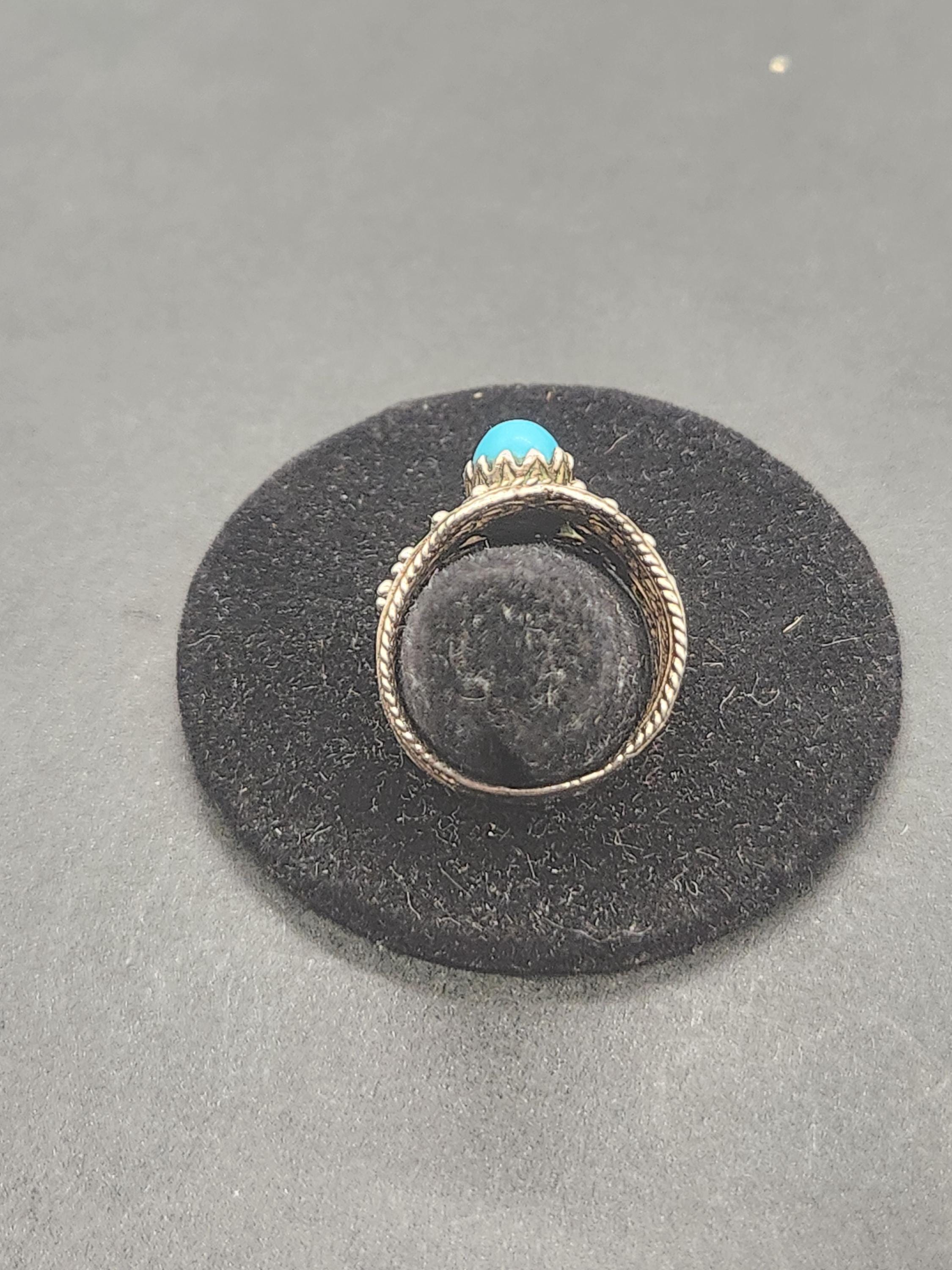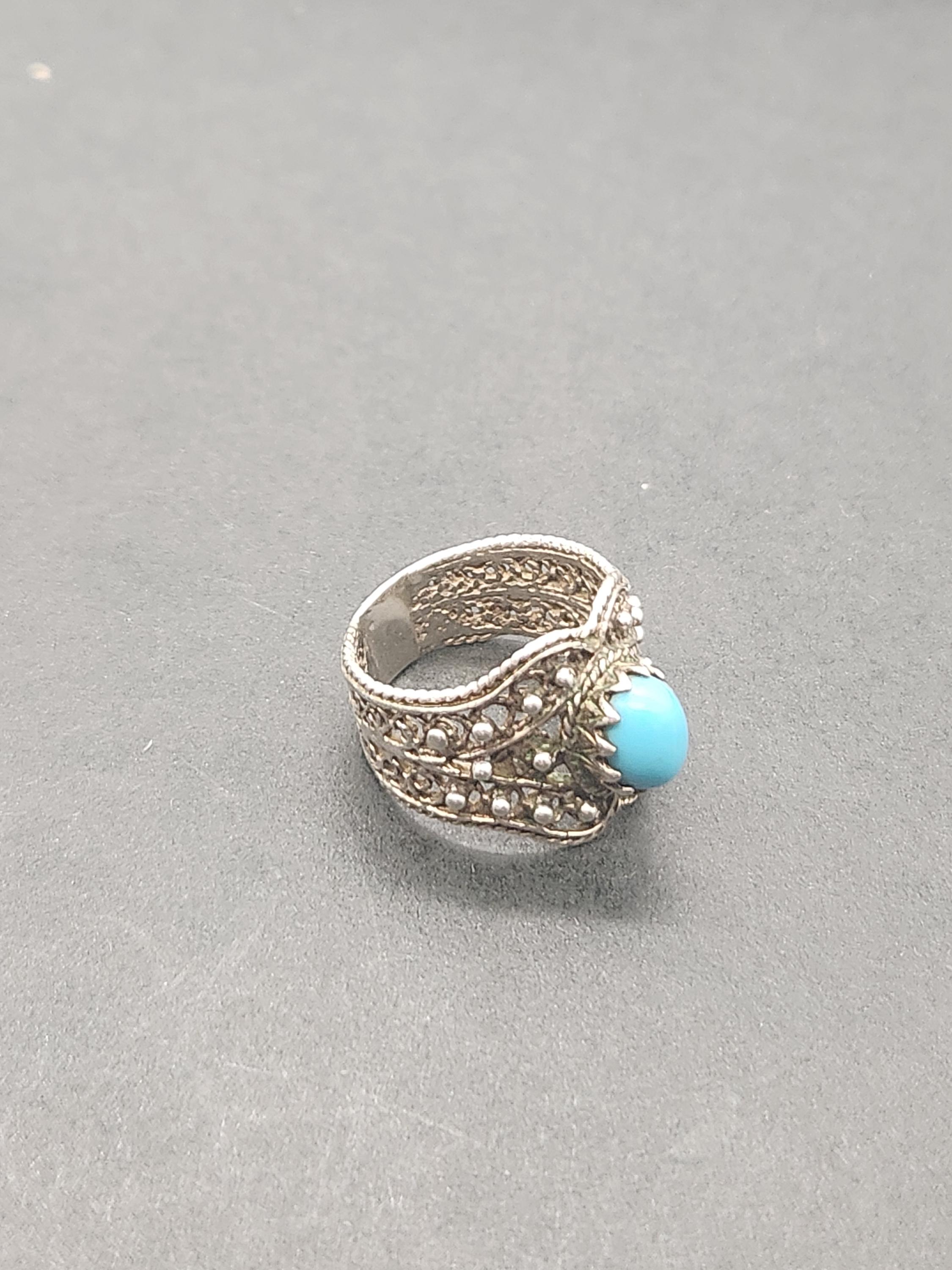 Step back in time with this exquisite Vintage Italian Sterling Silver Etruscan Filigree Turquoise Band Ring, a true testament to timeless craftsmanship. This stunning piece captures the essence of ancient artistry with its intricate filigree work, reminiscent of the Etruscan period, beautifully rendered in lustrous sterling silver. The focal point is a captivating turquoise gemstone, known for its vibrant blue-green hues and grounding energy, securely set within the detailed band.