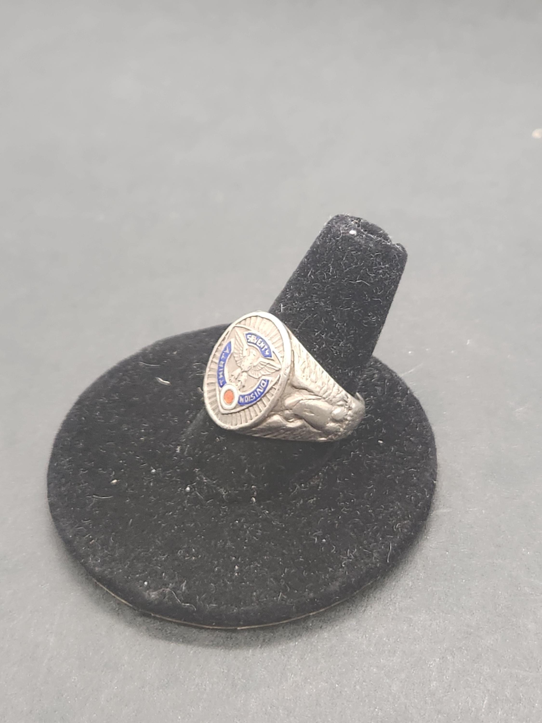 Crafted from genuine sterling silver, this ring features intricate enameling that brings the iconic "Ohio Buckeye Division" insignia to life. The design includes distinctive eagle motifs and is attributed to Grouse Co., a mark of quality and historical authenticity. This particular ring is a size 6, making it a unique find for collectors or as a very special gift. Its scarcity makes it a prized addition to any collection of military artifacts or historical jewelry.