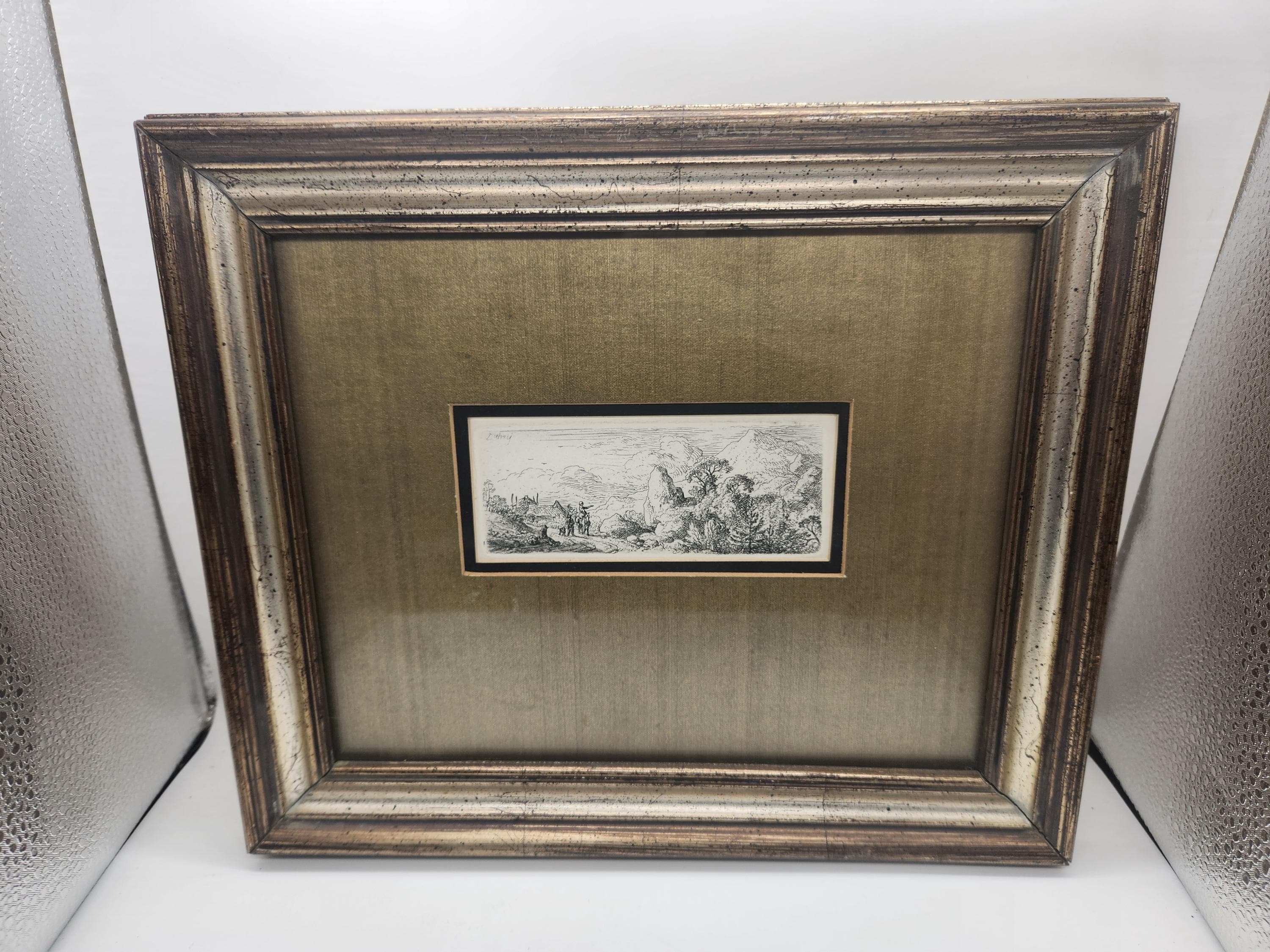 The etching itself measures approximately 5 inches wide by 2 inches tall, a delicate and detailed composition that draws the eye. It comes beautifully presented in a modern 12 inch by 10 inch frame, which perfectly complements and protects the vintage artwork while allowing it to seamlessly integrate into contemporary decor. This piece is not just an artwork; it's a conversation starter, a window into another era, and a sophisticated addition to any art collection.