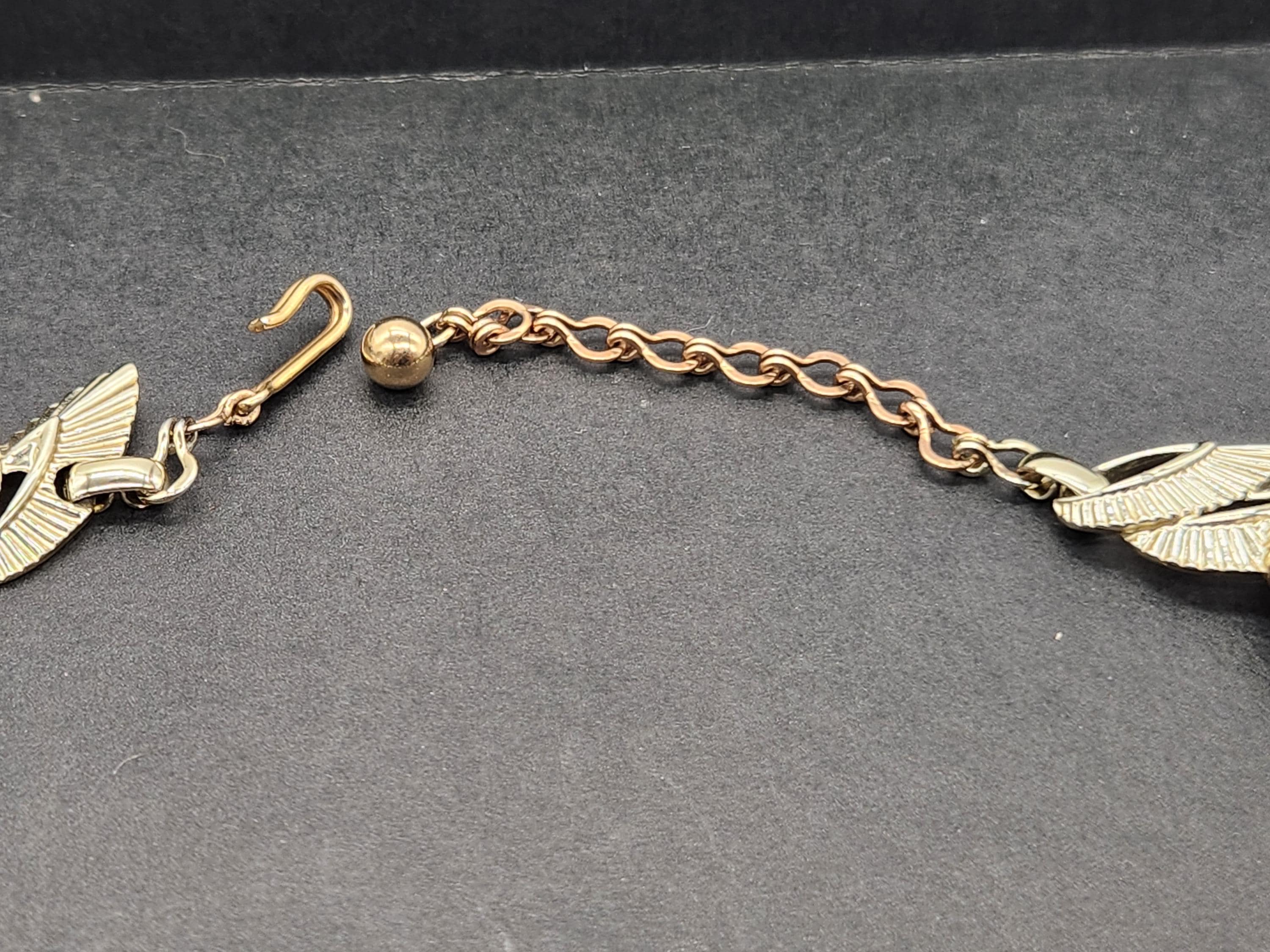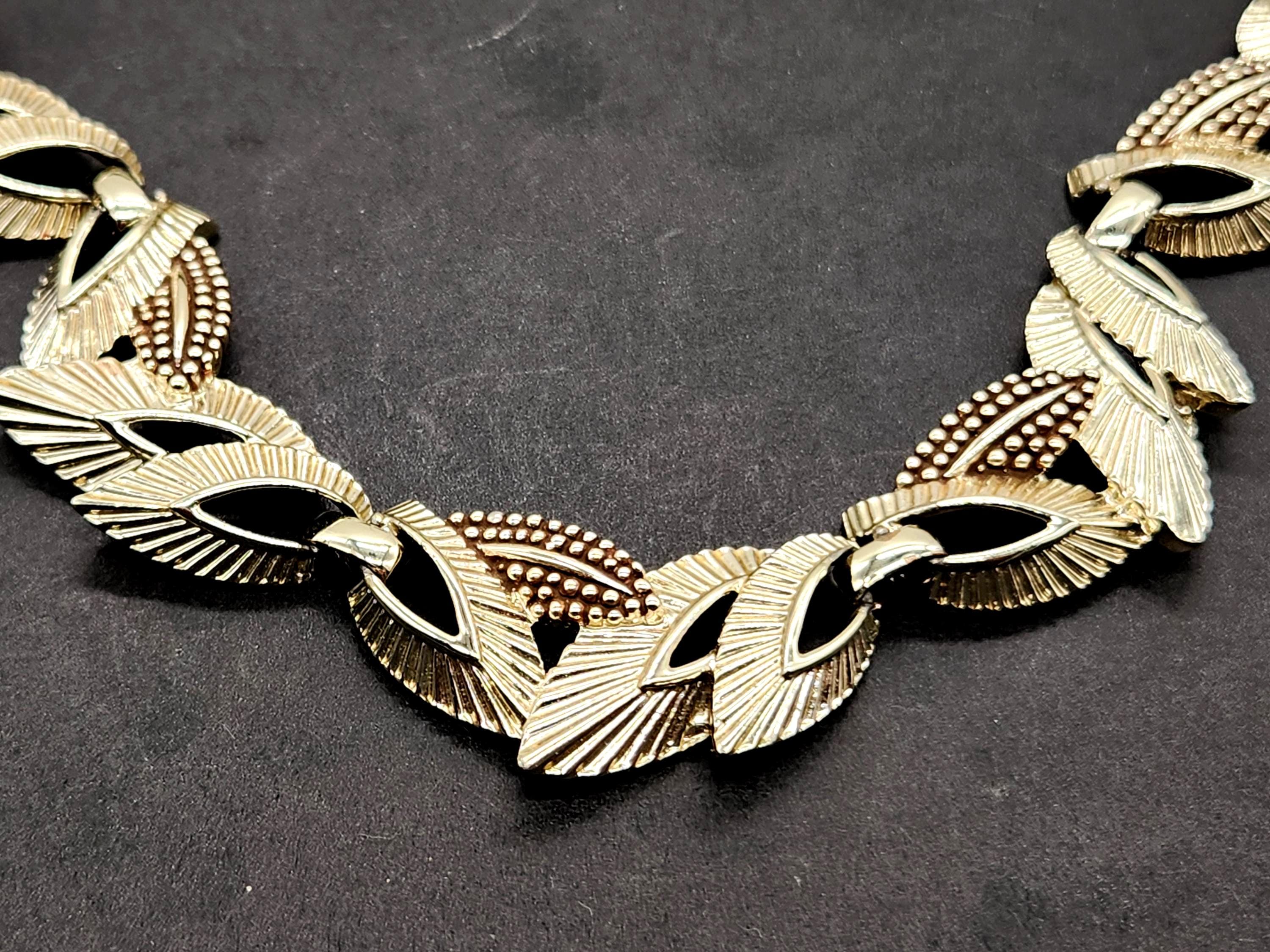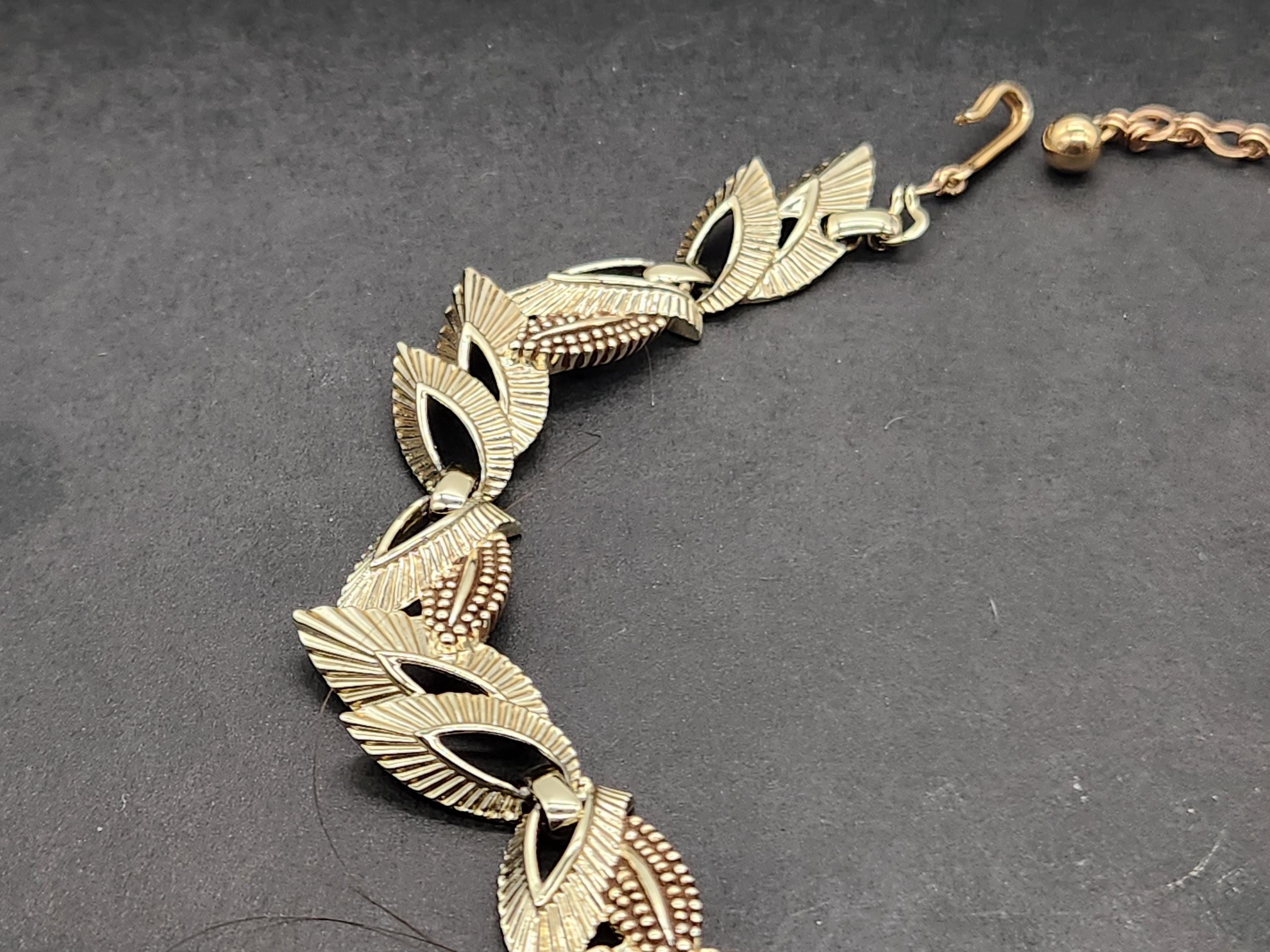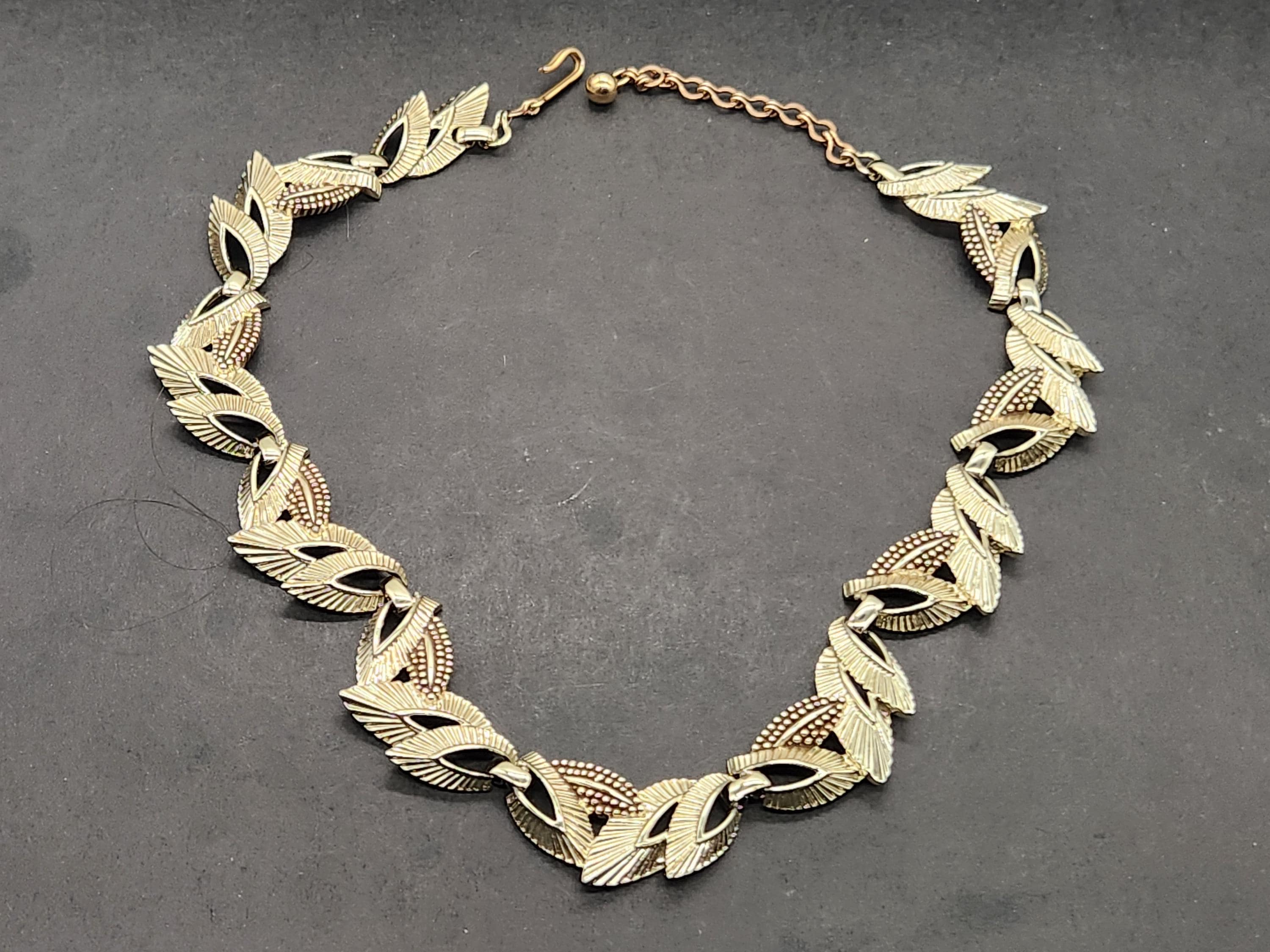 Step back in time with this exquisite Vintage 1950s Marboux by Marcel Boucher 814 Leaves Necklace, a true testament to mid-century elegance. This stunning piece features intricate leaf designs, meticulously crafted to capture the beauty of nature. Measuring a perfect 18 inches in length, it drapes gracefully around the neck, making a sophisticated statement.