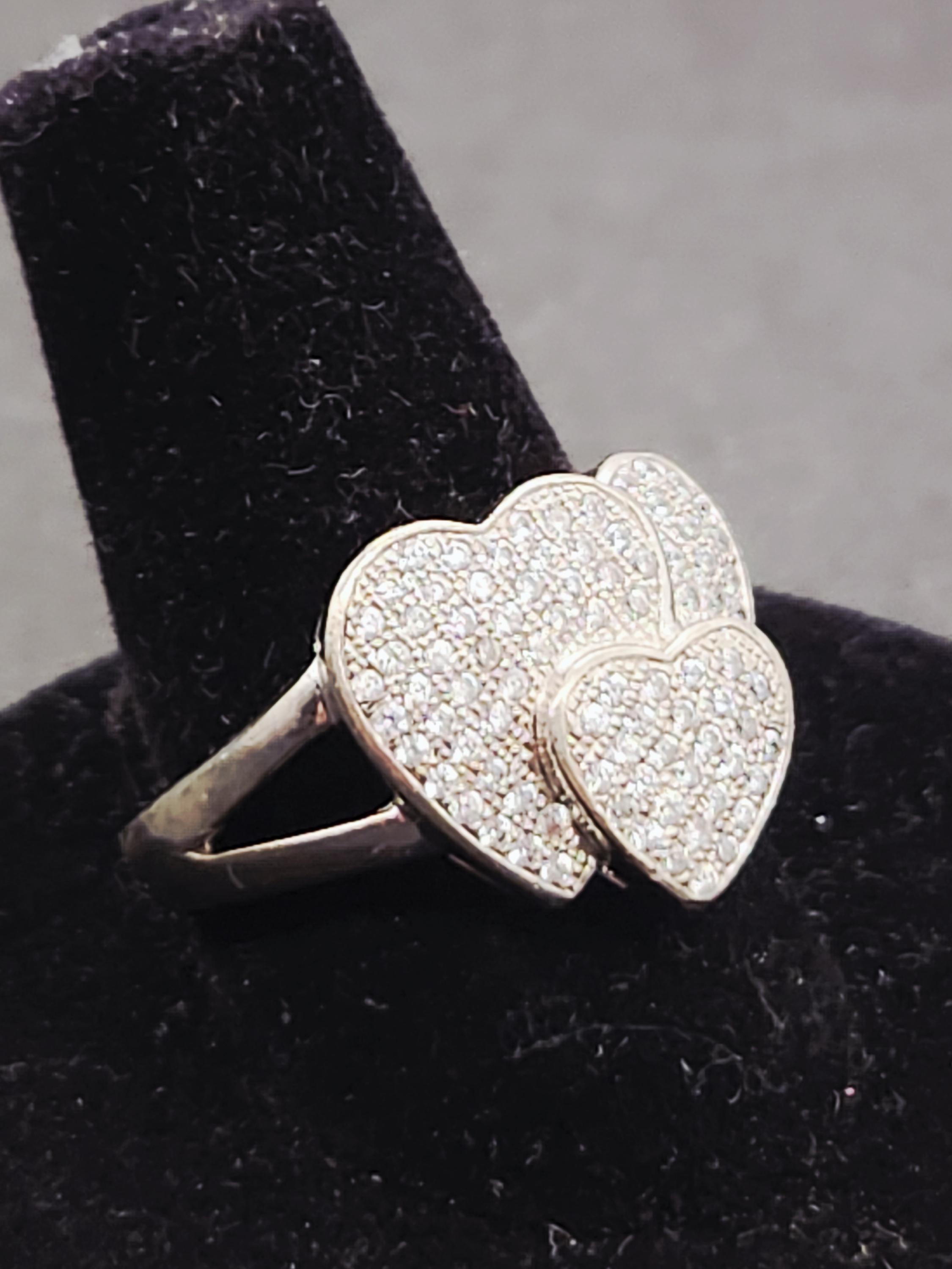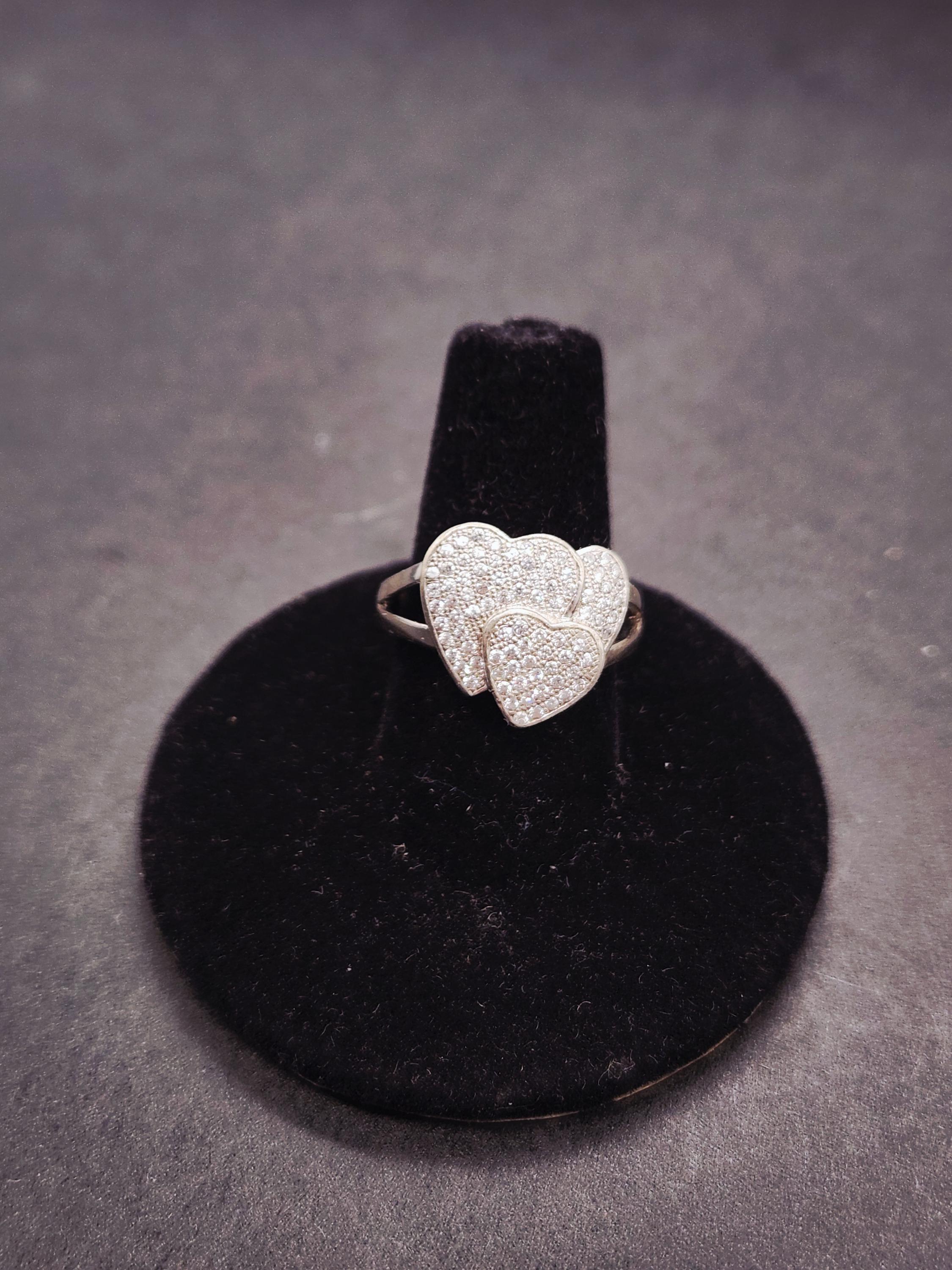 Celebrate love and elegance with our exquisite Sterling Silver Triple Heart CZ Cluster Ring. This captivating piece, weighing 4.44 grams, features a stunning arrangement of three intertwined hearts, each meticulously adorned with brilliant cubic zirconia stones. Crafted from genuine sterling silver, this ring offers both durability and a timeless shine, making it perfect for everyday wear or special occasions.