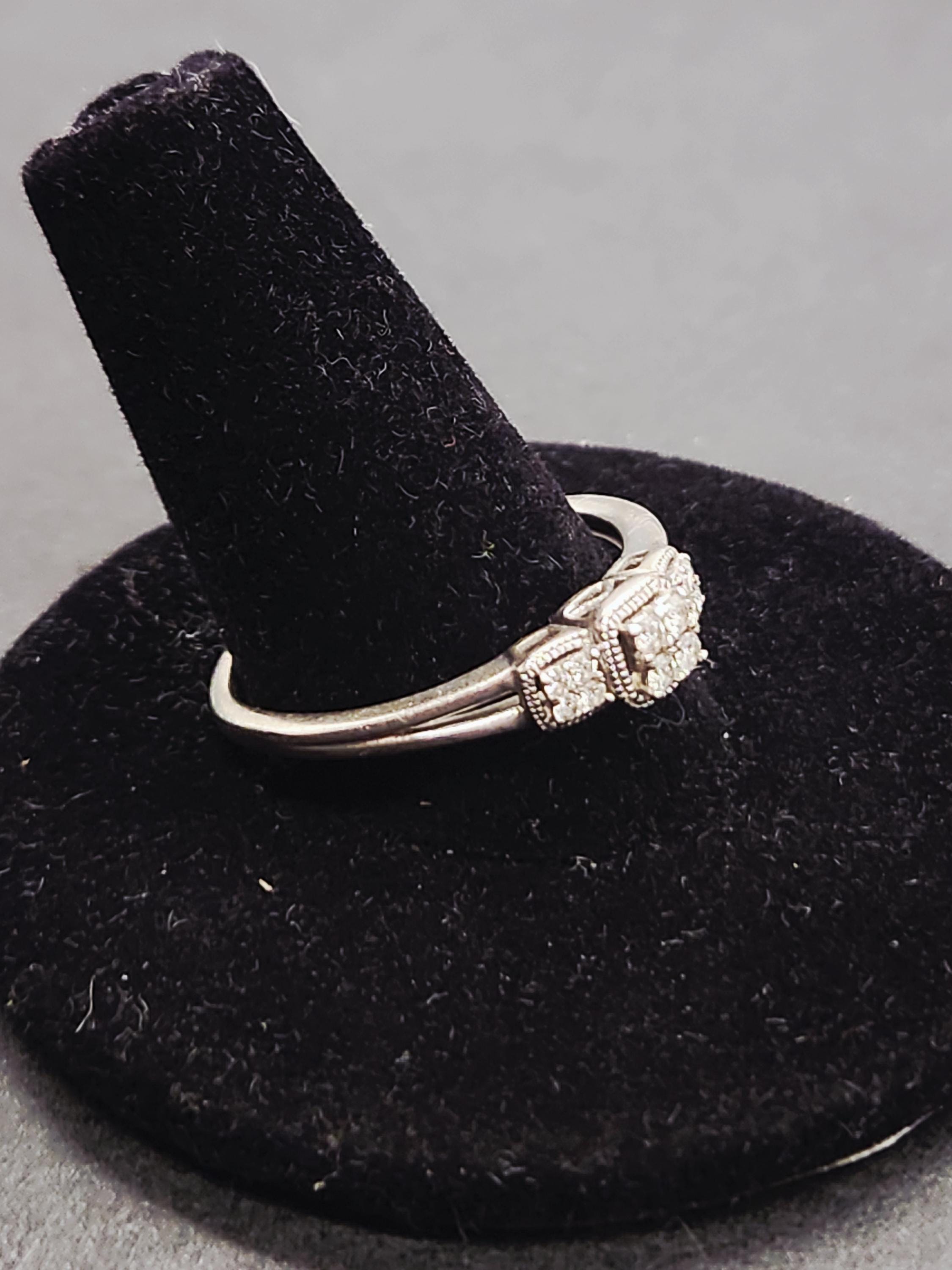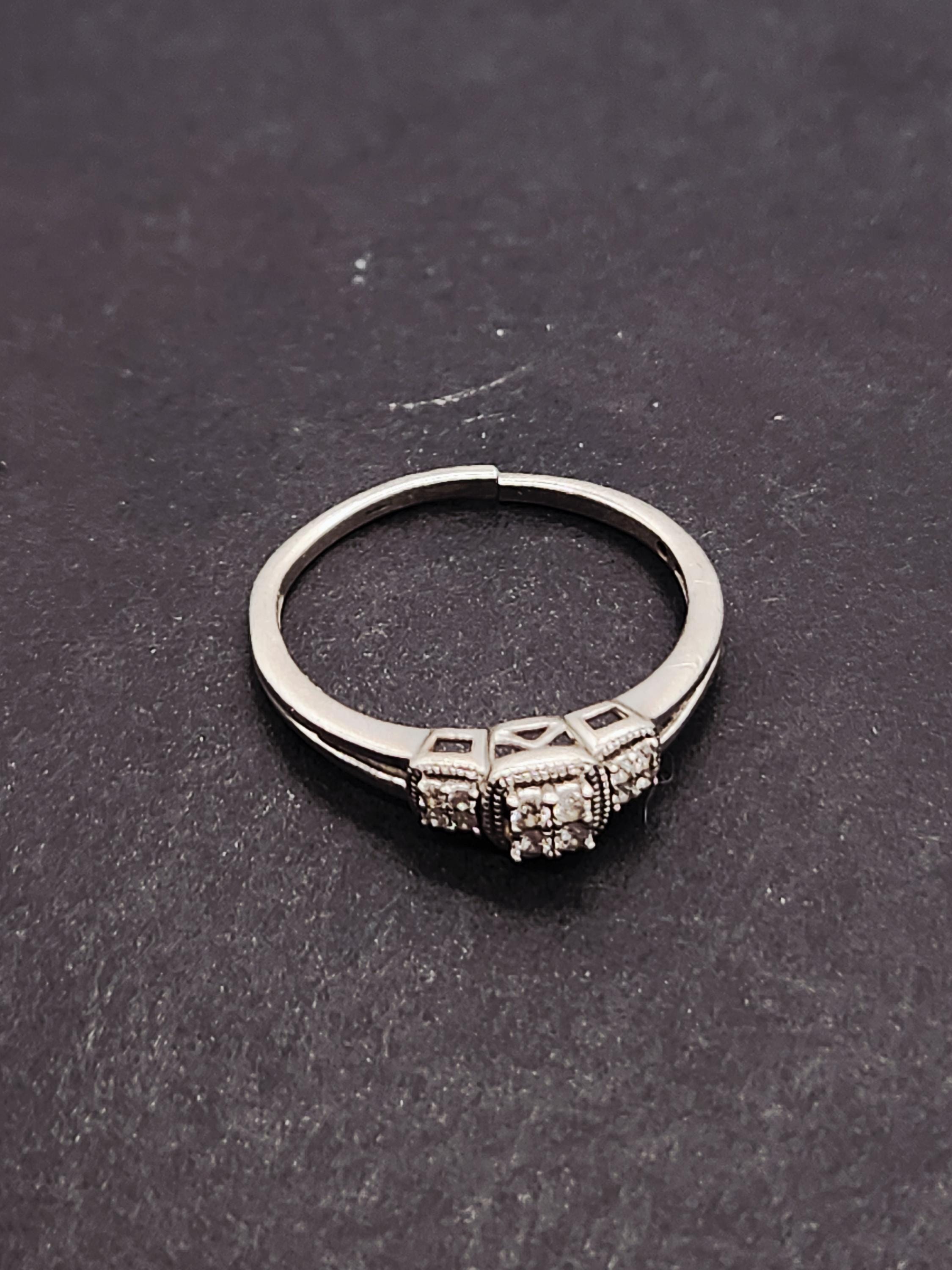 Celebrate your cherished moments and promises with this exquisite Cherished Promise Collection Diamond Three Stone Cluster Ring. Crafted from radiant sterling silver, this captivating piece features a dazzling 1/8 Carat Total Carat Weight (TCW) of genuine diamonds, forming a timeless three-stone cluster design. Each diamond sparkles with brilliance, symbolizing past, present, and future, making it a perfect token of enduring love and commitment.