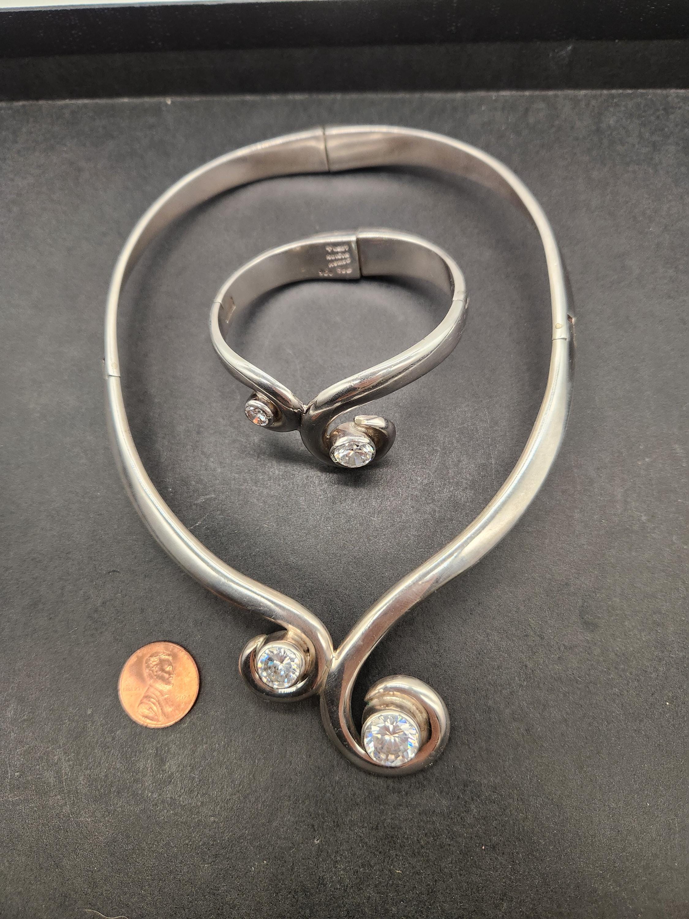 Adorn yourself with the breathtaking elegance of this Alicia De La Paz Taxco 950 Silver Necklace and Bracelet Matching Set, a true testament to exquisite craftsmanship. This stunning duo features a large round design, meticulously crafted from premium 950 silver and adorned with brilliant CZ stones that capture and reflect light with dazzling intensity. Designed to make a statement, this heavy set exudes luxury and sophistication.